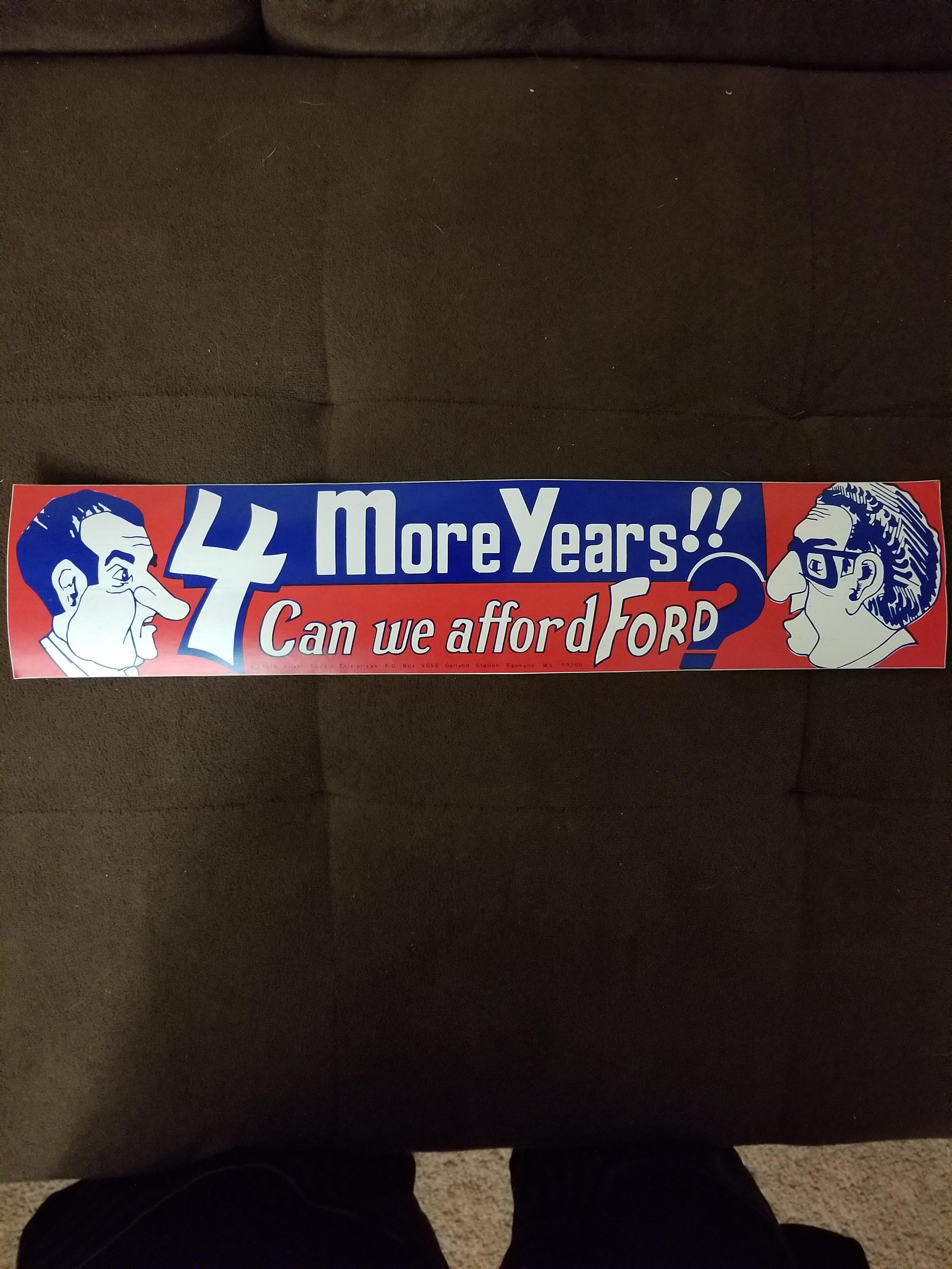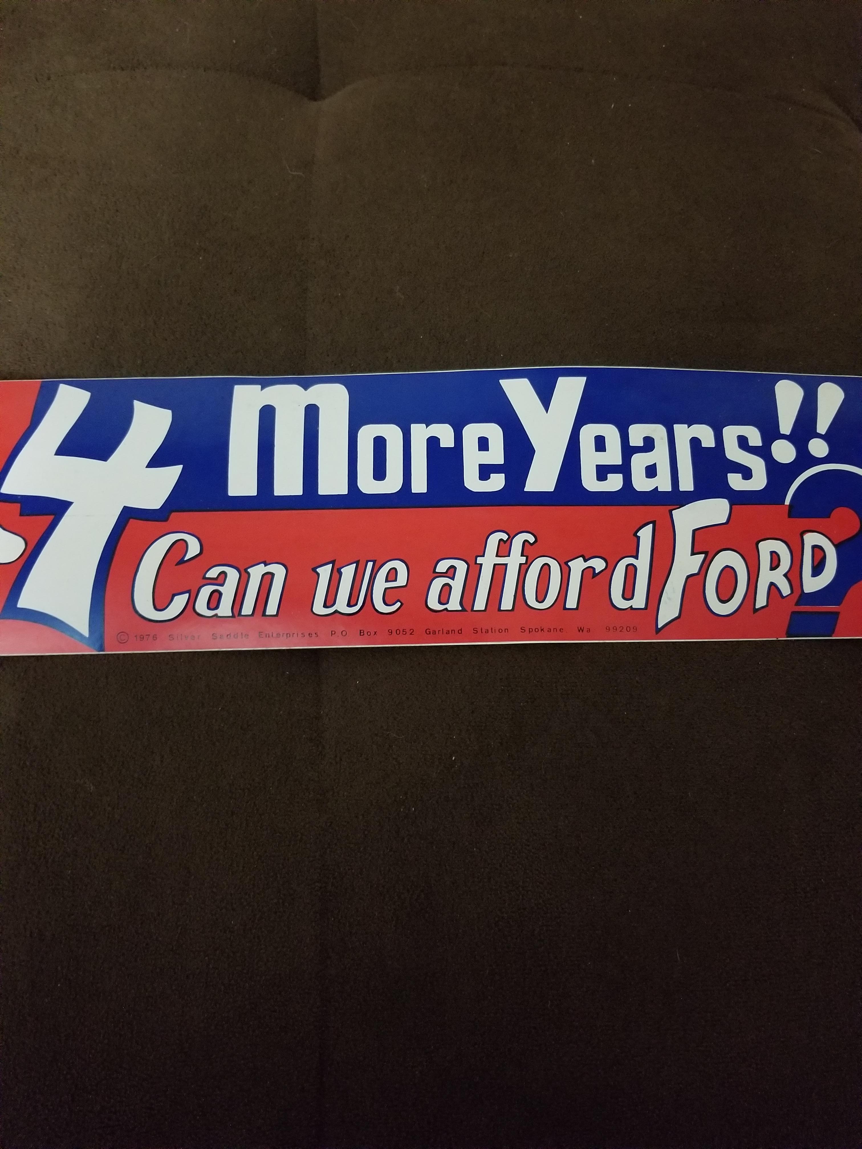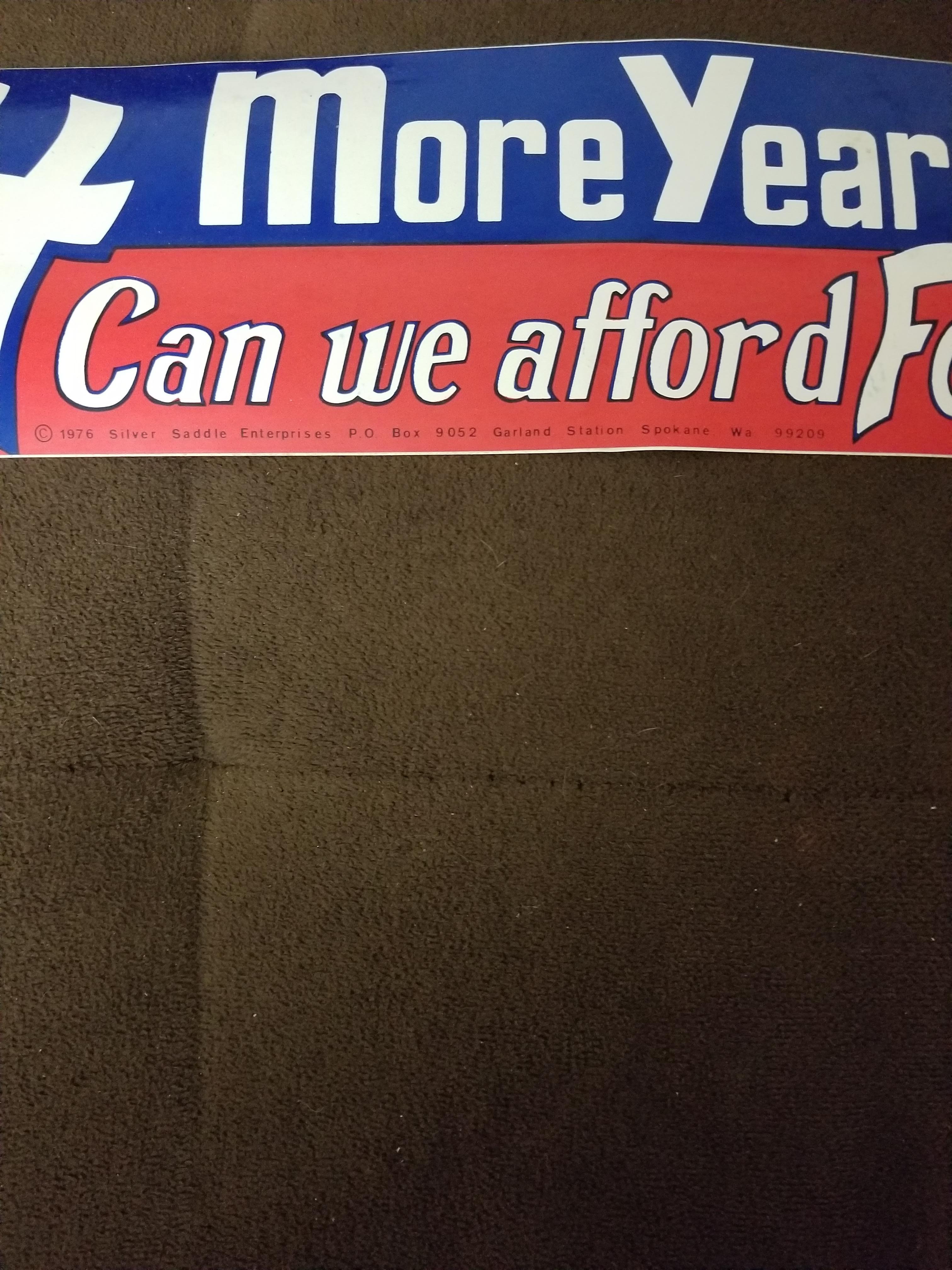Grandma passes away and found this bumper sticker that features Nixon... I've searched online for anything about it and have only come across the original copyright for it and haven't even found pictures of it. Below is the copyright from 1976 4 more years! Can we afford Ford? Ports, of Nixon 6 Kissinger, decorative lettering. Author of the print: John Stuckart. Col. serigraph; bumper sticker. © John Stuckart d.b. a. Silver Saddle Enterprises; 18flar76; K117577