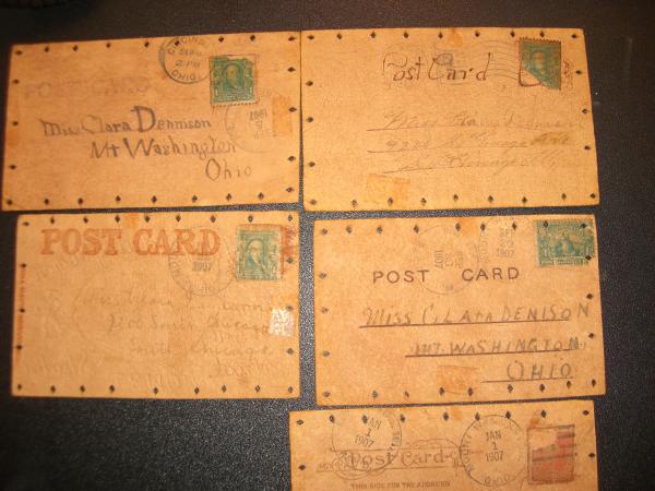 Antique leather postcards with used stamps.