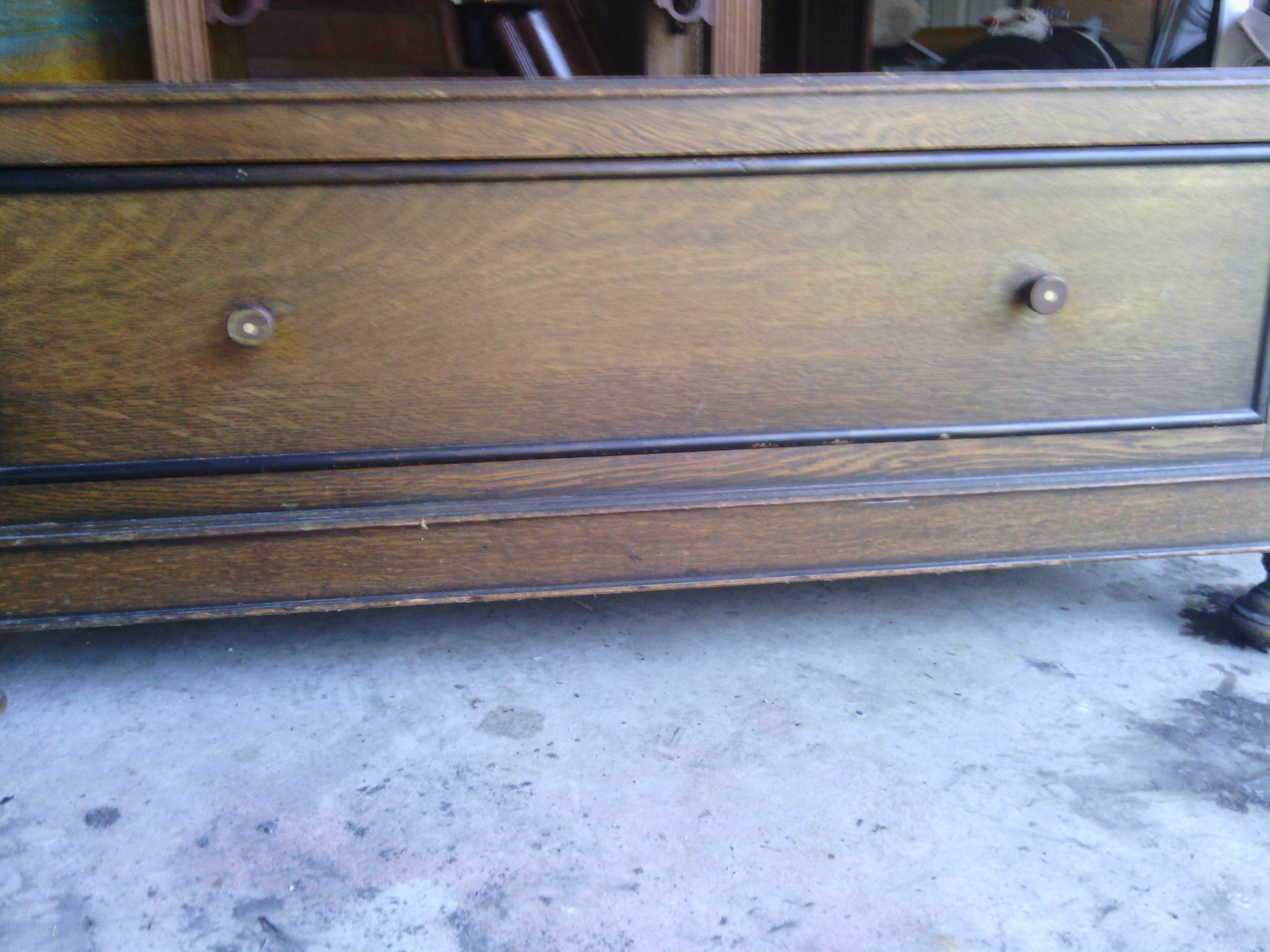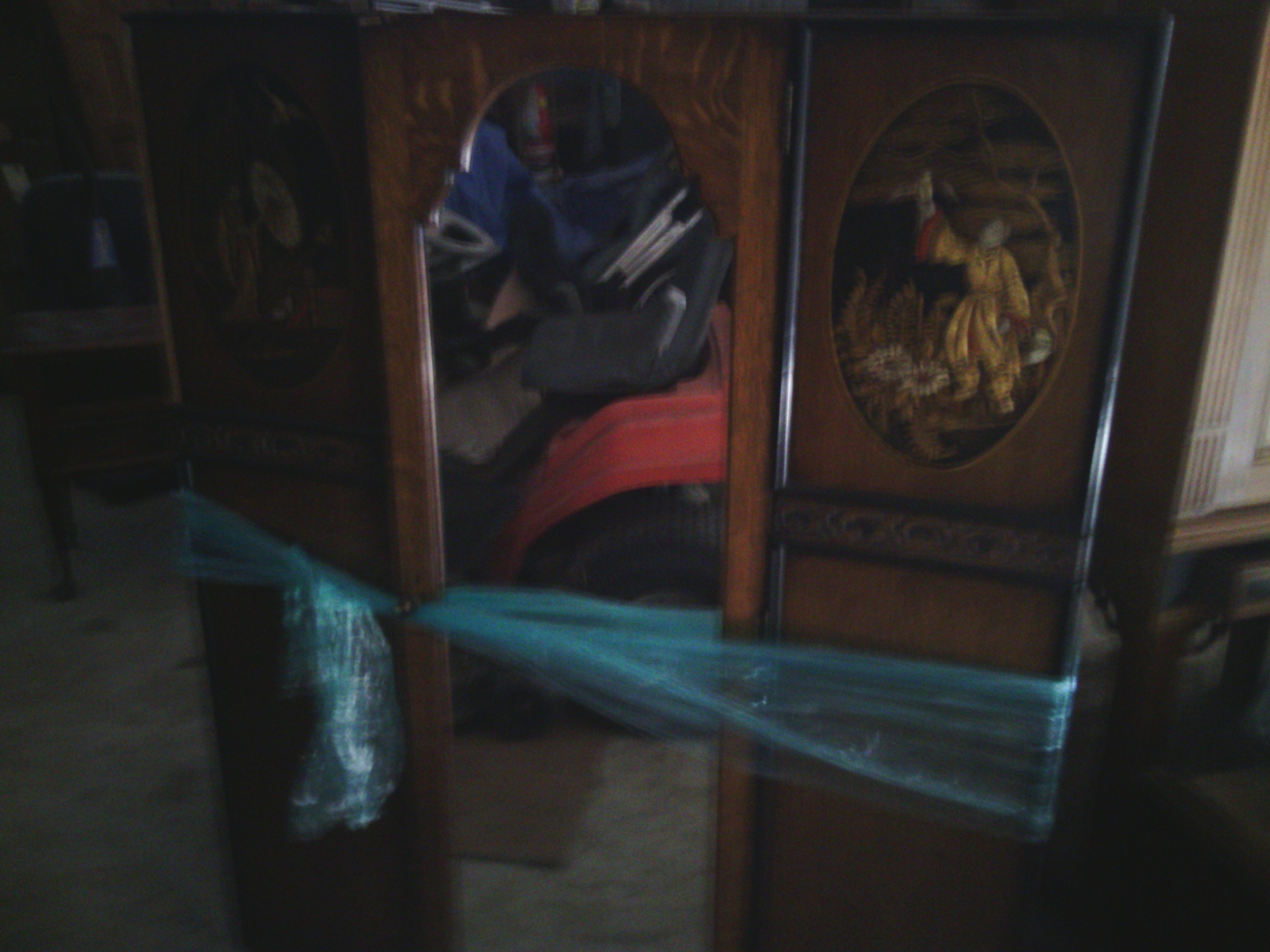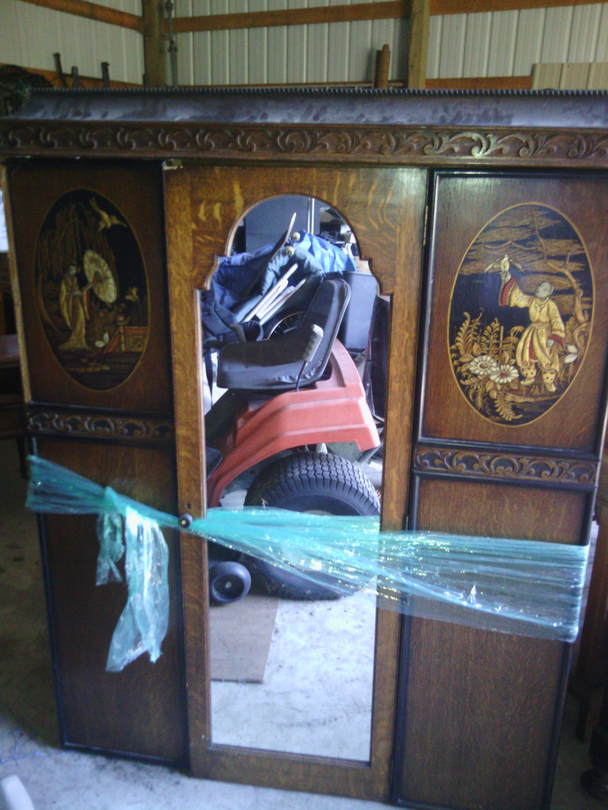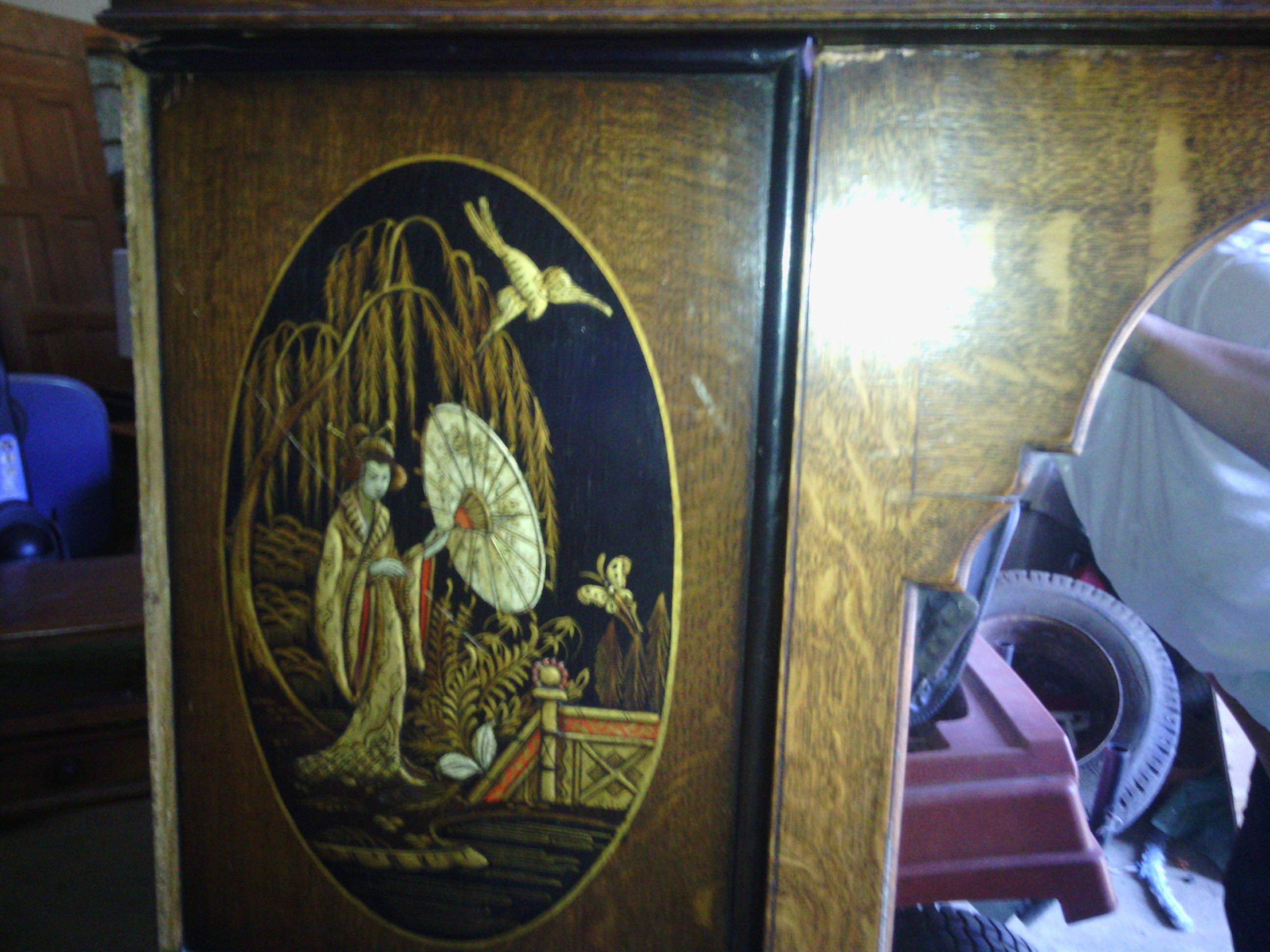 not sure the origin but its a three piece oak armoir with front mirror on door art on front and one large bottom drawer