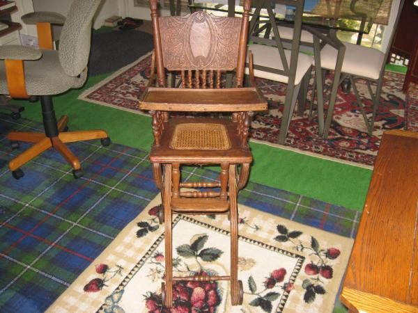Antique Oak Highchair adjustable to 2 heights and lowers to a rocker. Press back design, cane seat. Wheels on legs. Tray also with highchair, but not attached.
