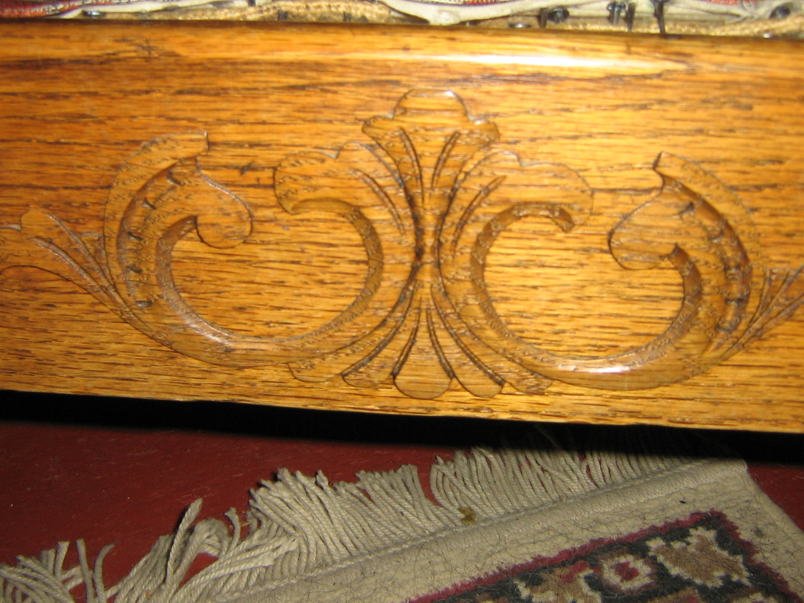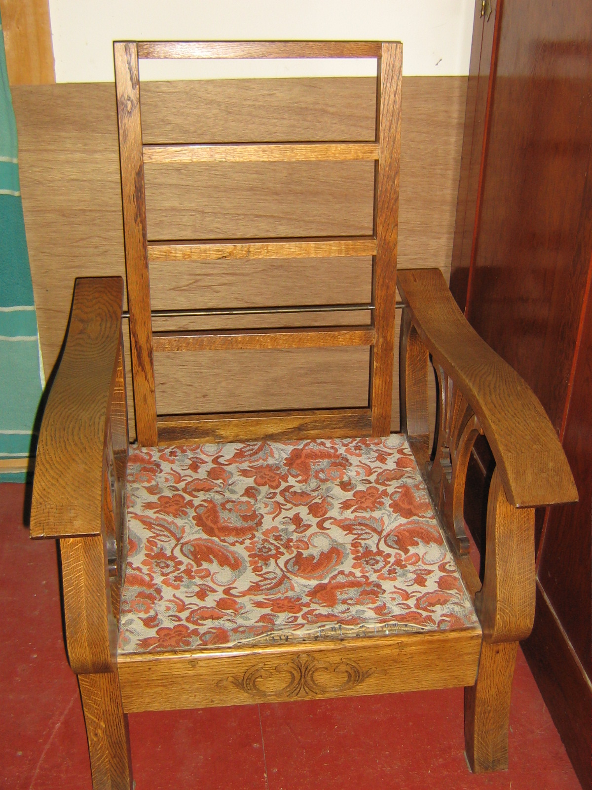 Oak Morris chair..not original cushions. The chair lives in the Yukon Territory. Apparently this chair was carried over the Chilkoot trail. No way to prove that..but interesting to think about. Good condition.