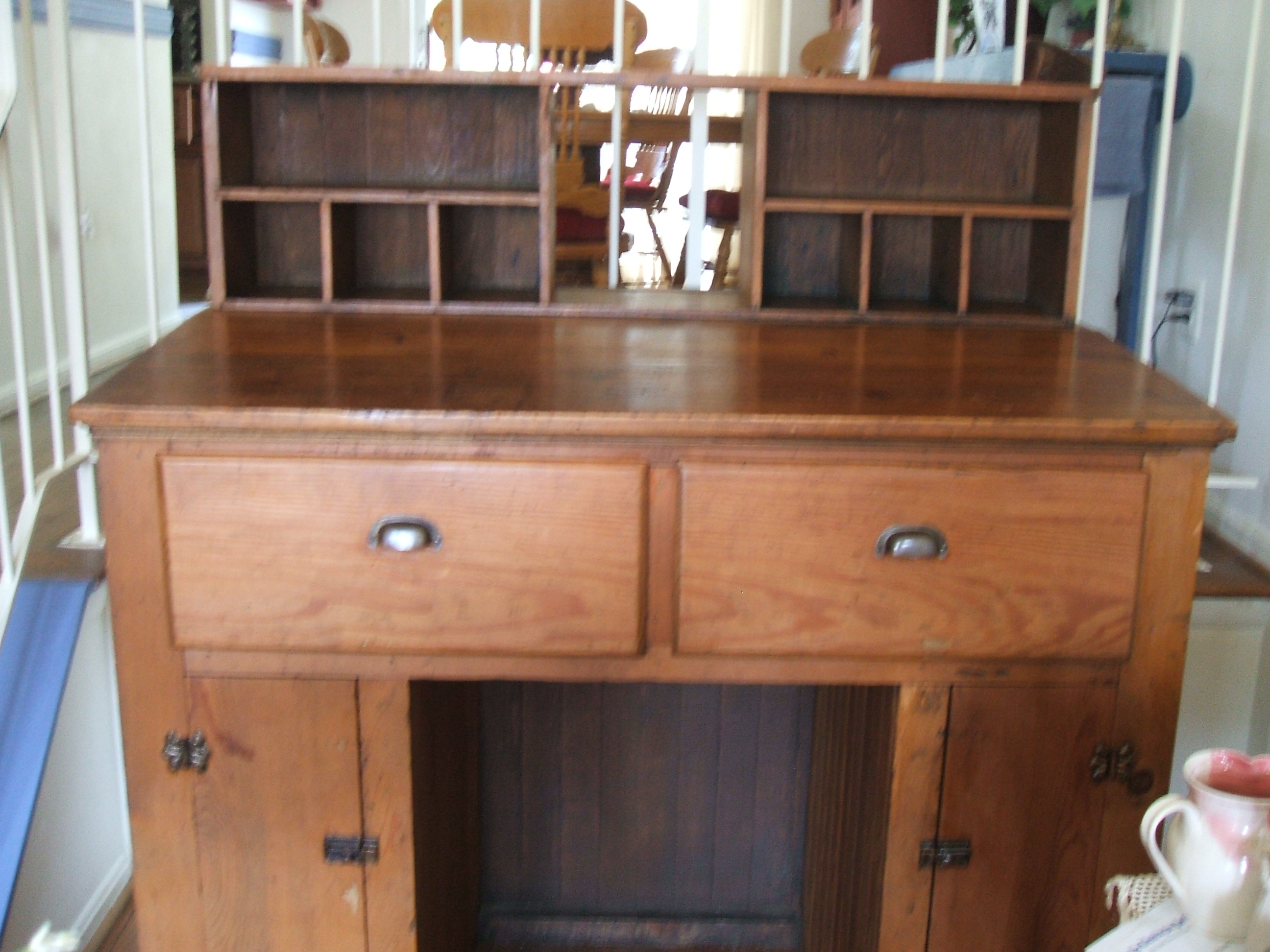 Solid oak antique post office desk with top that can be taken off. It has two very deep drawers in front and side doors that open with 2 shelves on each side.