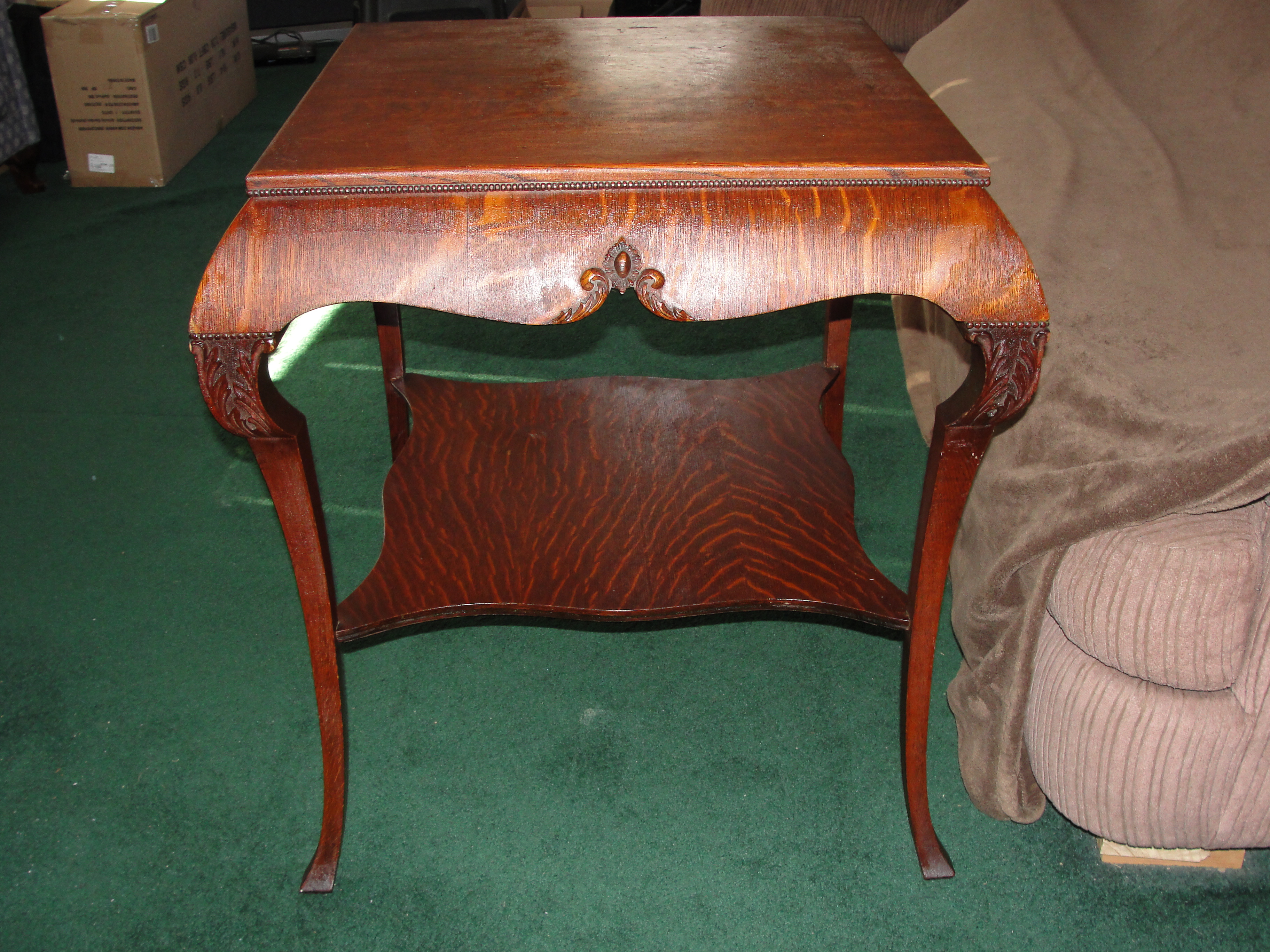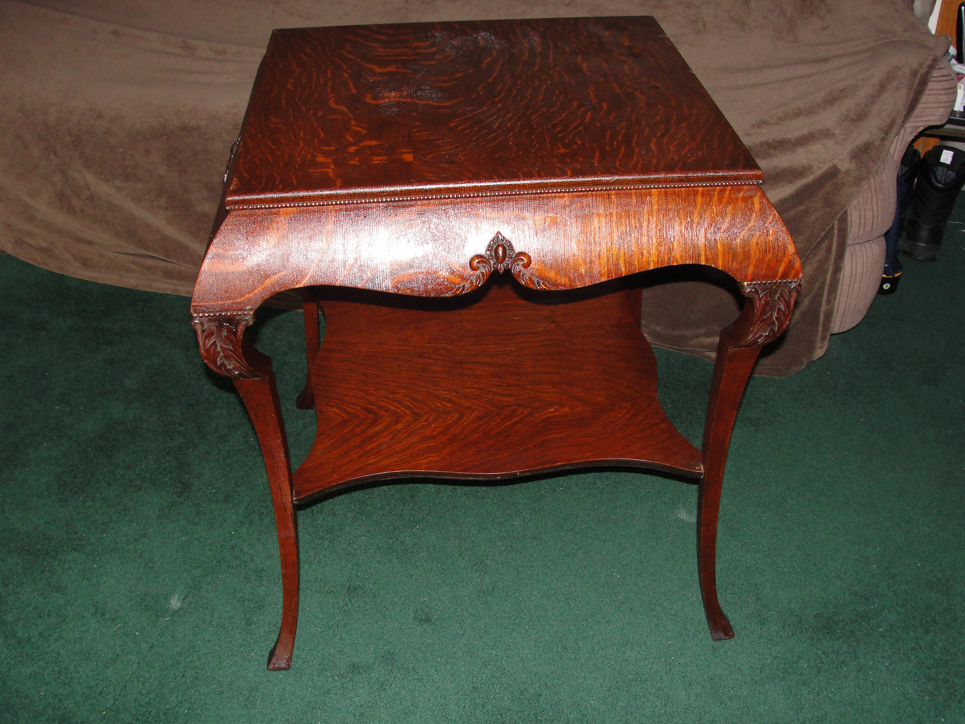 Your table dates from the turn of the 19th Century, similar tables can be seen in mail order catalogs of the period by Sears- Roebuck and Montgomery -Ward. Values for tables like this peaked in the 1990's, demand and values for them has fallen since then, today comparable tables often go at auction for under $100.00.