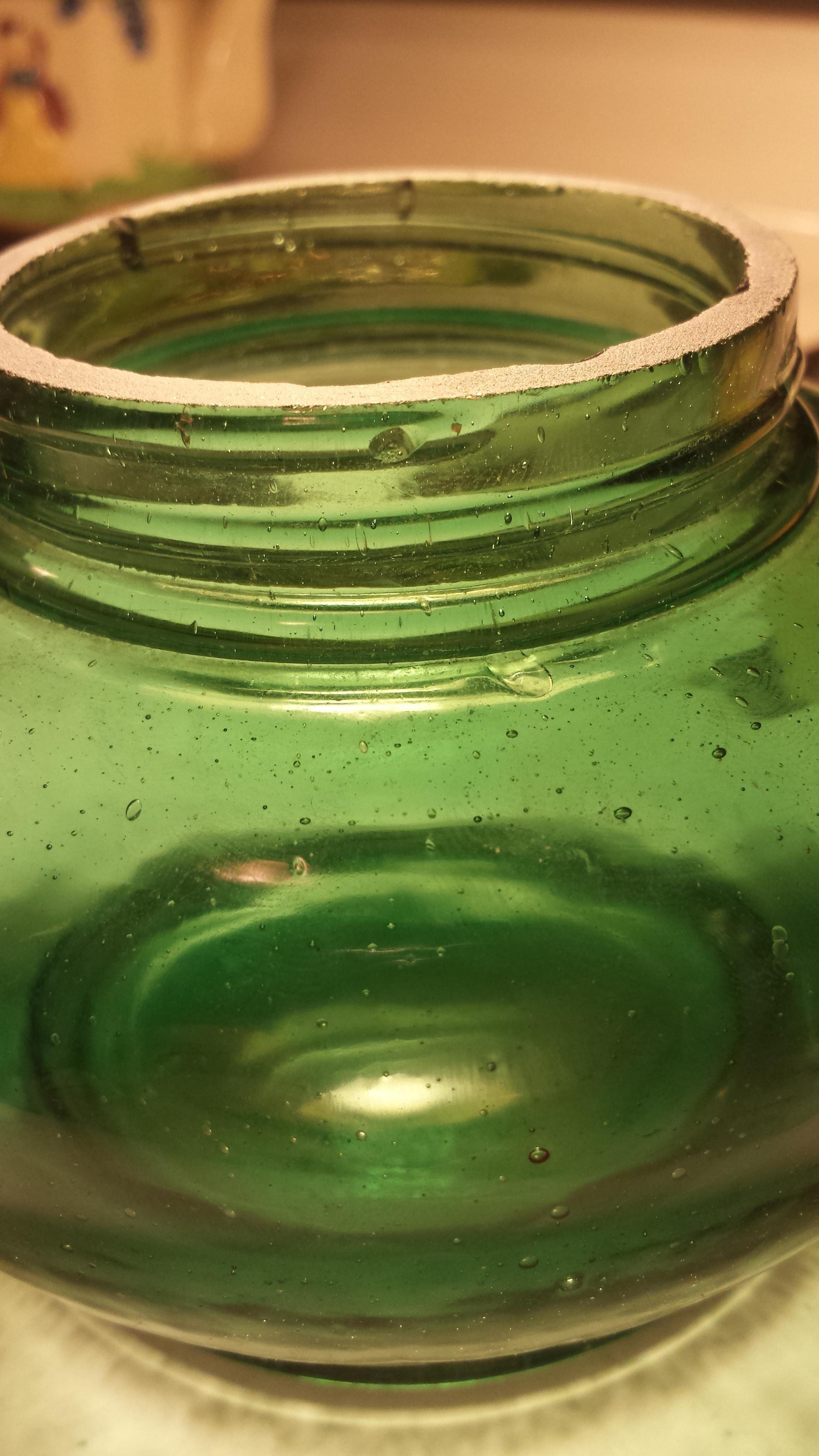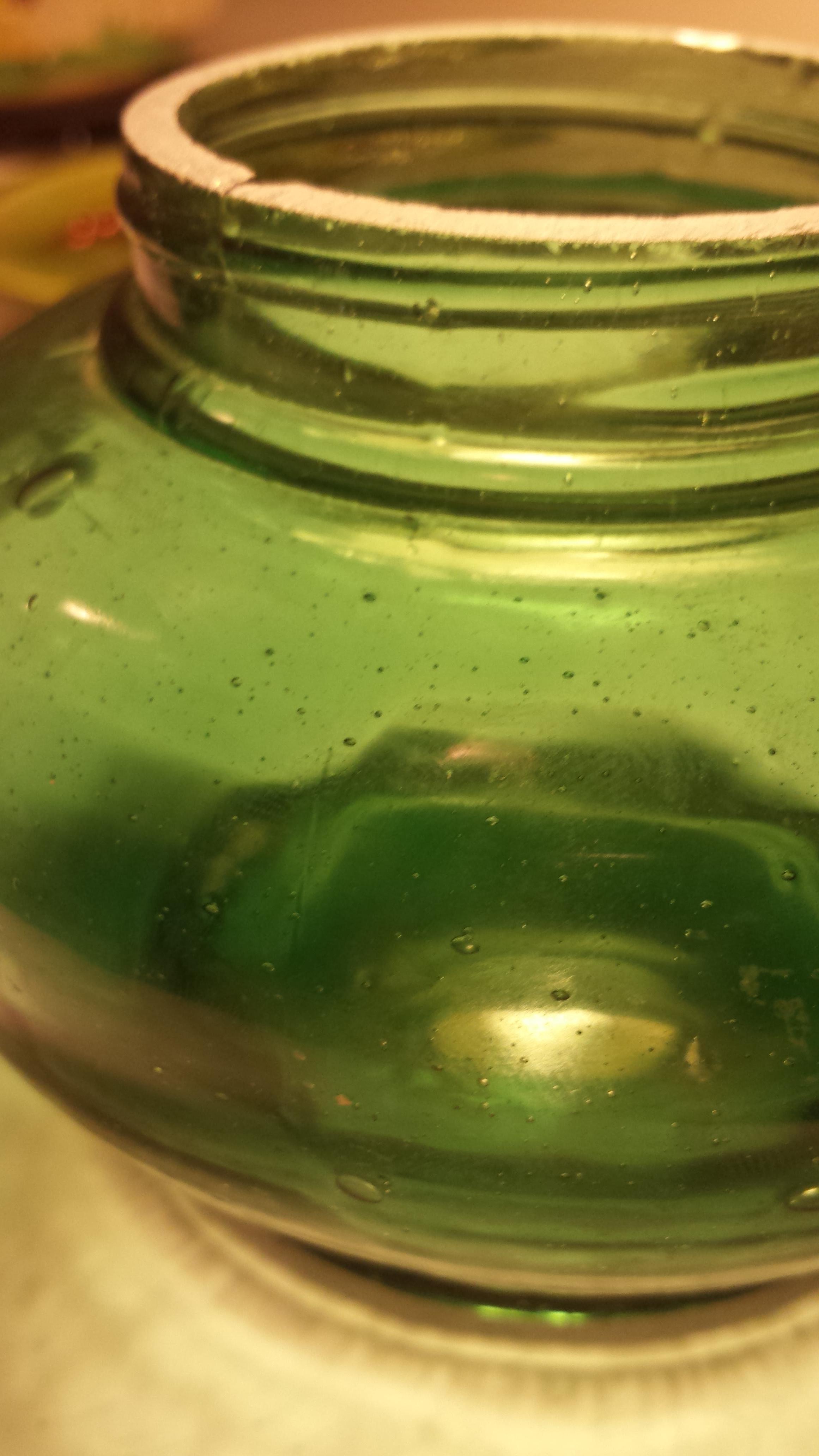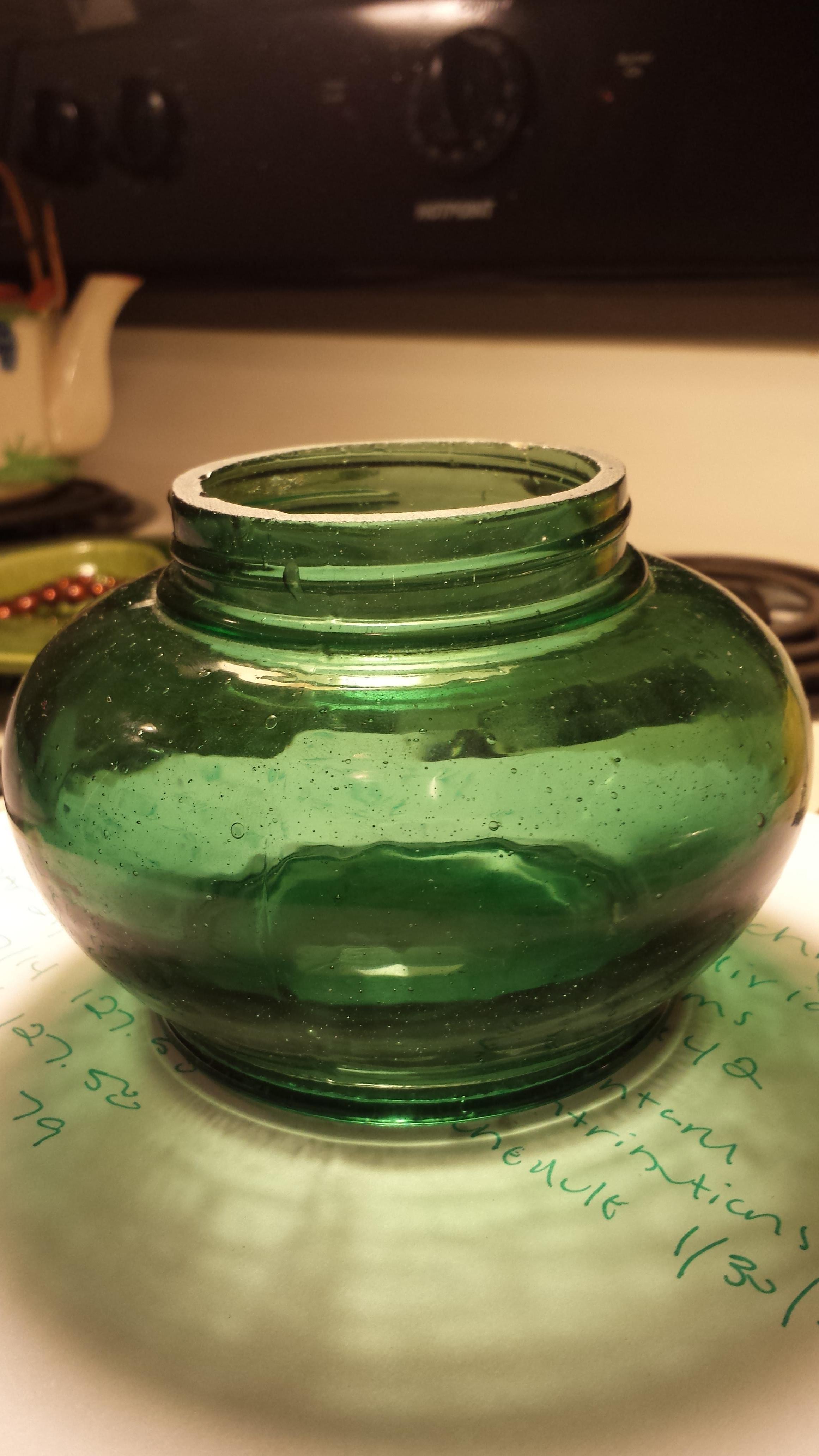 This odd shape glass jar is shorter than a typical canning jar. About 3 1/2 inches tall, 4 1/2 almost 5 inches wide. the mouth is a little over 2 1/2 inches wide, almost an inch tall from the glass bead/seal. Seams run along both sides of the glass evenly and are hardly noticeable but run from the lip down stopping at the beginning of the base. The base is flat and the seams almost sticks out a small amount. Embossed with four maker marks that I can not figure out for they are faint and may be a little disfigured. There are no numbers on the glass. At the base there seems to be a suction mark? The glass is shiny and smooth with a mild block/ripple feel to it. Has a faint mold/impression along one side. You can probably see the glass has large stretched bubbles but also an abundance of smaller round bubbles. The neck if I can call it that has a thread that is uninterrupted and runs through. There is a glass seal/bead located at the should and neck. Lip is ground or re fired? There are a few spots chipped on the lip. Seems to me that it obtains a Matt finish that's dark and not as shiny as the rest of the glass. Seems to have a purplish metallic shine when observed at different angles... my terminology I'm sure is not accurate but I hope you get the picture! I have been researching for days now and it's hard to get any information on this particular jar.