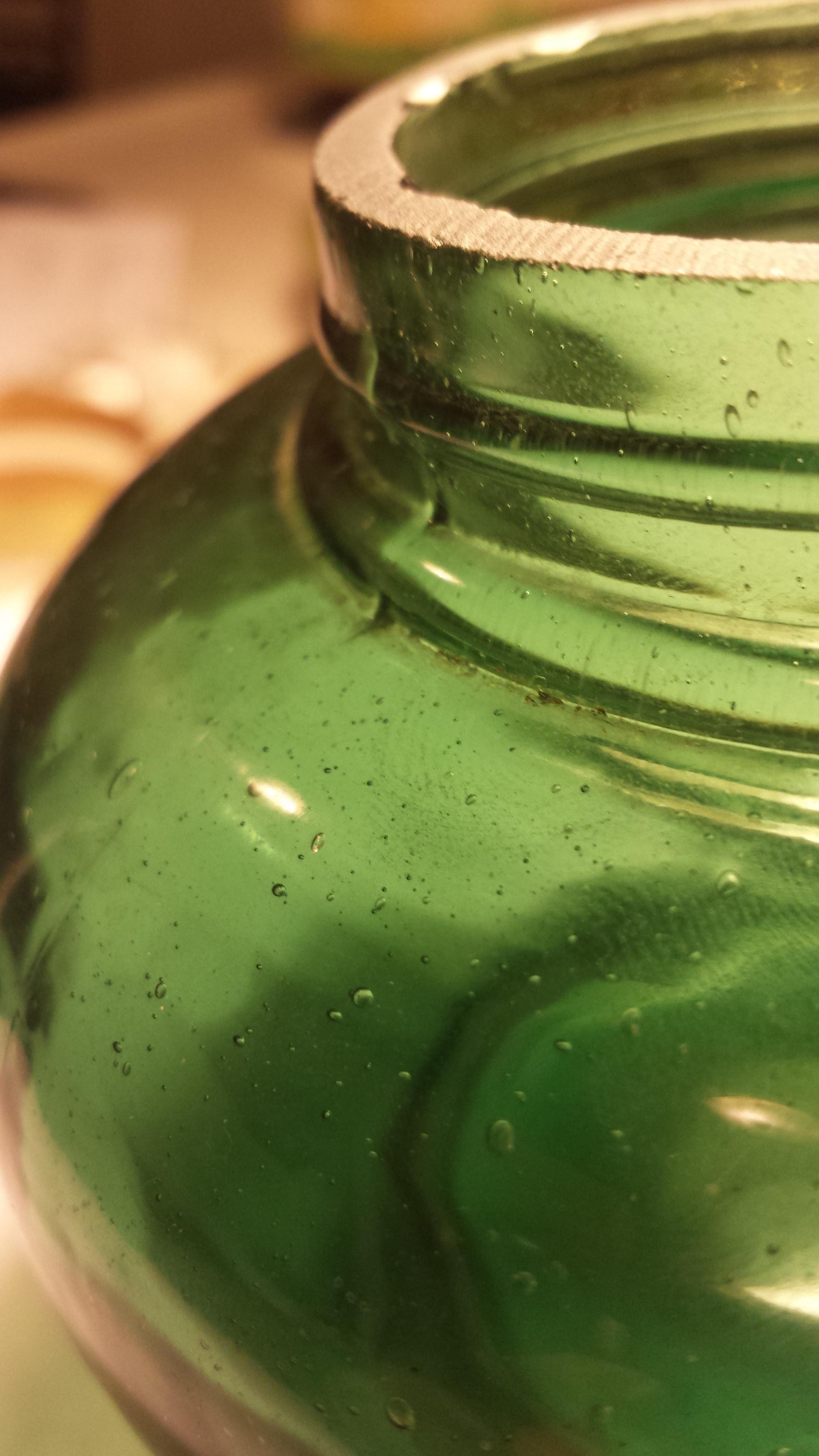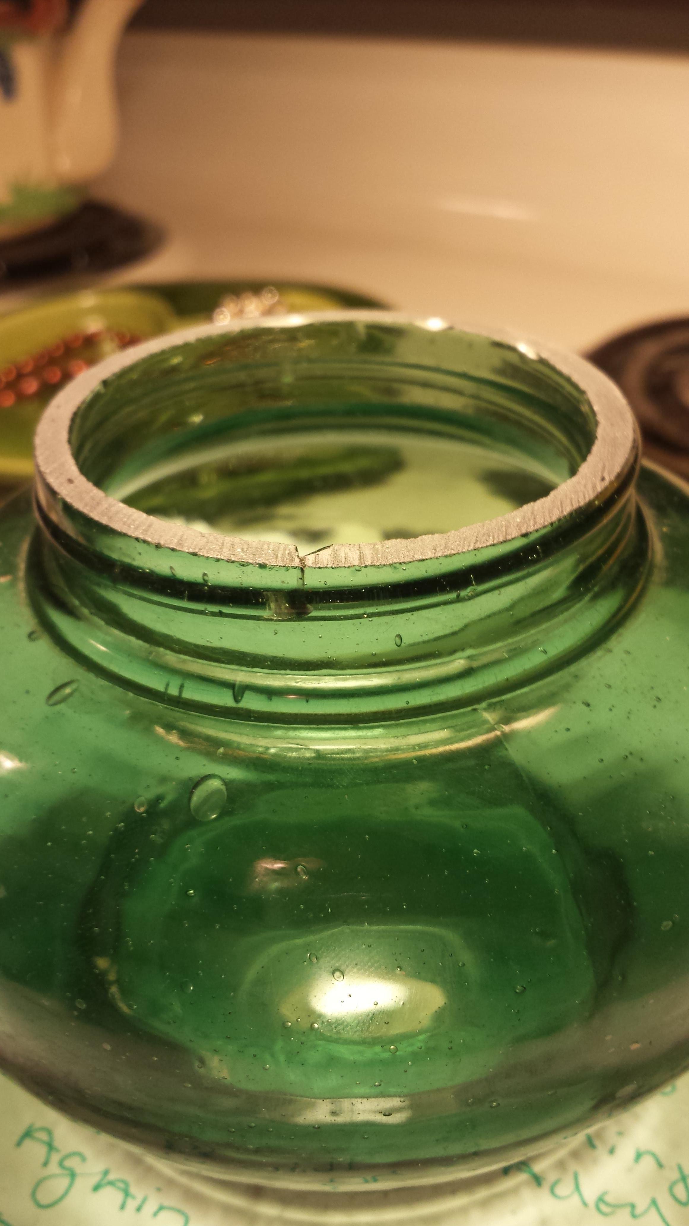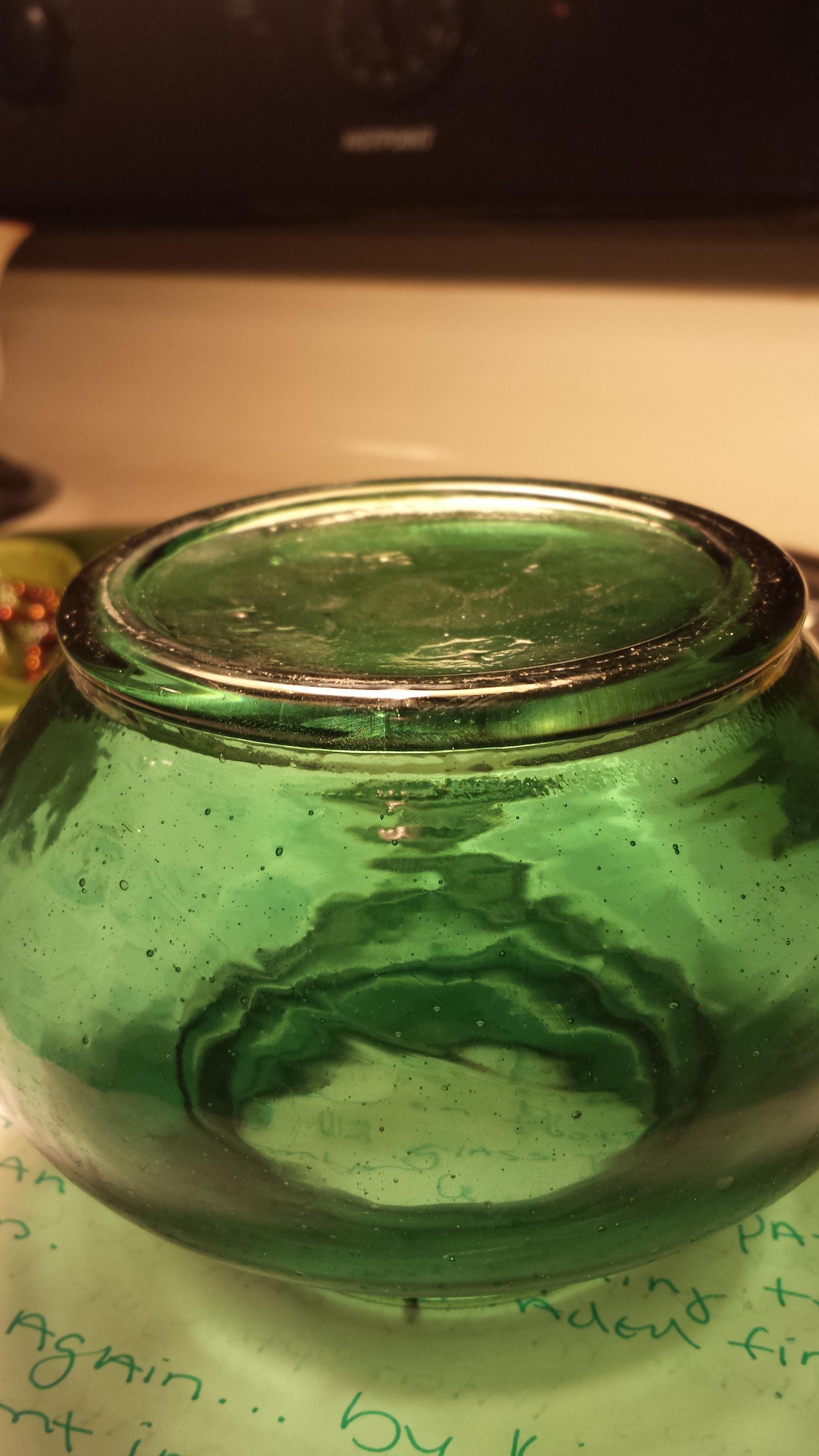 This odd shape glass jar is shorter than a typical canning jar. About 3 1/2 inches tall, 4 1/2 almost 5 inches wide. the mouth is a little over 2 1/2 inches wide, almost an inch tall from the glass bead/seal. Seams run along both sides of the glass evenly and are hardly noticeable but run from the lip down stopping at the beginning of the base. The base is flat and the seams almost sticks out a small amount. Embossed with four maker marks that I can not figure out for they are faint and may be a little disfigured. There are no numbers on the glass. At the base there seems to be a suction mark? The glass is shiny and smooth with a mild block/ripple feel to it. Has a faint mold/impression along one side. You can probably see the glass has large stretched bubbles but also an abundance of smaller round bubbles. The neck if I can call it that has a thread that is uninterrupted and runs through. There is a glass seal/bead located at the should and neck. Lip is ground or re fired? There are a few spots chipped on the lip. Seems to me that it obtains a Matt finish that's dark and not as shiny as the rest of the glass. Seems to have a purplish metallic shine when observed at different angles... my terminology I'm sure is not accurate but I hope you get the picture! I have been researching for days now and it's hard to get any information on this particular jar.