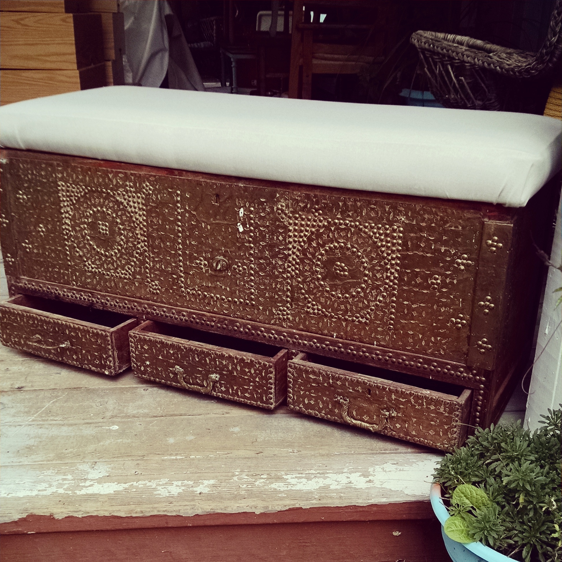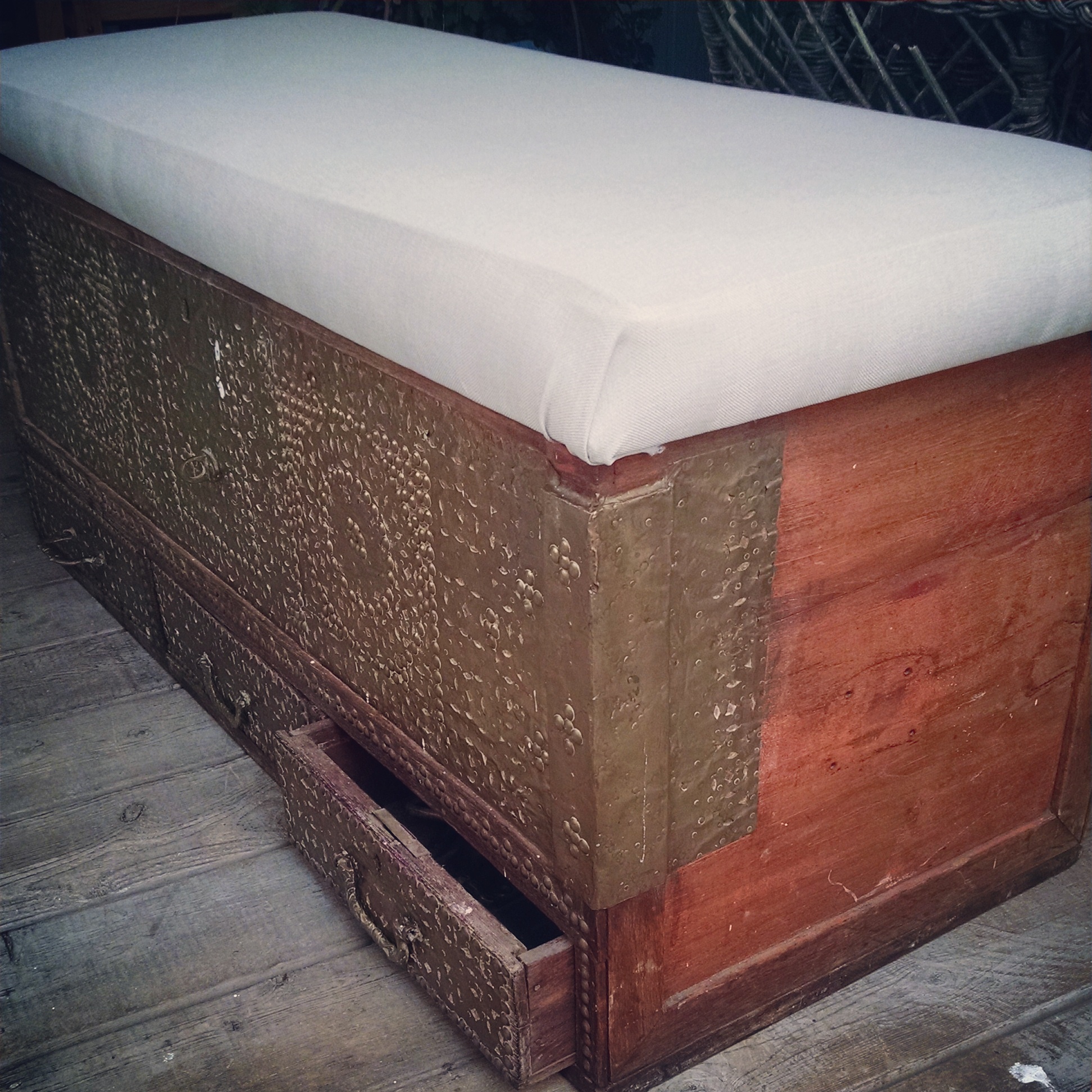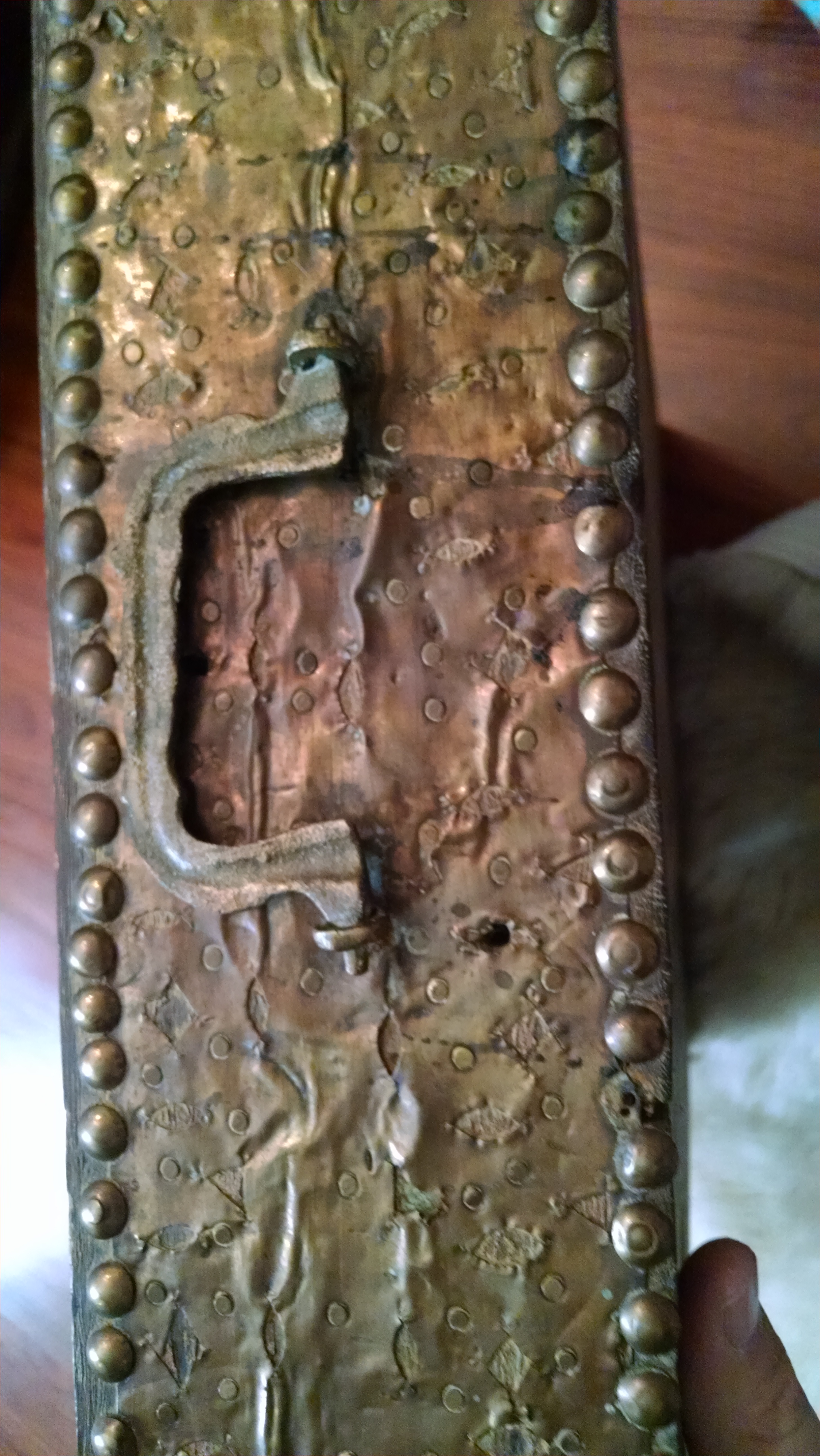 This is what I believe to be an antiques Omani wedding chest. It is very heavy, the seat isn't original but added I think.. The body is bound in brass and studded plate.. The inside has a candle box. I have not been able to discover any markings but the brass and a specially the handles are very heavy and appeared to be very old. The wood almost has a petrified look to it. it measures probably 46 inches wide, about 20 inches deep and maybe 25 inches tall. It seems to be very sturdy and is in poor shape but rather in very good shape. It has lots of rich patina