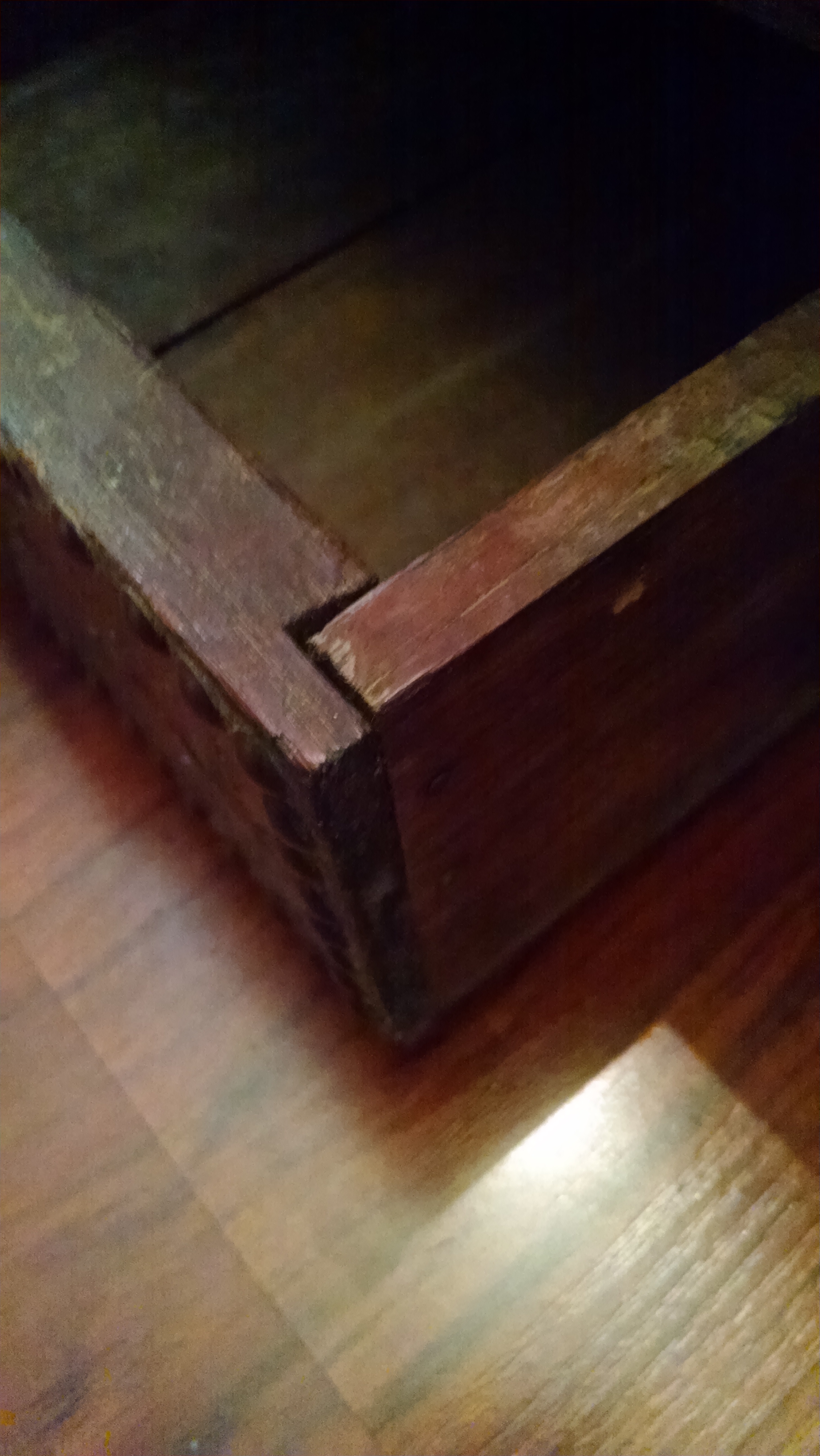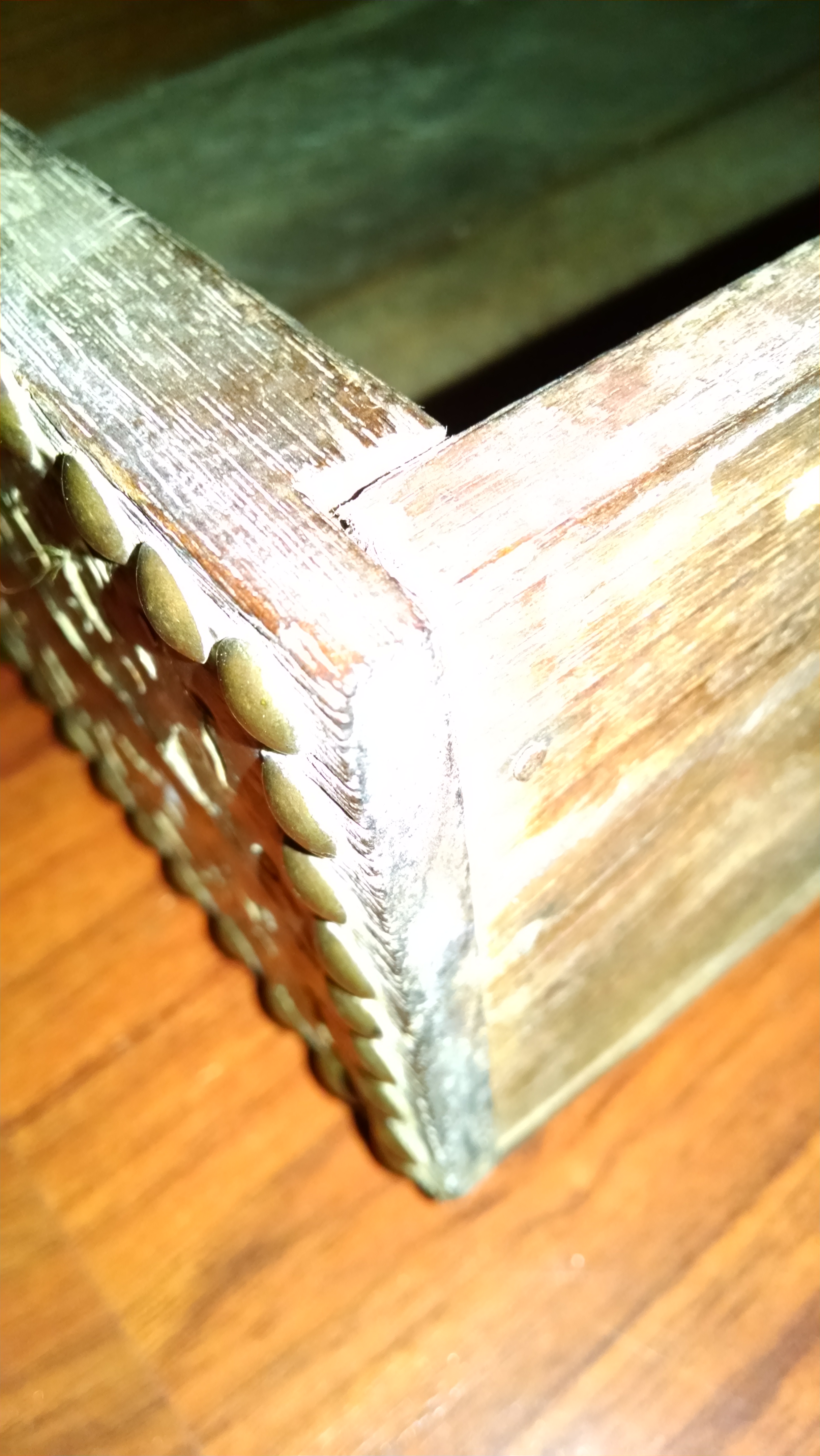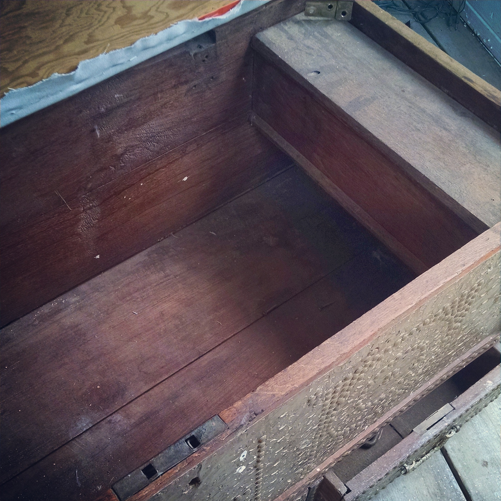 This is what I believe to be an antiques Omani wedding chest. It is very heavy, the seat isn't original but added I think.. The body is bound in brass and studded plate.. The inside has a candle box. I have not been able to discover any markings but the brass and a specially the handles are very heavy and appeared to be very old. The wood almost has a petrified look to it. it measures probably 46 inches wide, about 20 inches deep and maybe 25 inches tall. It seems to be very sturdy and is in poor shape but rather in very good shape. It has lots of rich patina
