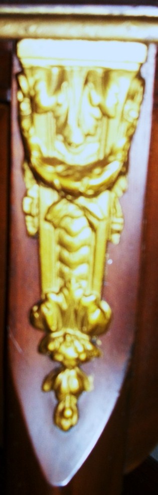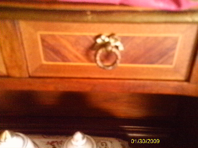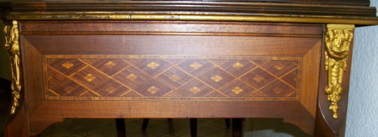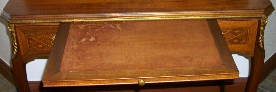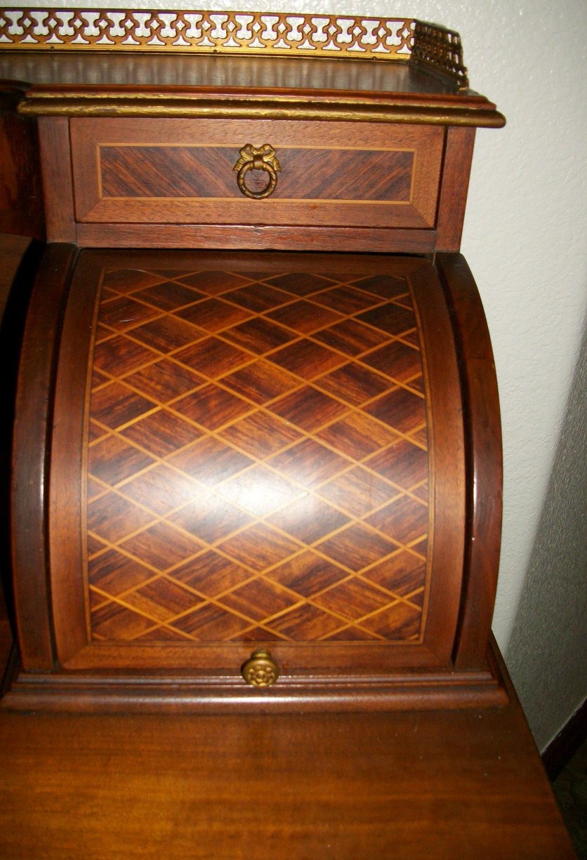The style of this beautiful desk appears to be Louis XV. We have been unable to find informtion about this desk or even a similar piece and have been searching for well over a year. It has dainty feet with a Gilded decoration at the base, as well as at the point where legs meet desk. Every piece is dovetailed. There is a large drawer with inlaid design, and above that is a pull out leather topped writing surface ( 16 1/2 X 18") The desktop has a roll top with inlaid design at either end which measure 8 3/4 " across (each). Above the roll tops there are 2 medium sized drawers and between those in the center are two smaller drawers (All have inlaid design) The very top of the desk has a 1" Brass rail Sides and Back) The bottom of the large drawer has a handwritten mark "Milano 3082". The underside of the pull out writing surface has a mark "15". The trim around the edges is a bit faded, but is gilded as well.... Help?