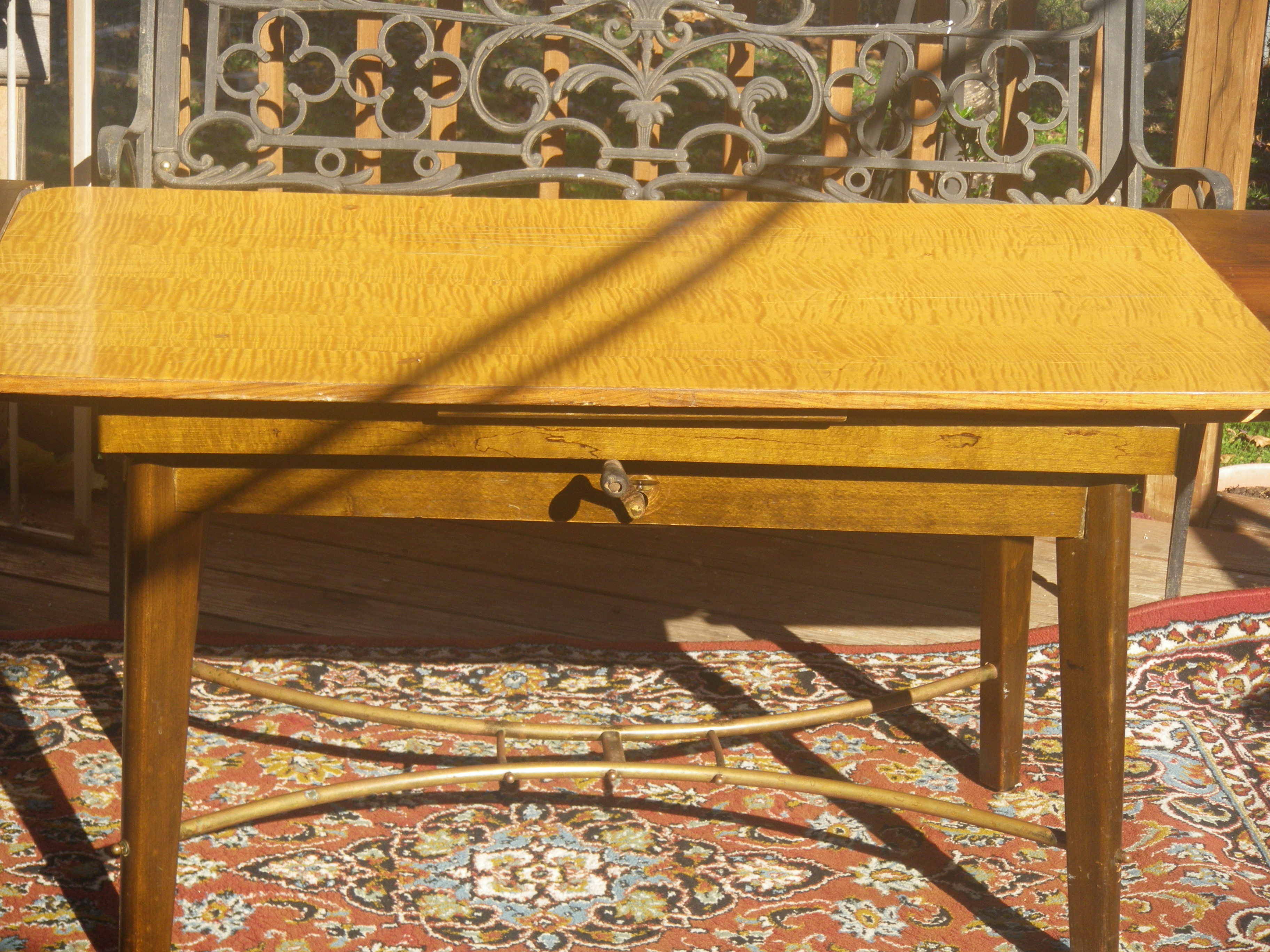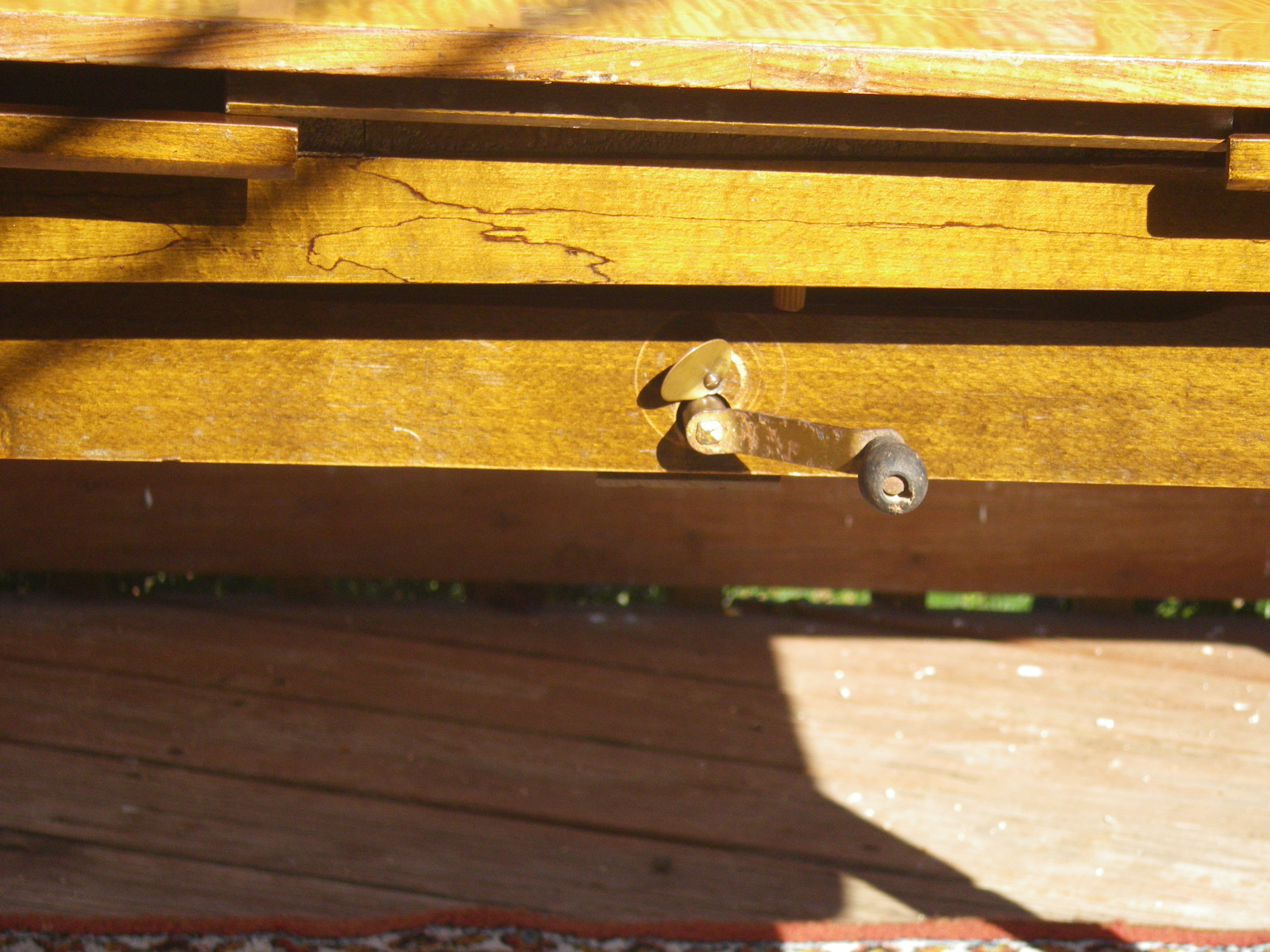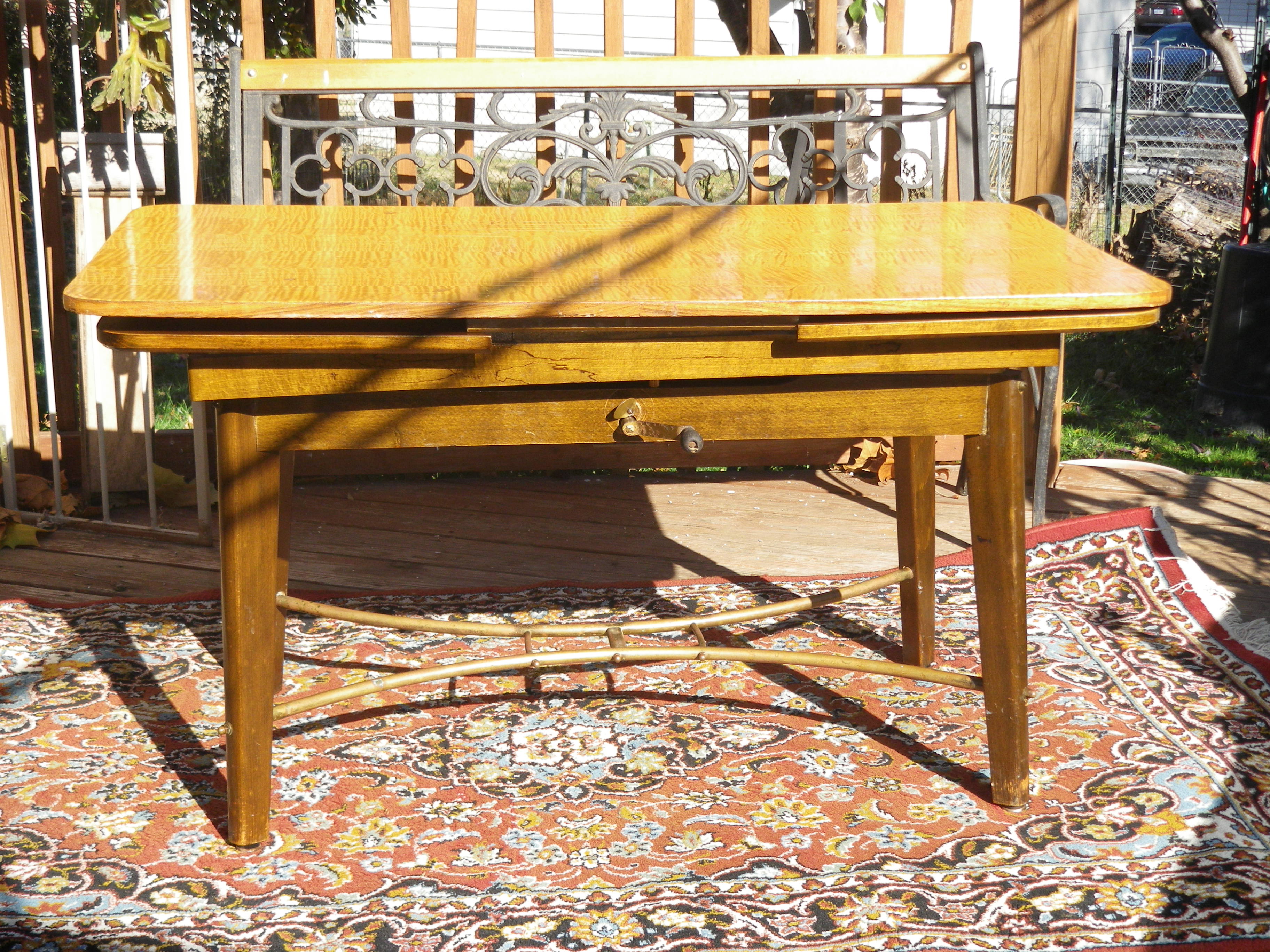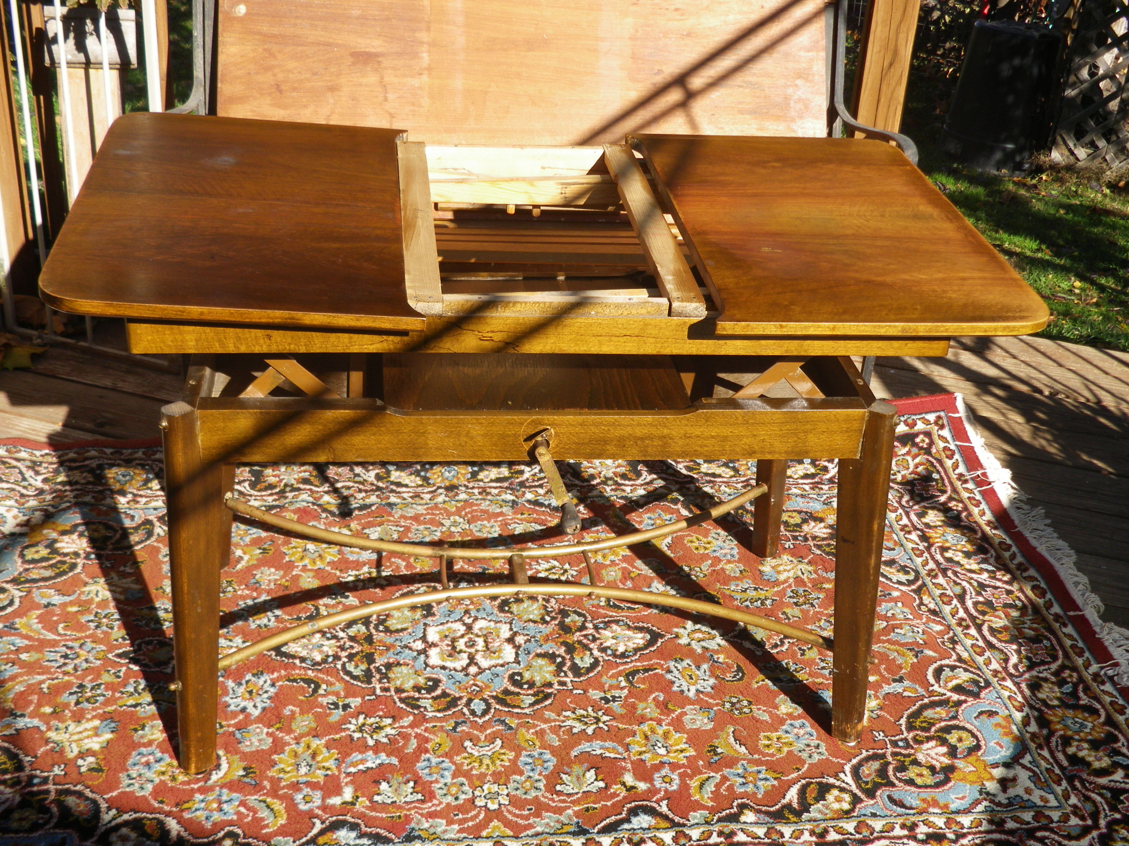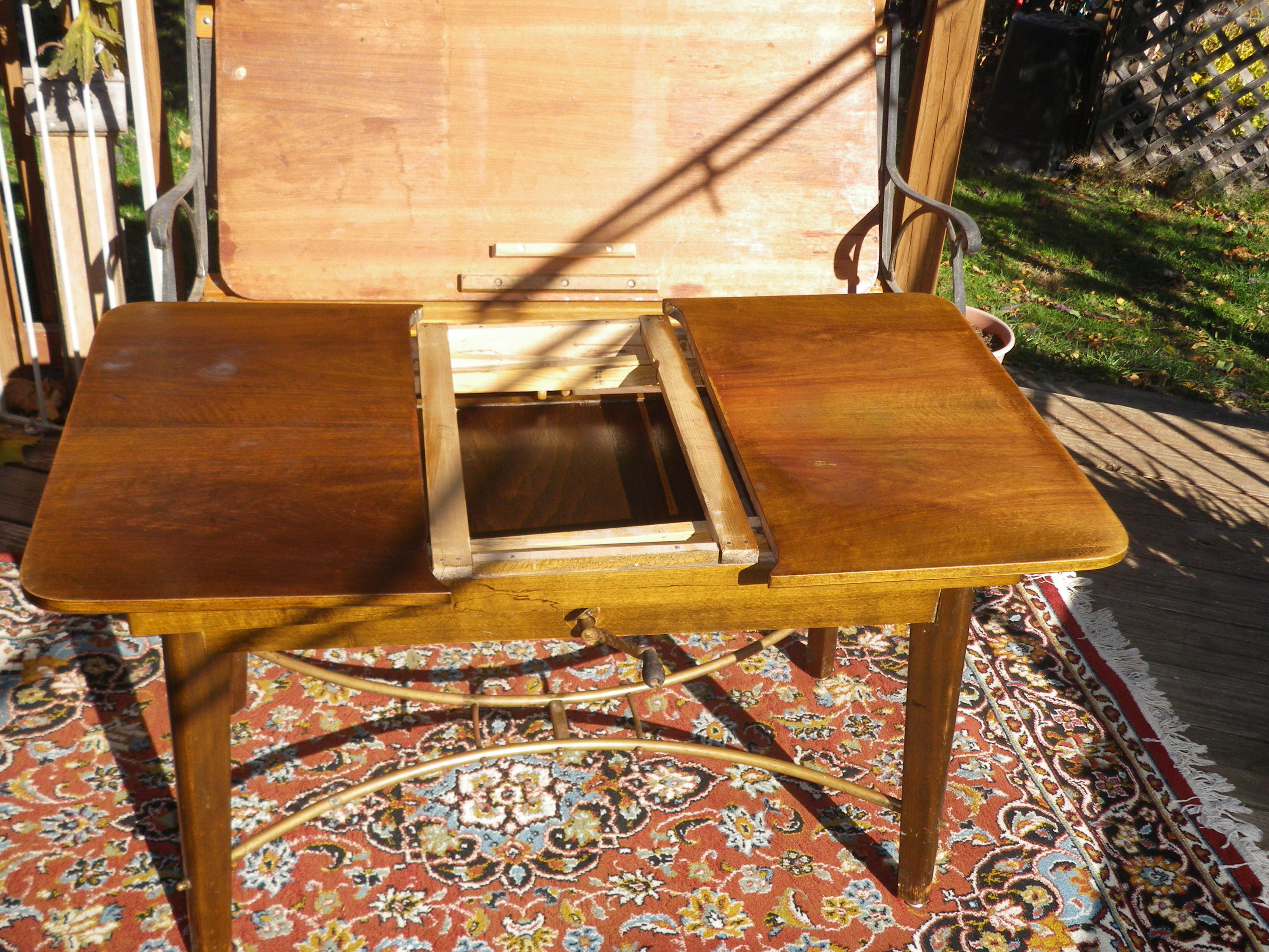 vintage expandable drop-in leaf table with crank adjustable height.