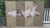 Two identical antique vases were purchased at an estate sale in 1988 for $10,000.00. The location of the estate sale is unknown, however it is believed that these beautiful oriental vases were purchased somewhere in the southern United States. The designs featured on the vases include enameled hand painted cranes, molding that embroiders the shoulder, jade-colored hand painted handles that resemble foo dogs, along with multicolored designs on the lip and foot. Dimensions are 37 1/2" tall, and 14" in diameter at the lip.