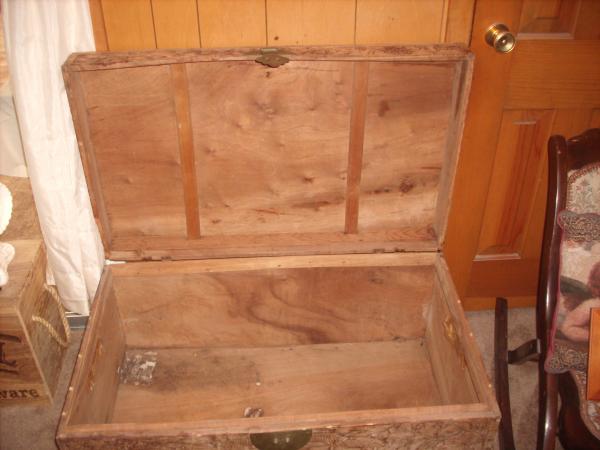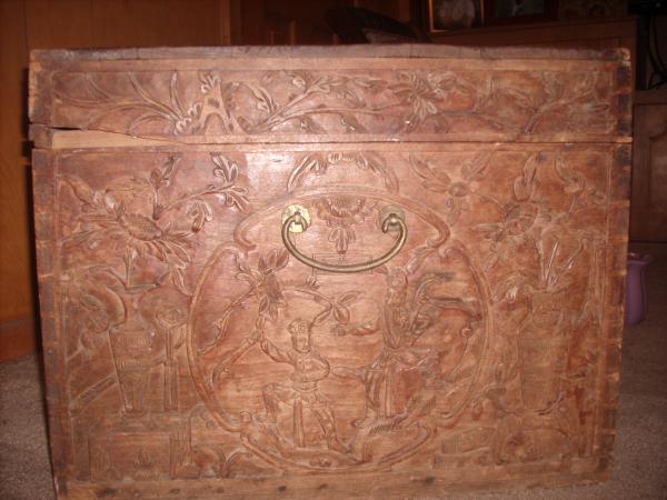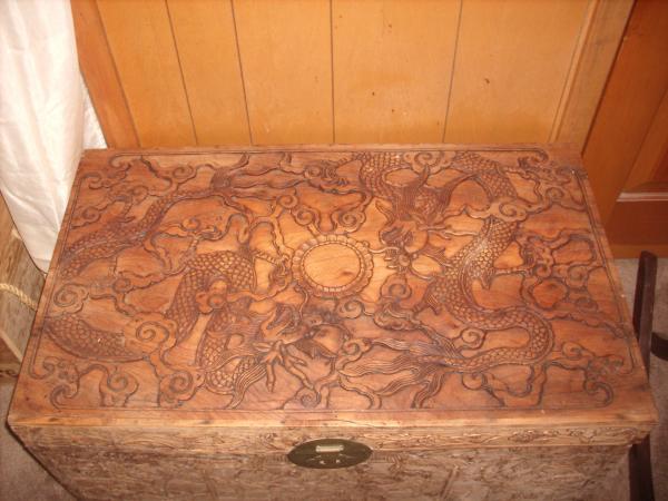 wooden trunk with beautiful carvings of dragons and village scenes.