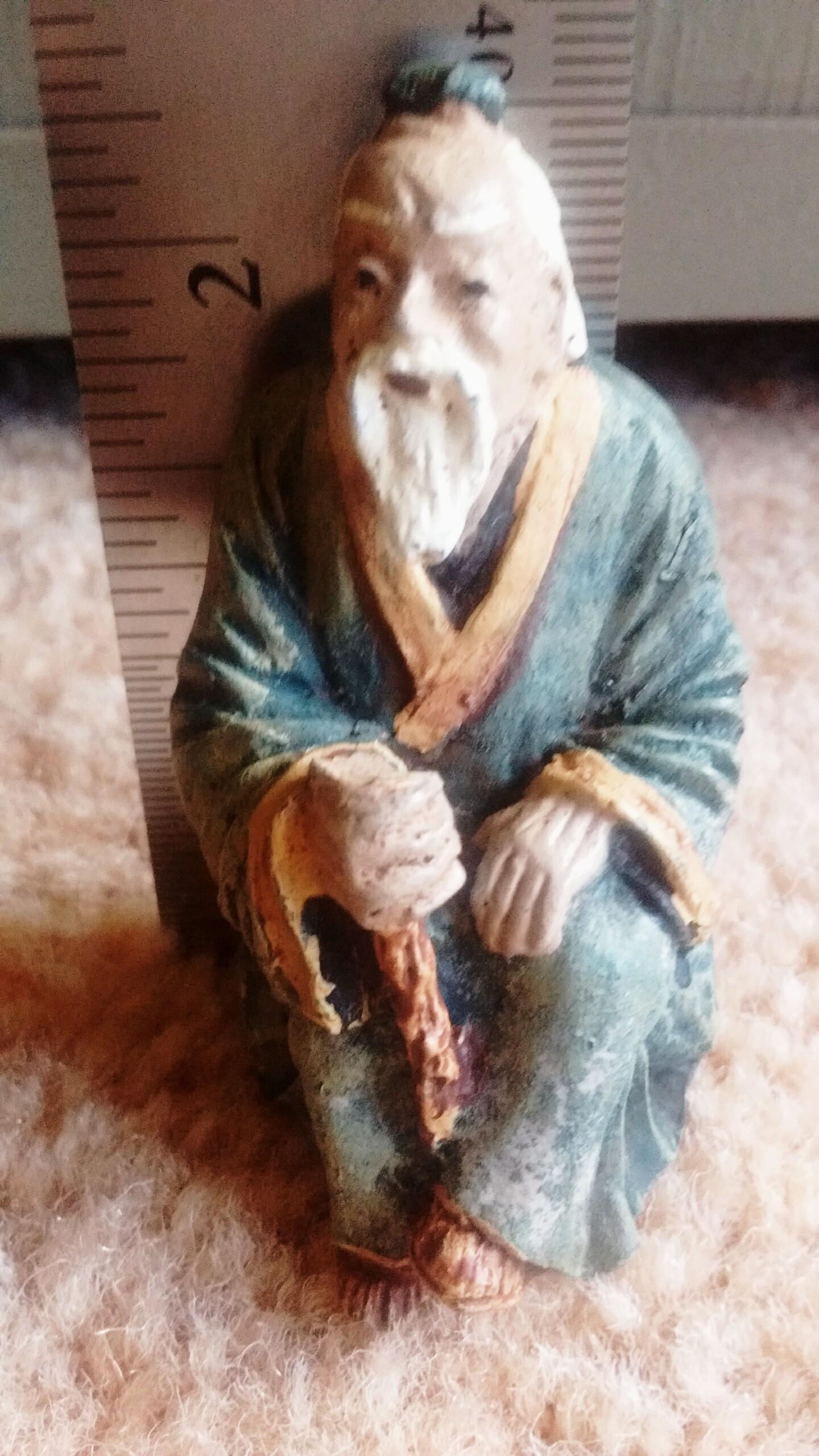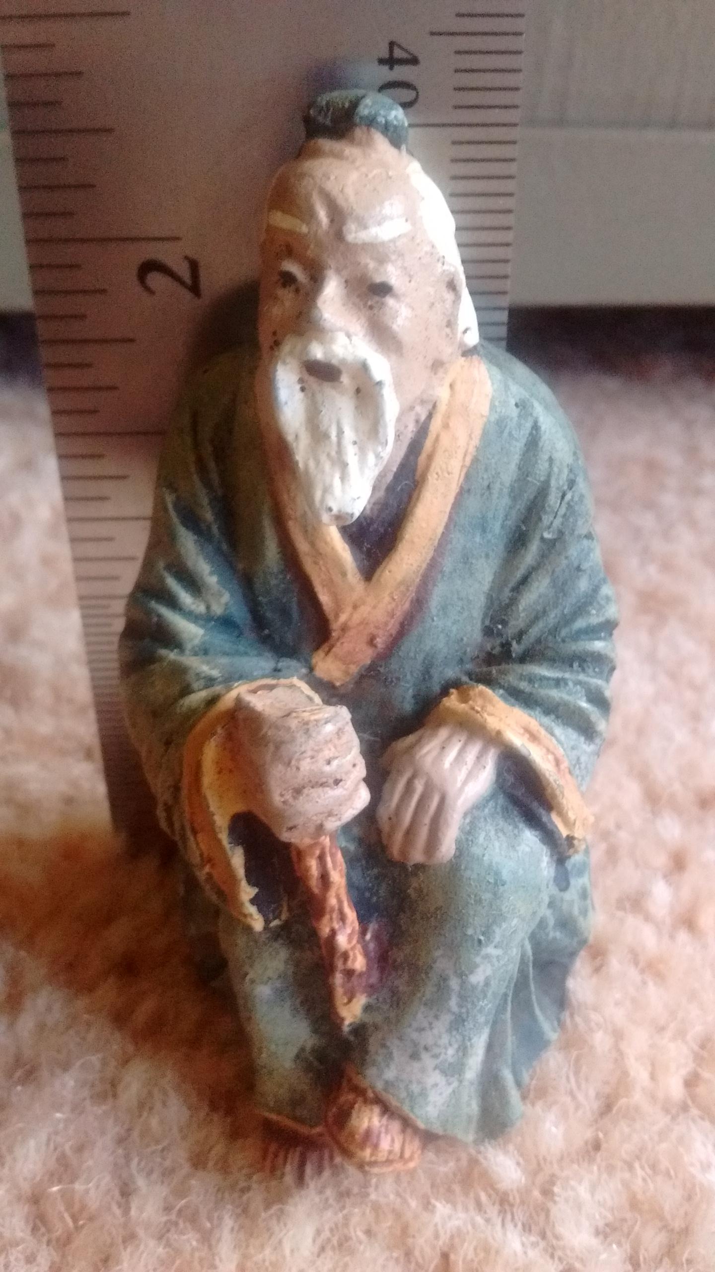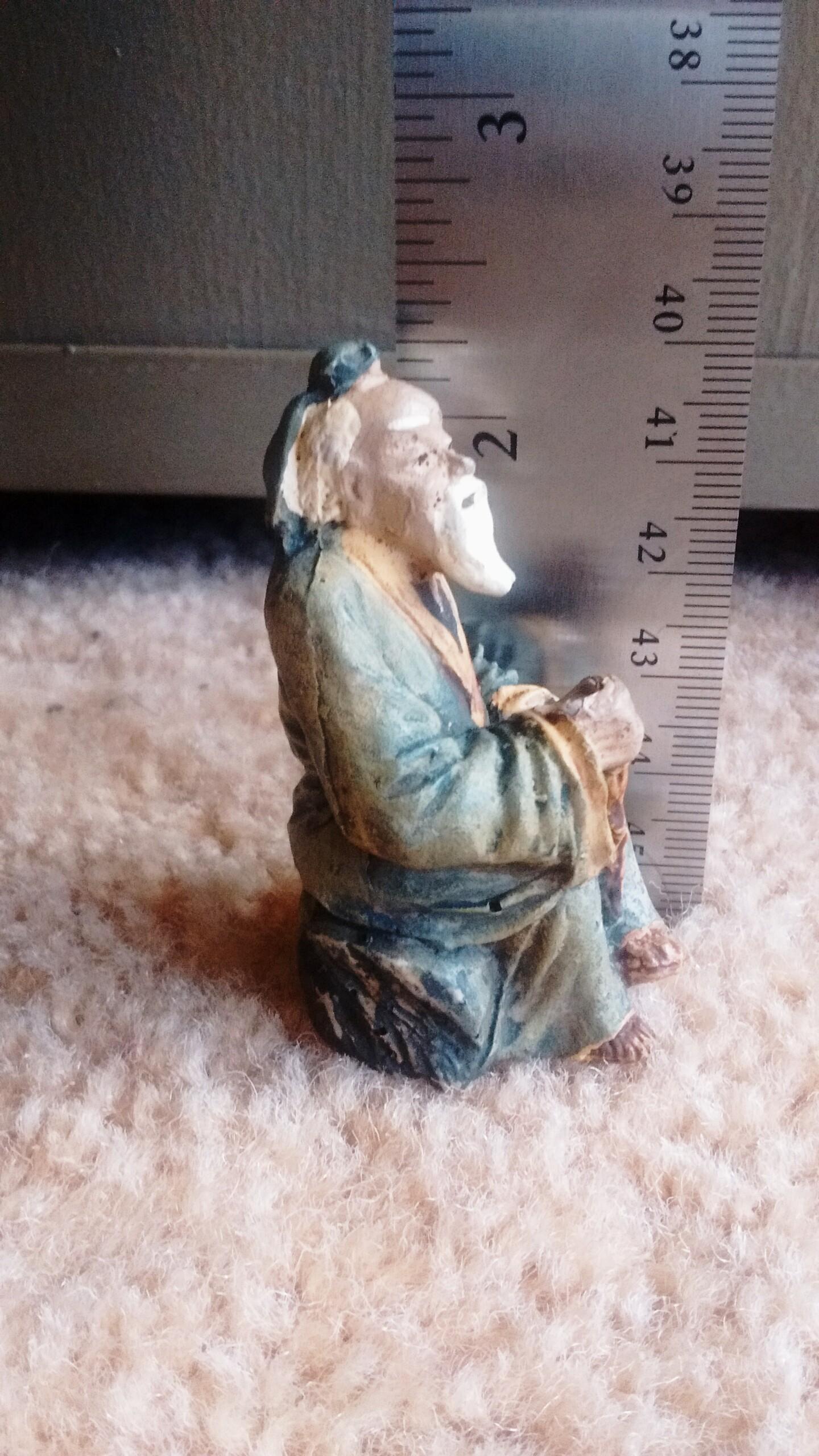 Description This is a 2" and a quarter figurine. Sitting on a tree stump. He is wearing traditional green with gold trimming kimono. He is holding a walking stick/ cane. His facial features resembles a Kung fu master. White facial hair/ Beard and shoulder length hair with a bun in top of his head.