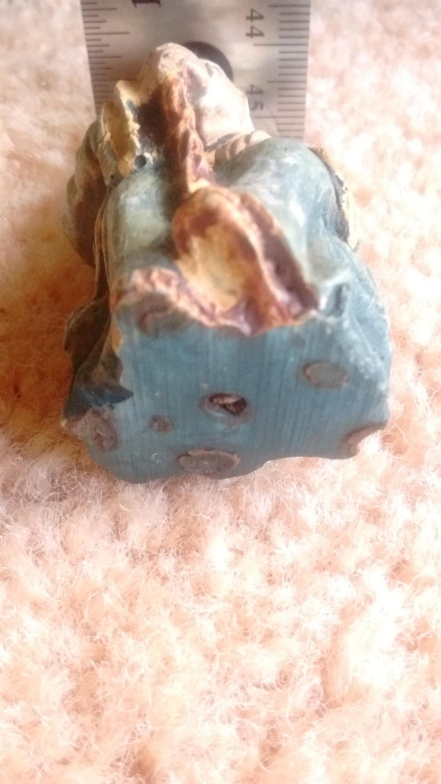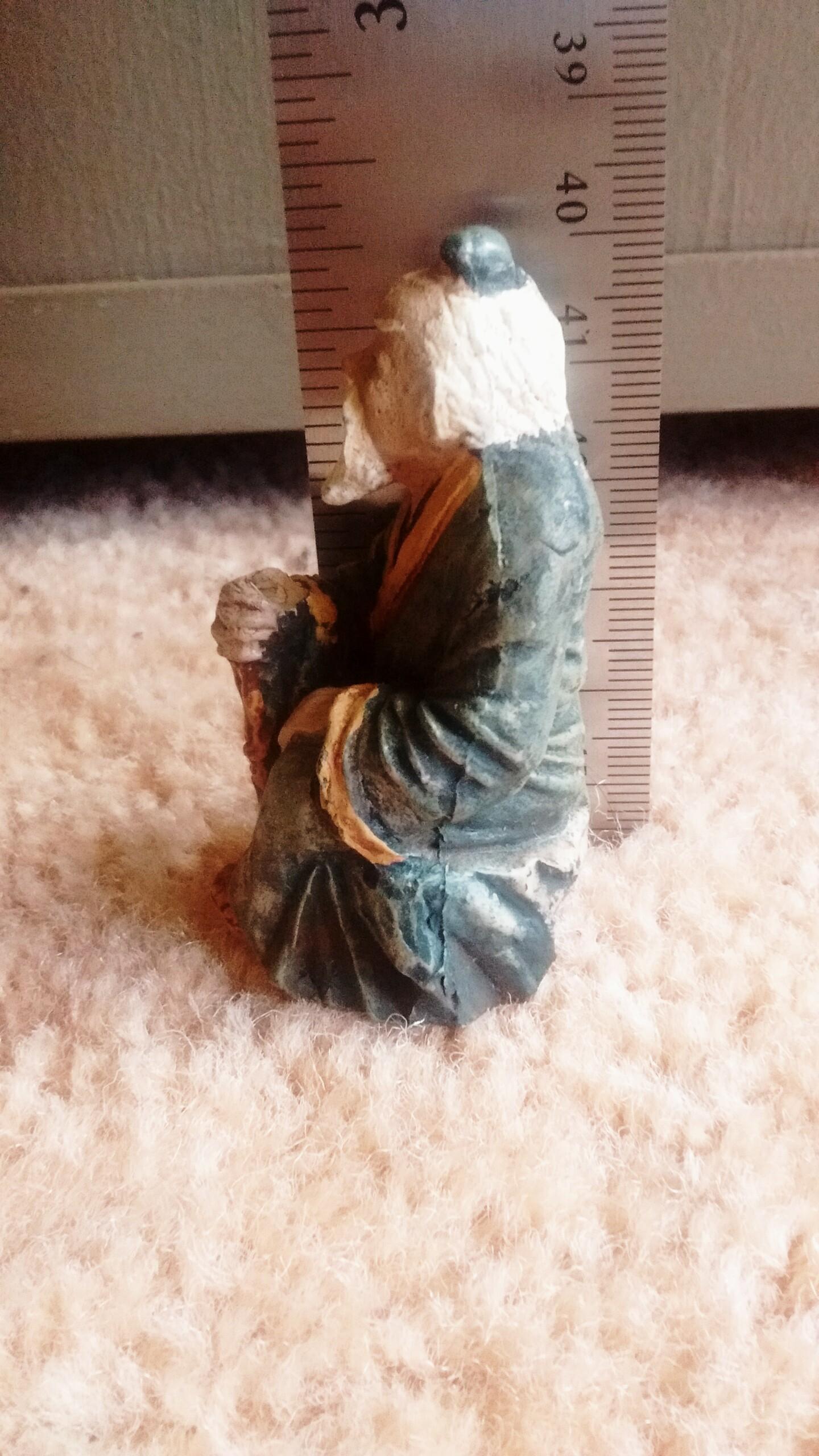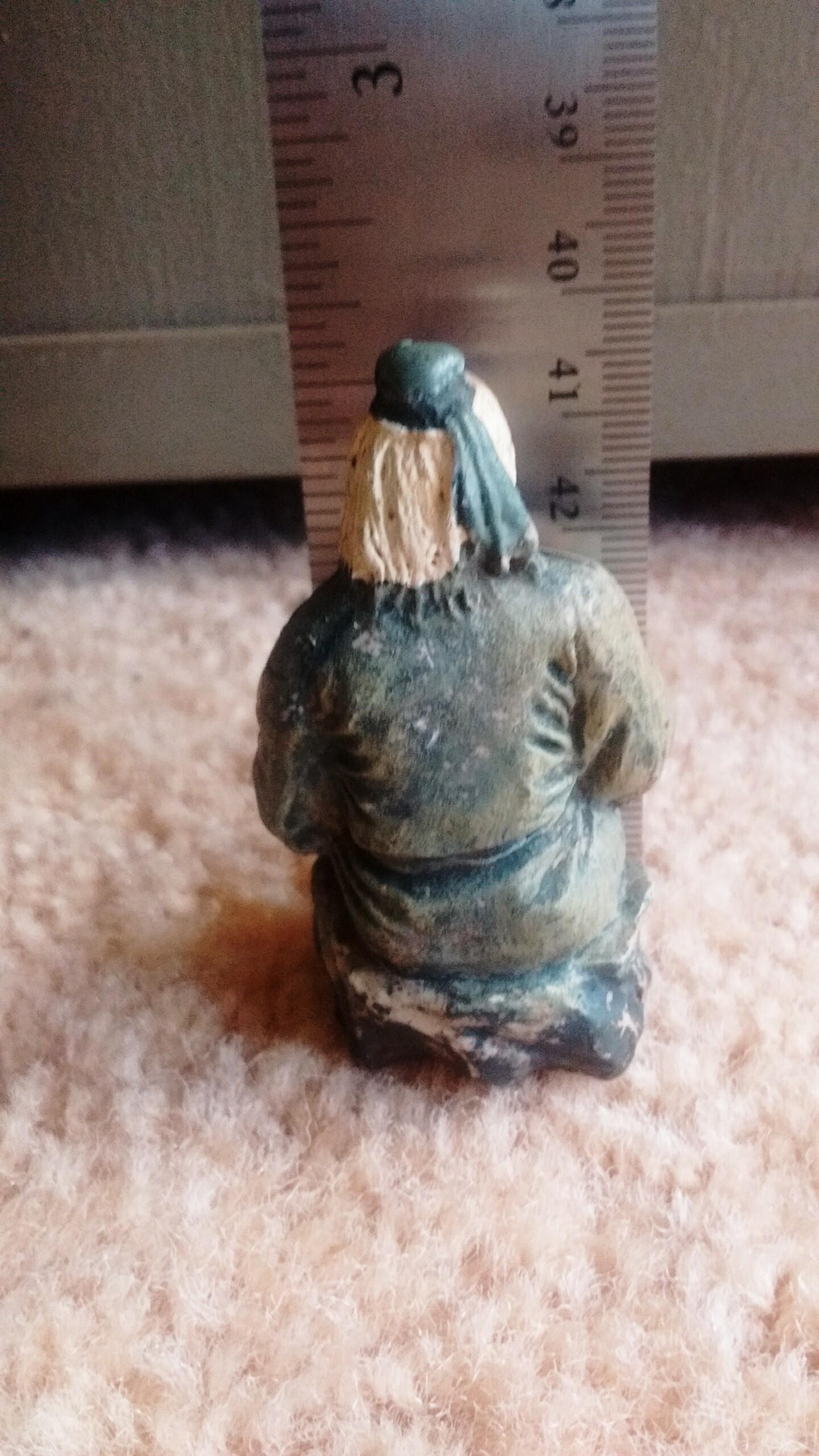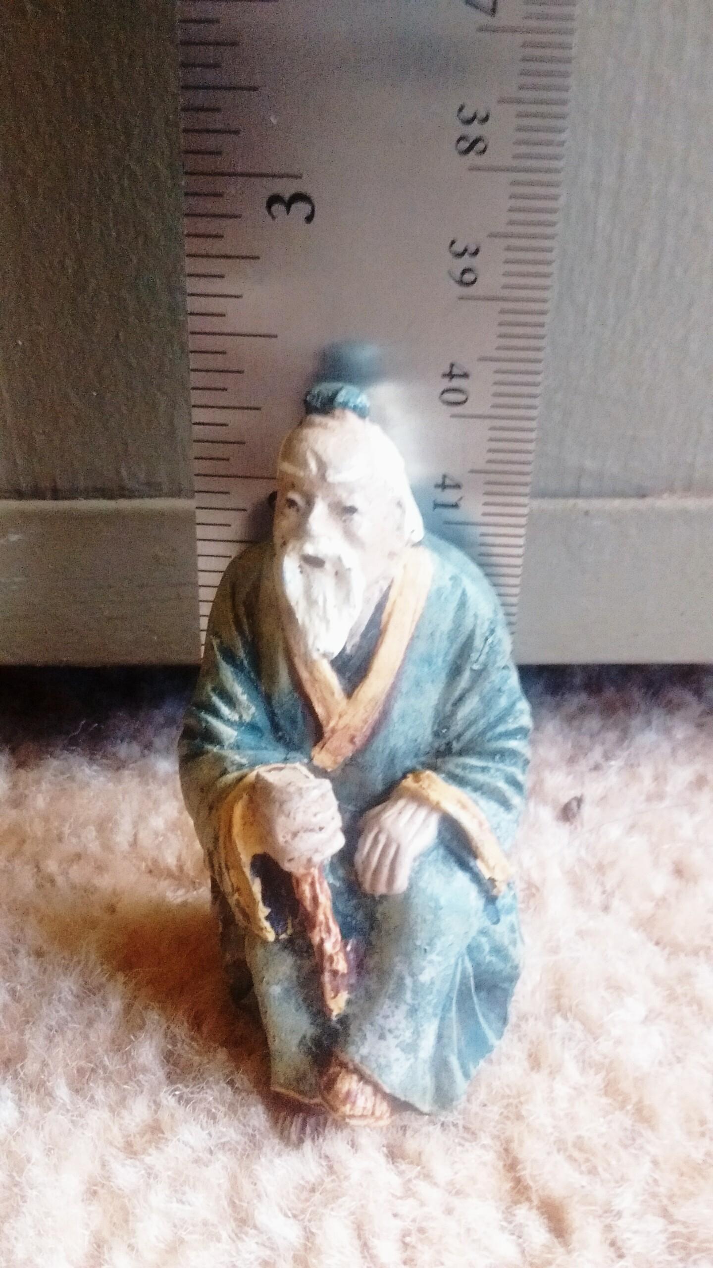 Description This is a 2" and a quarter figurine. Sitting on a tree stump. He is wearing traditional green with gold trimming kimono. He is holding a walking stick/ cane. His facial features resembles a Kung fu master. White facial hair/ Beard and shoulder length hair with a bun in top of his head.