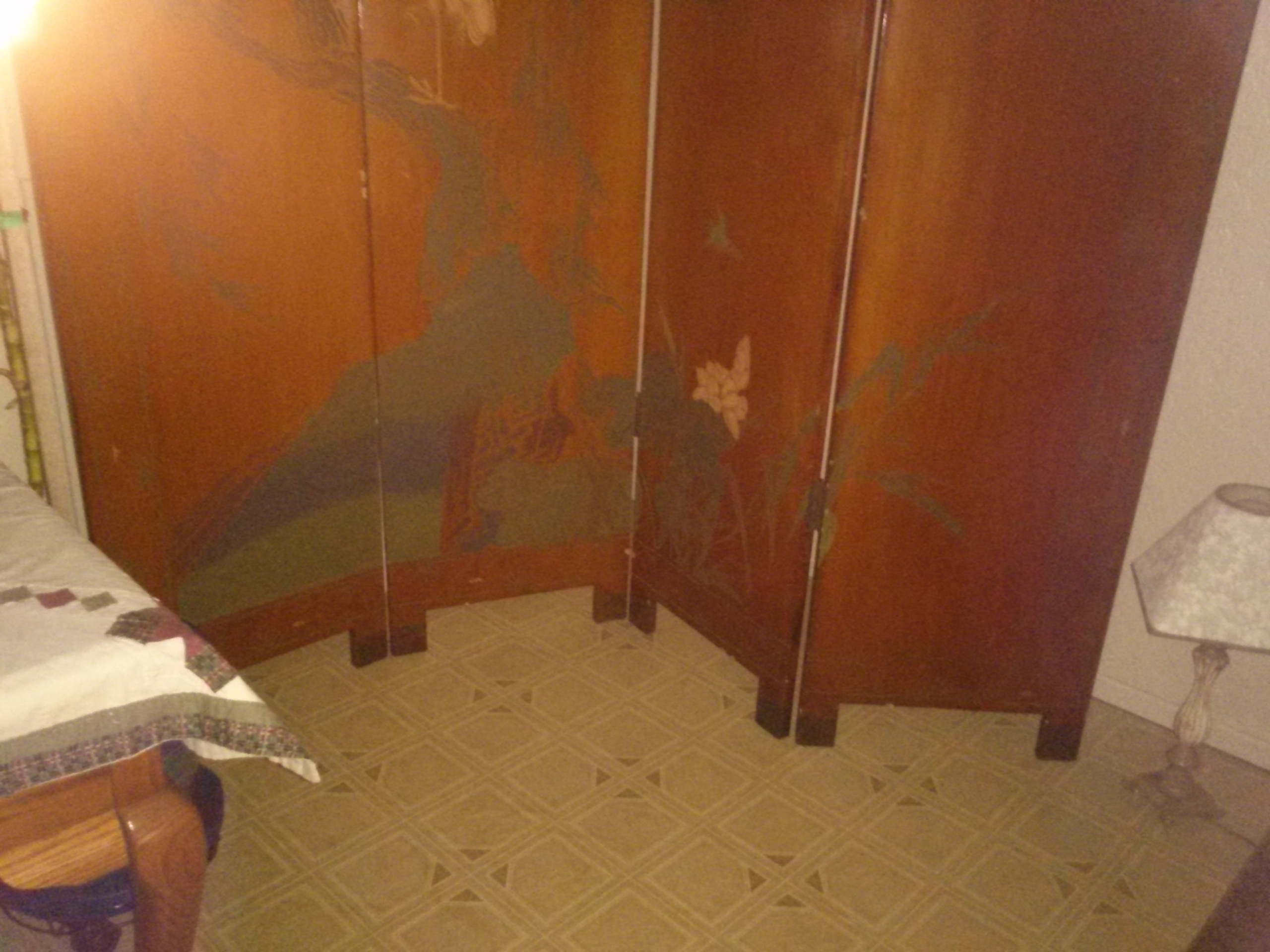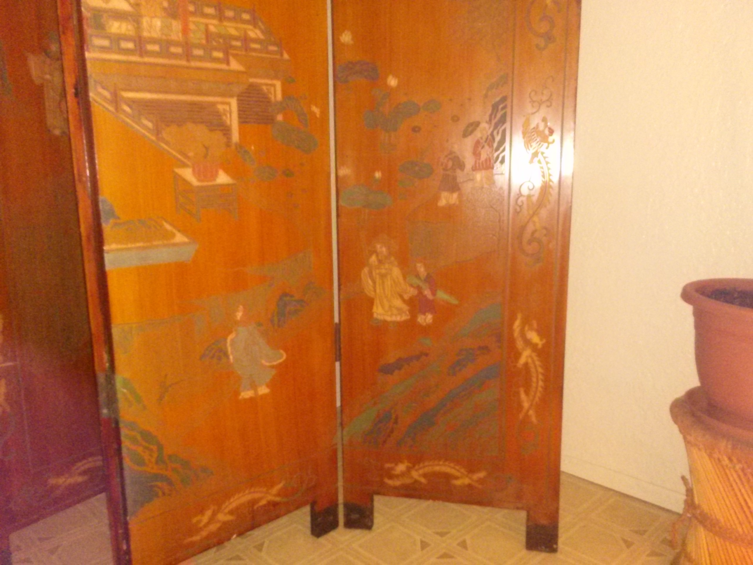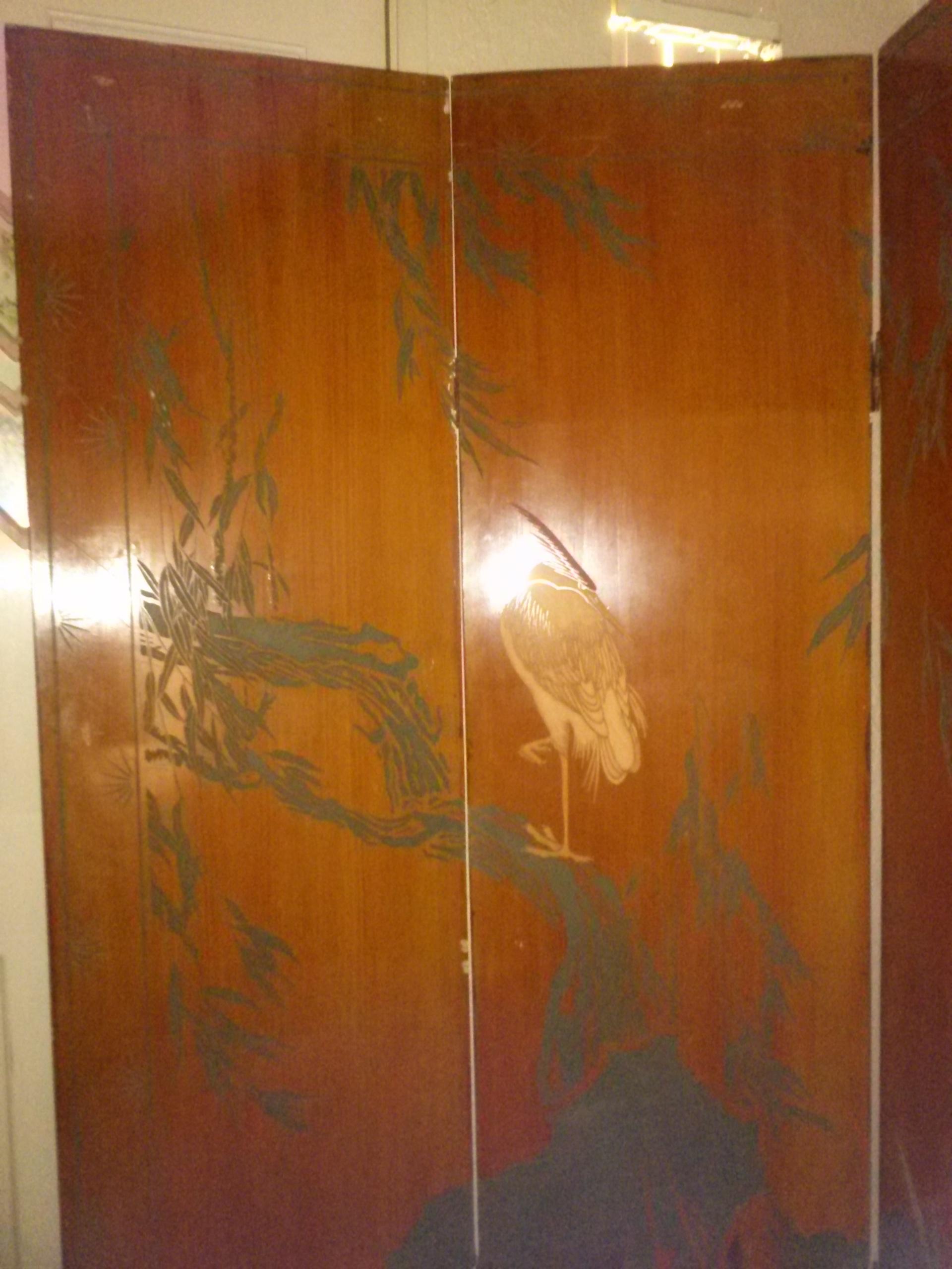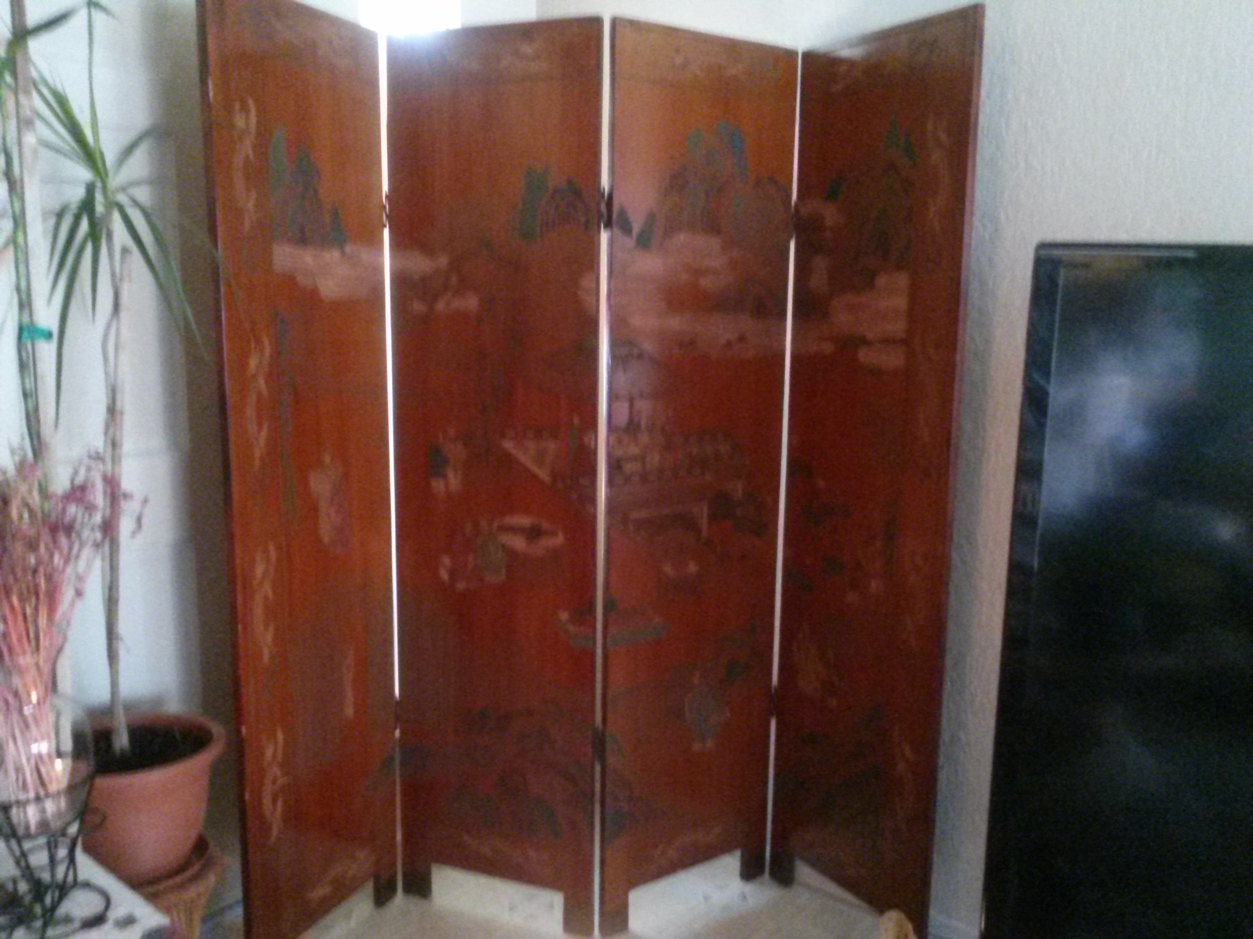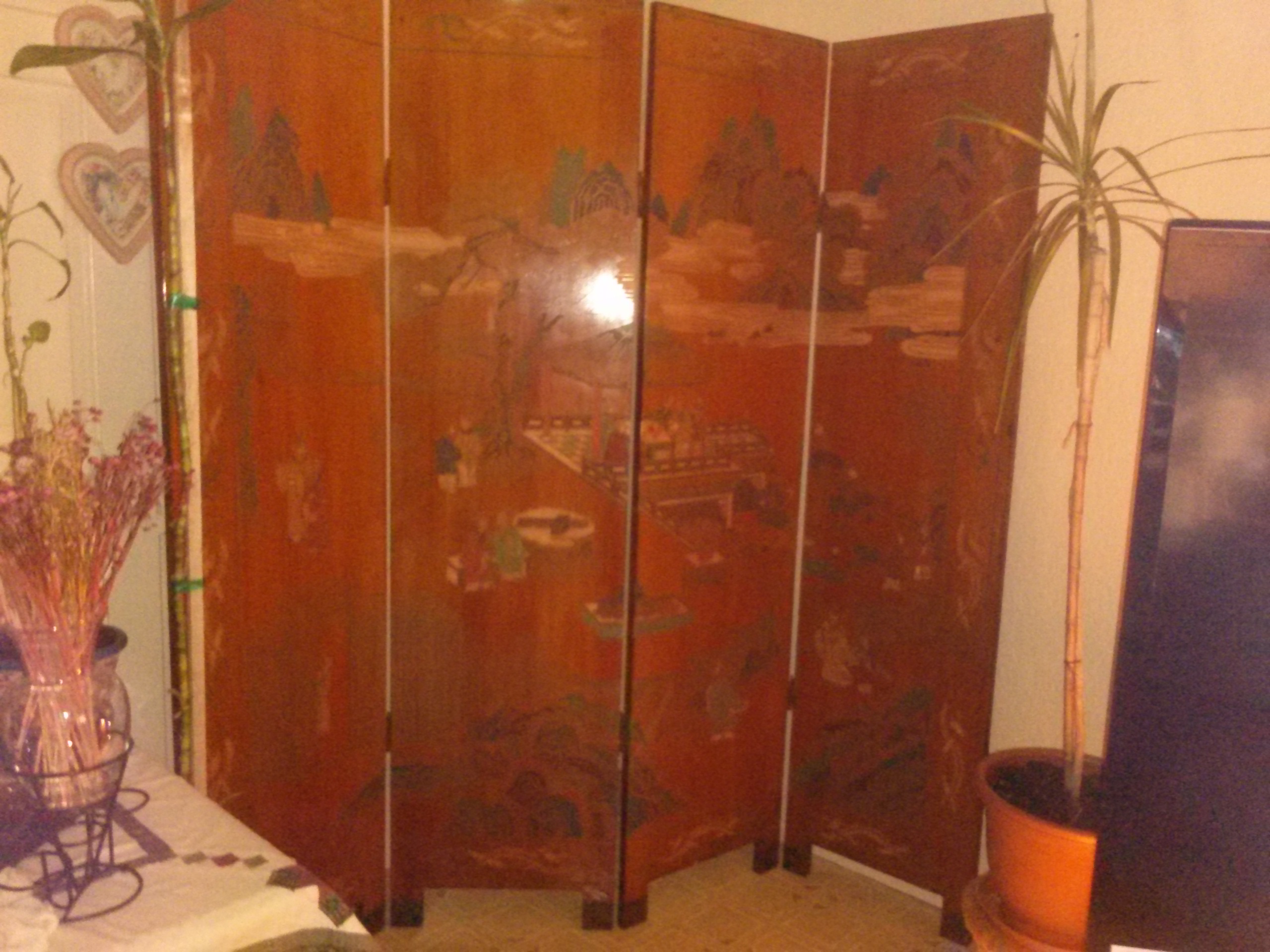 Oriental 4-piece attached wall divider with oriental paintings / etchings on both sides of panels.