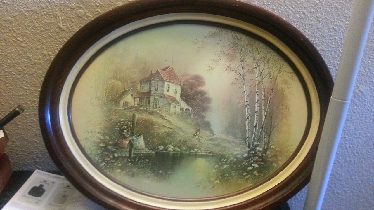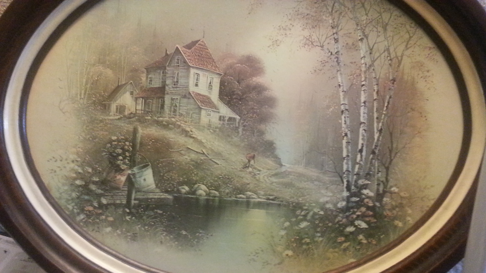 Oval wooden frame landscape. There is a tag on the back of the painting that reads Heart federal savings and loan below that is number 1285-0505894. Written on the back in Pen are 313-312 # 840