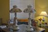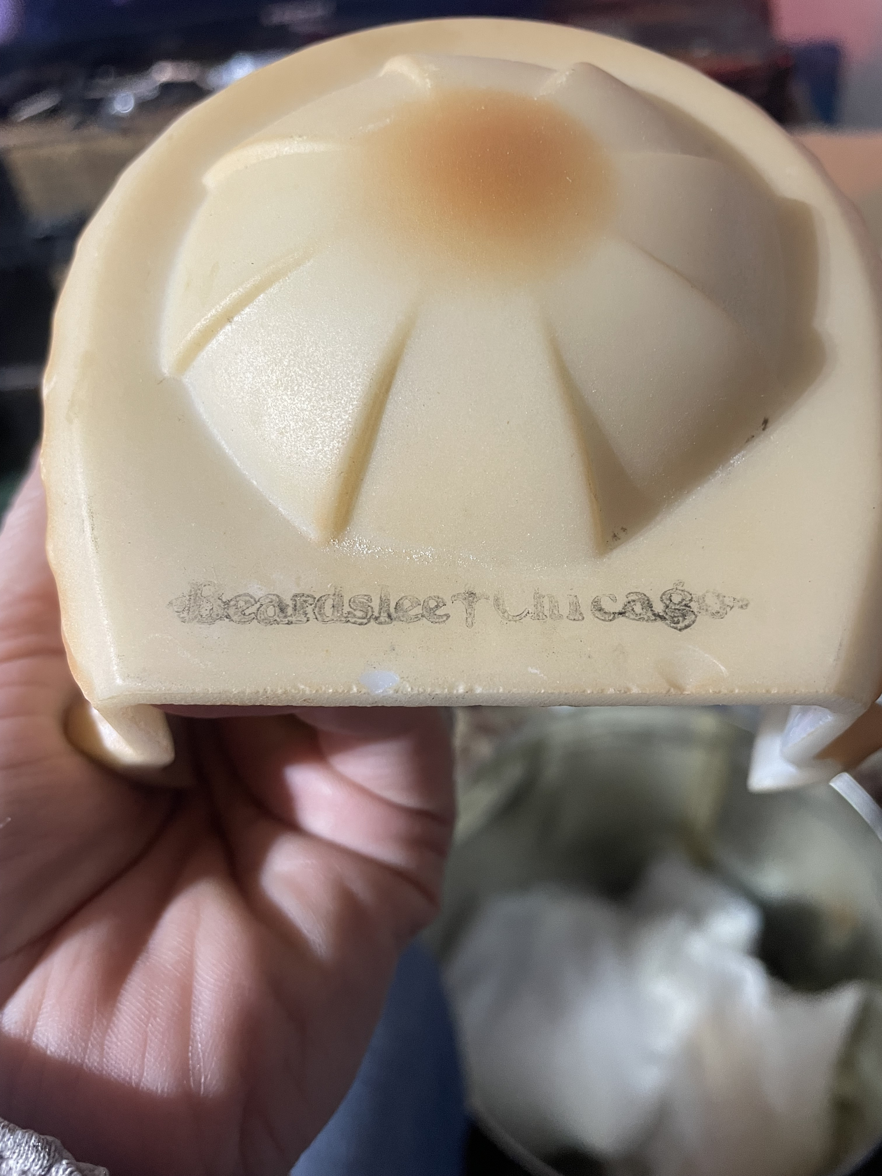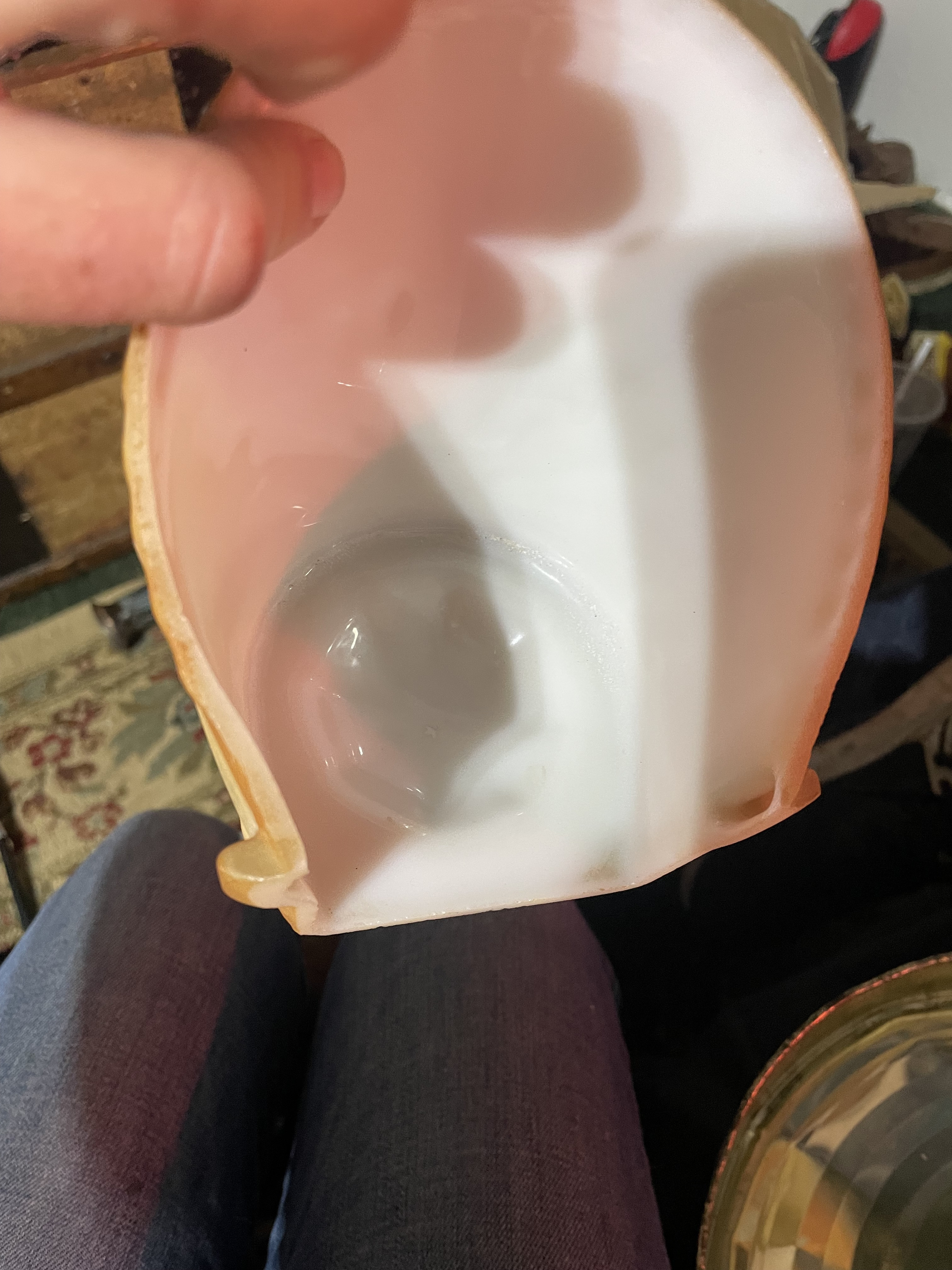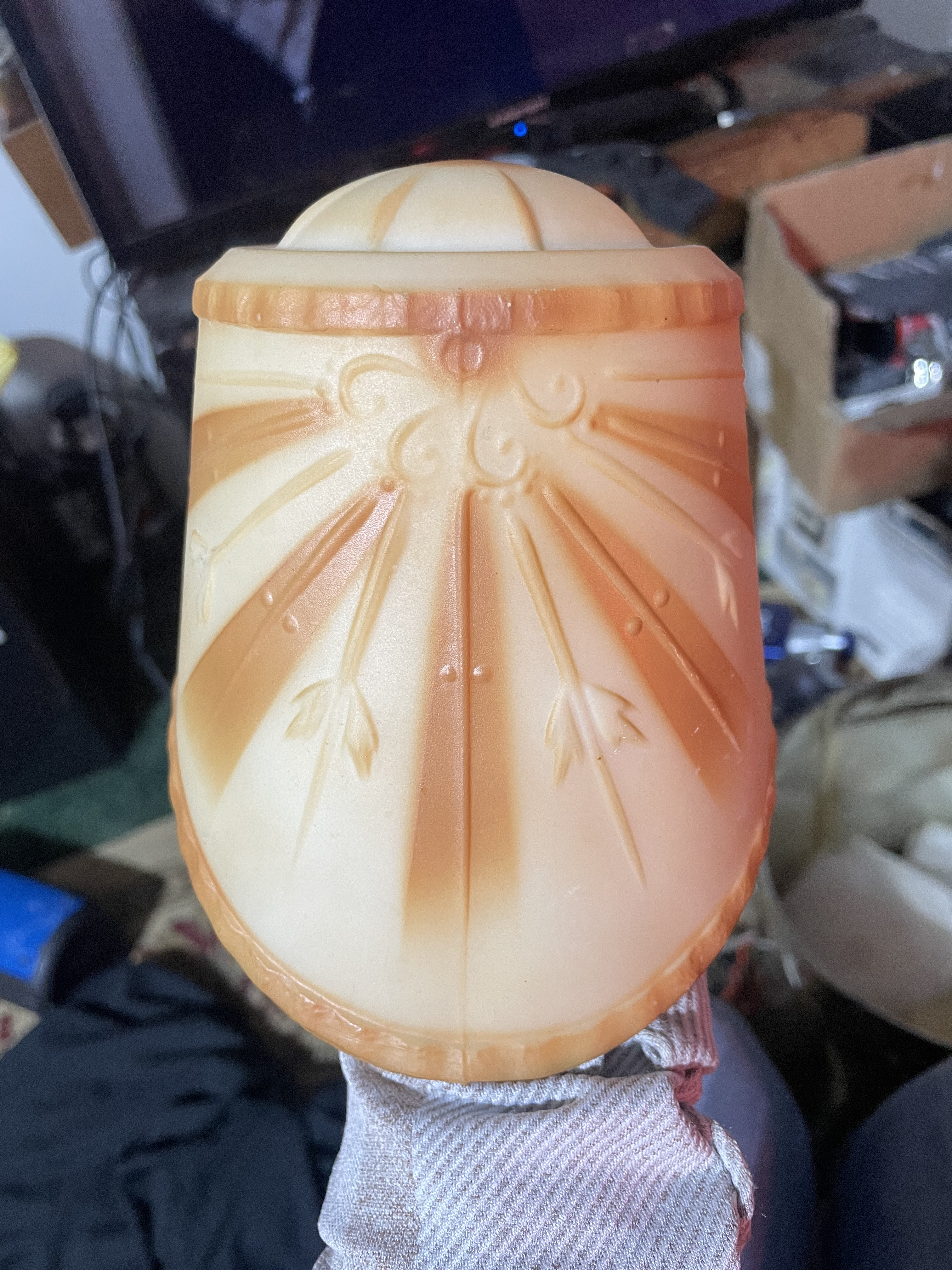The shades are in good used condition, showing no breaks or cracks. The colors remain strong and vibrant, with a light creme/beige exterior and a white interior. The raised design features darker beige highlights, which enhance the overall aesthetic appeal.