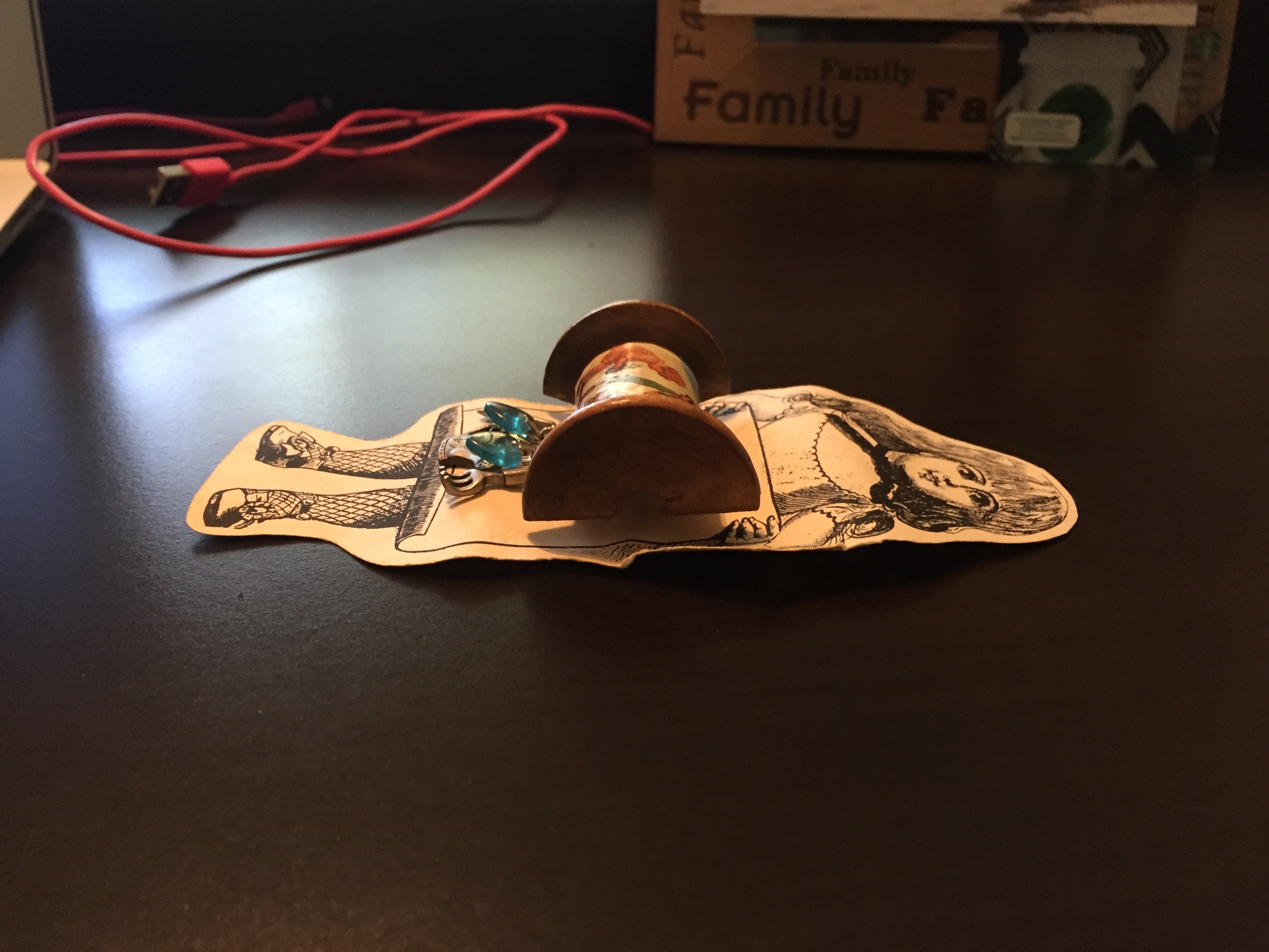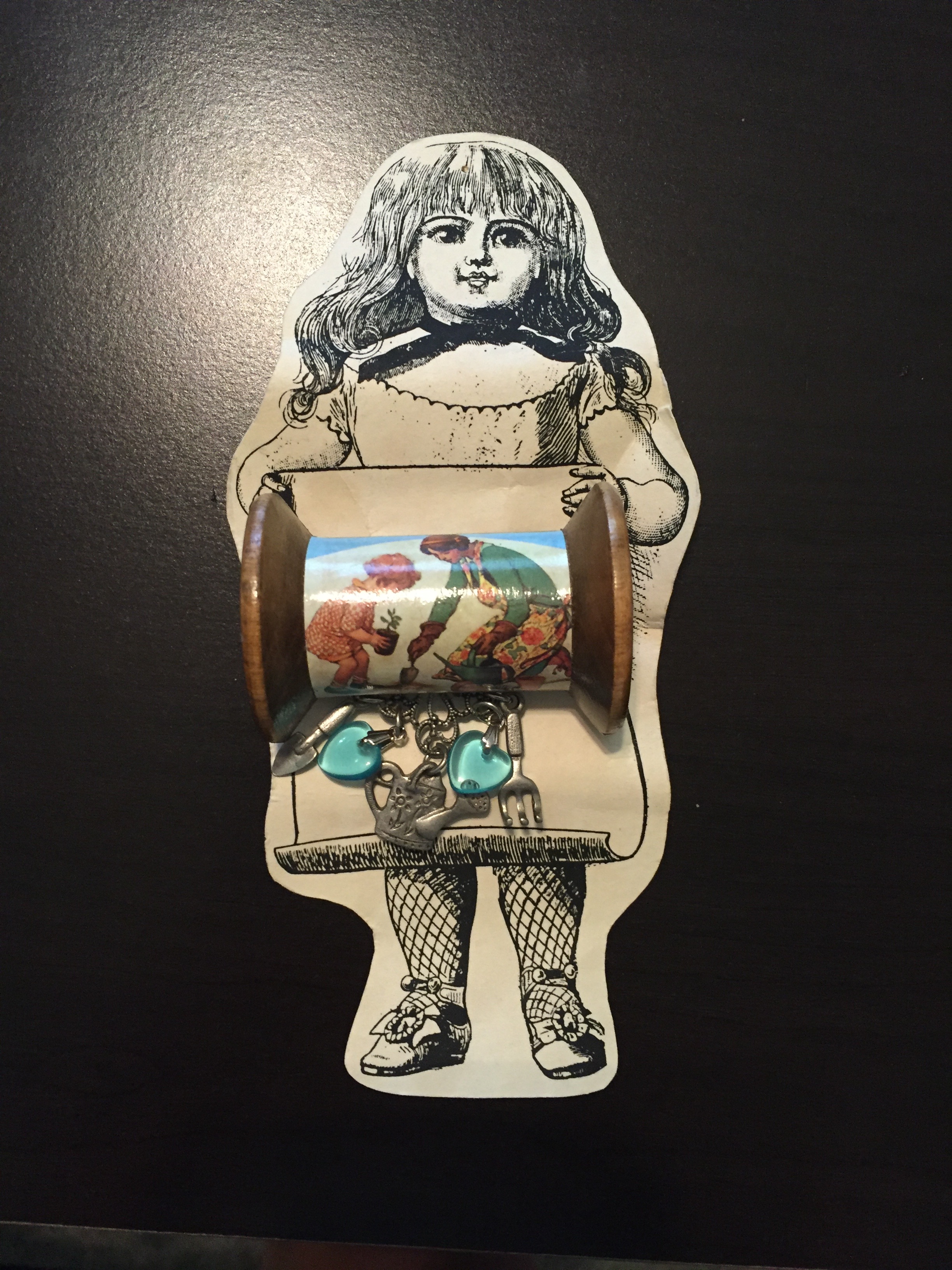 Paper doll holding half spool of thread pin. Pin has an assortment of gardening tool charms.