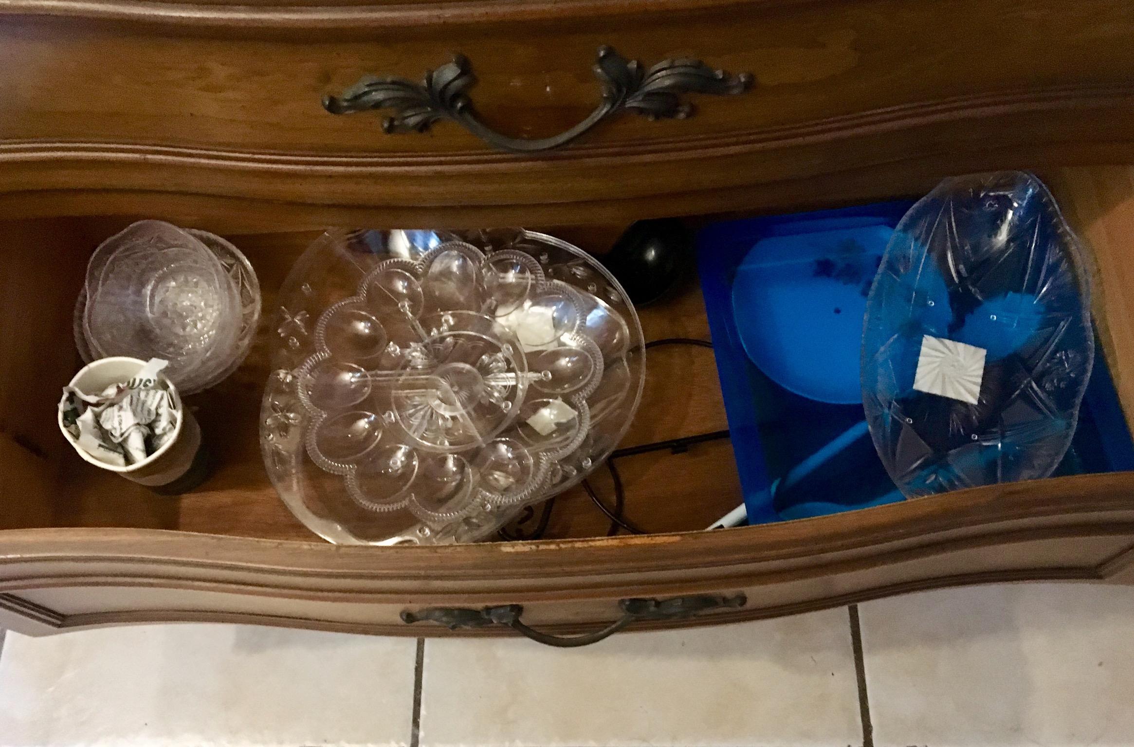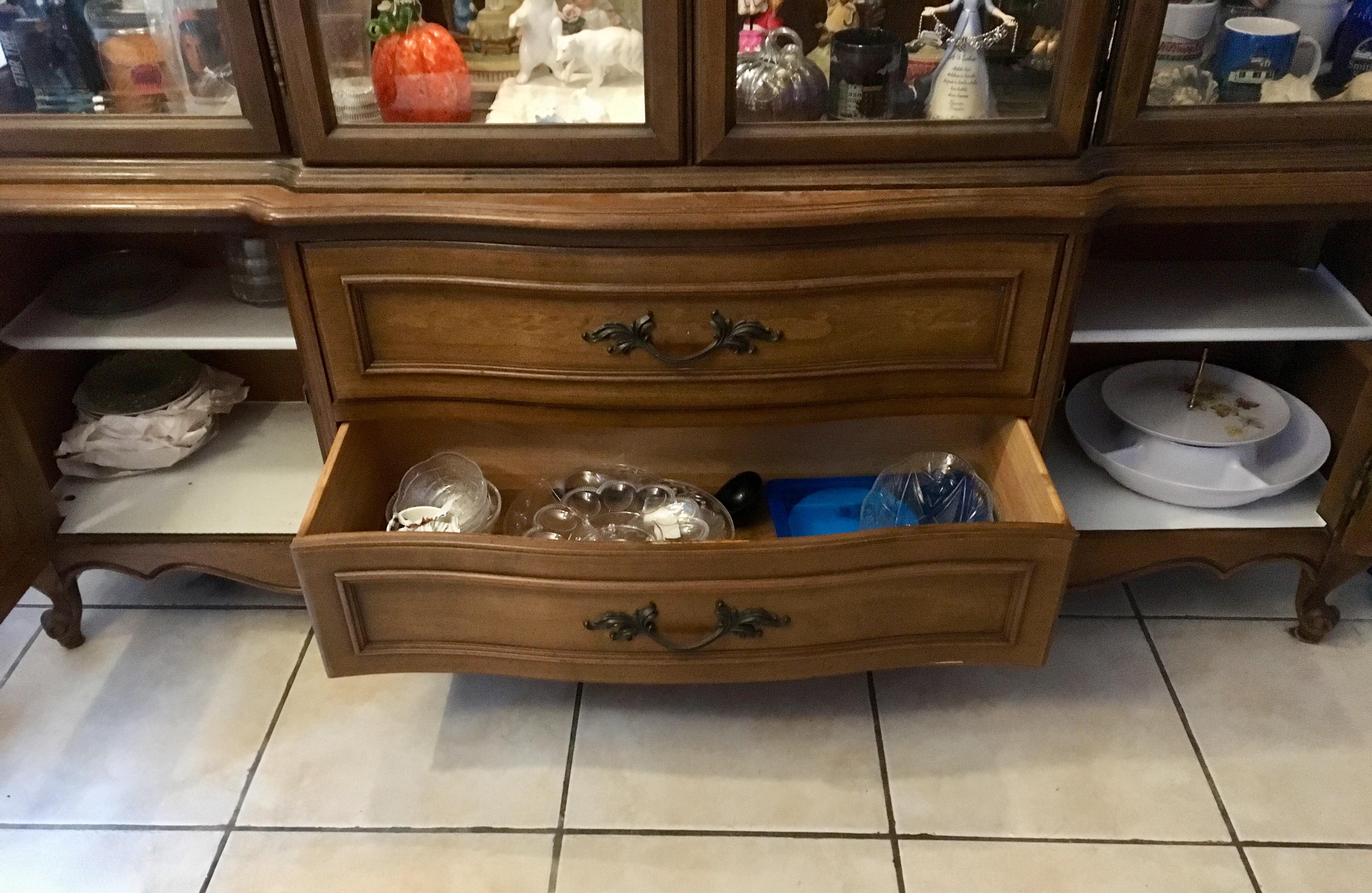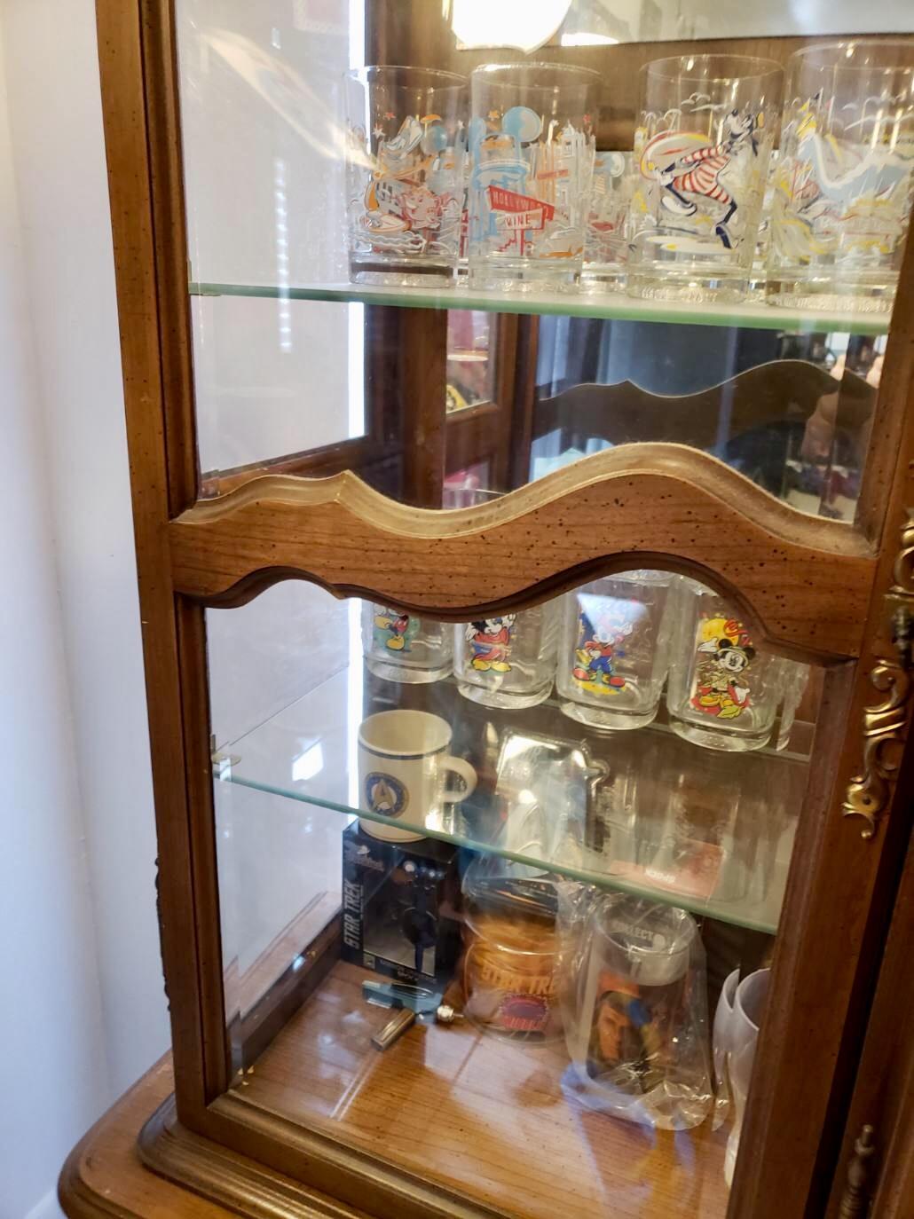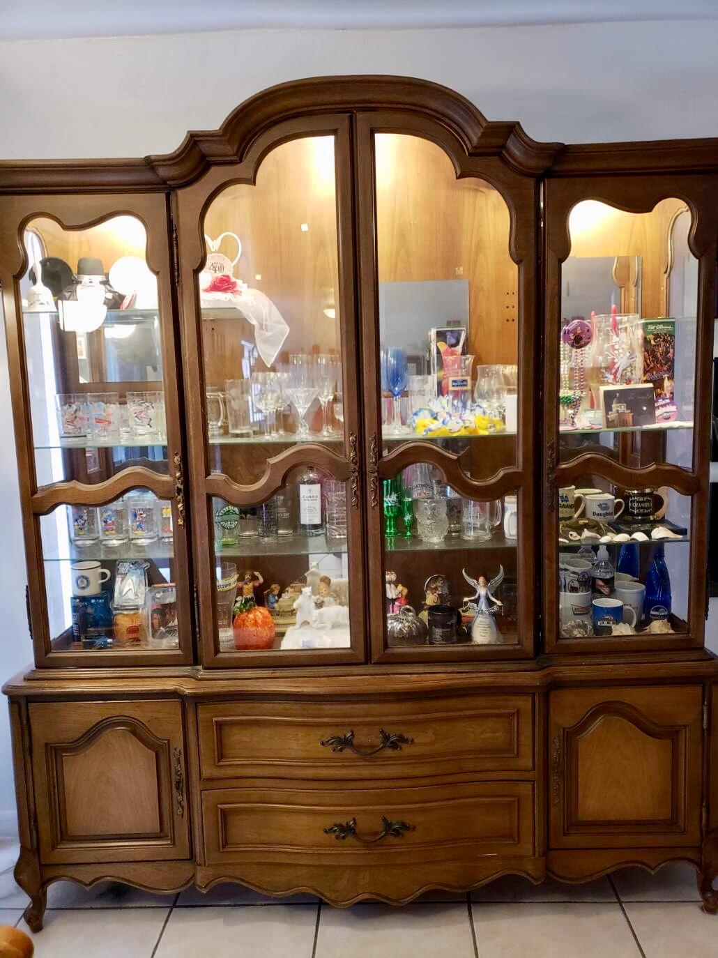 Mount Airy Mantle and Table  pecan wood lighted china cabinet. Beautiful piece with TONS of storage. Glass shelves with plate grooves, one deep drawer and another drawer with silver divider.