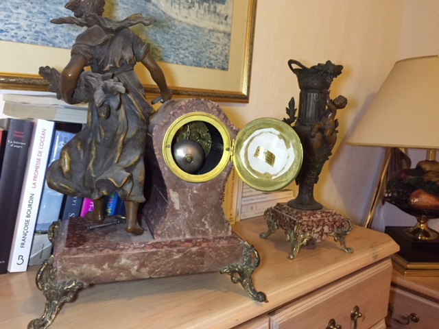 This clock has a pendulum mechanism and works perfectly. It has a centre piece and two accompanying pieces. It is in perfect condition. I don't know anything about the age or maker. Any information as well as a value would be welcomed.