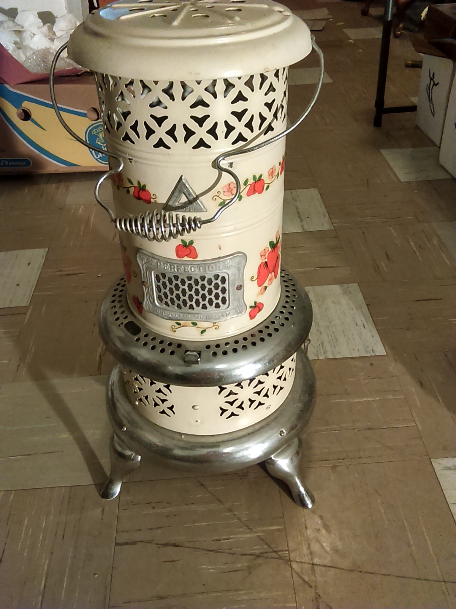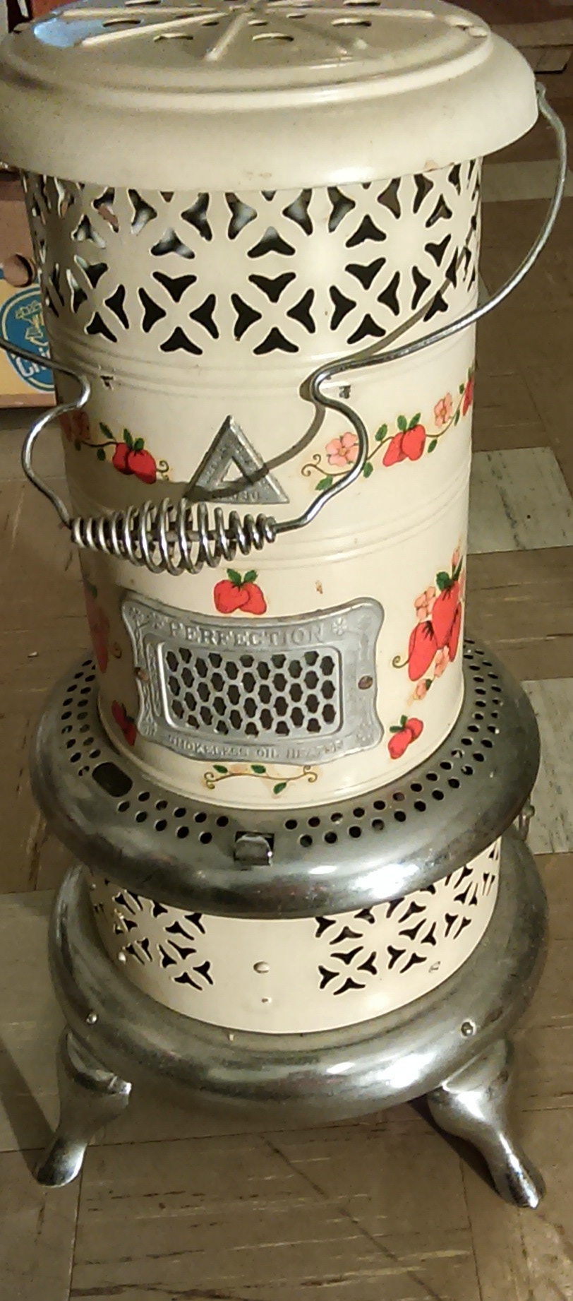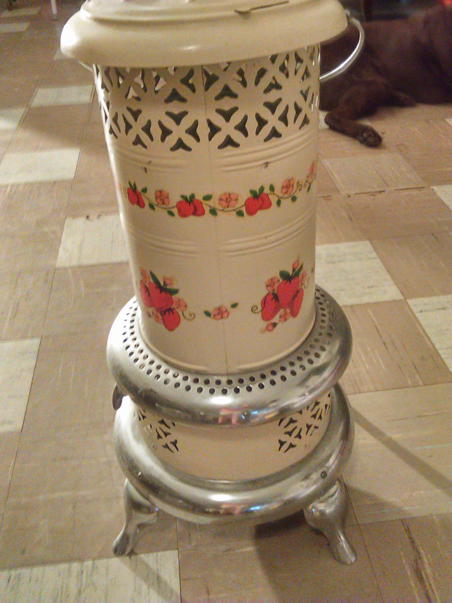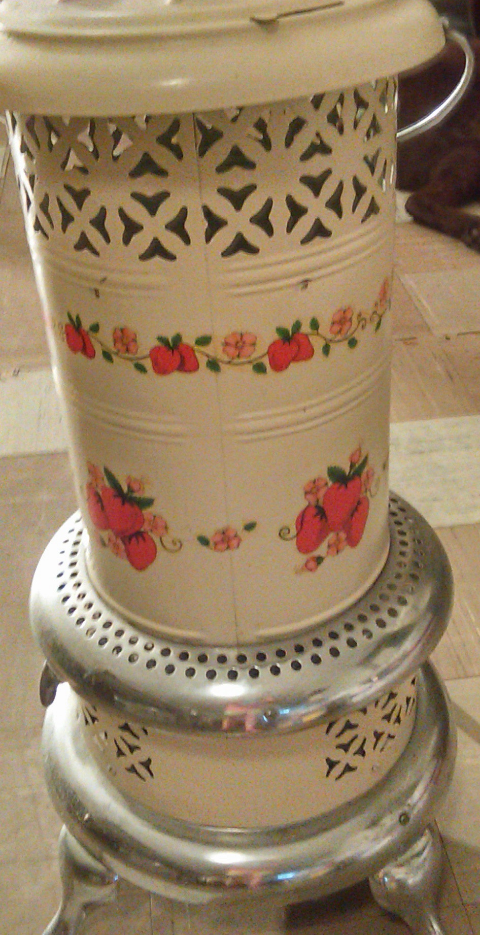 This is lightweight & works great,White with silver trim and strawberries on it.It oils like it's never been used in newer condition