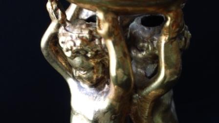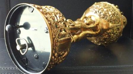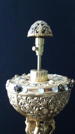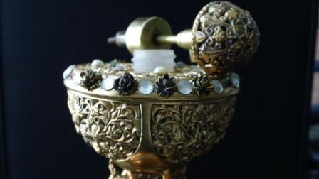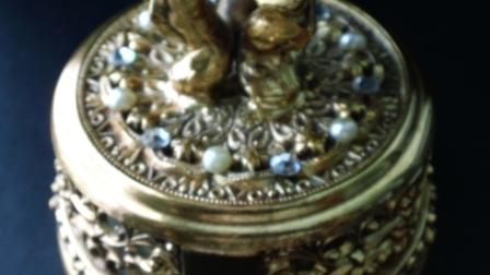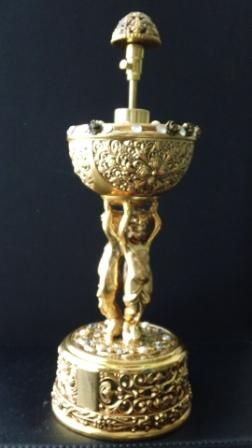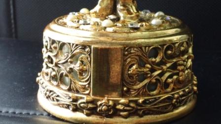 A perfume music box with 3 child holding the upper portion. A little damage on the upper case surrounded with little diamond and pearls. Lower portion were the music box located also surrounded by little diamonds and pearls.
