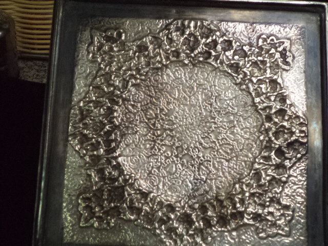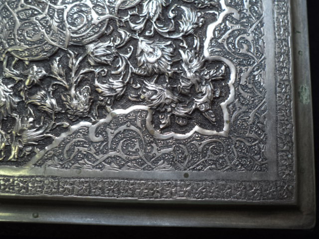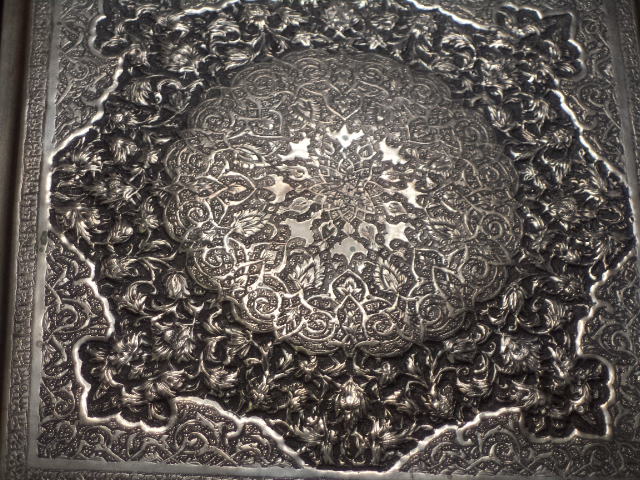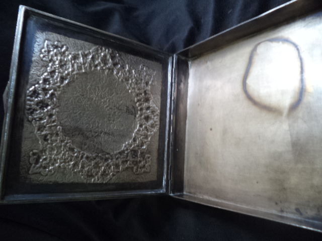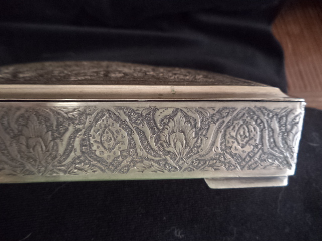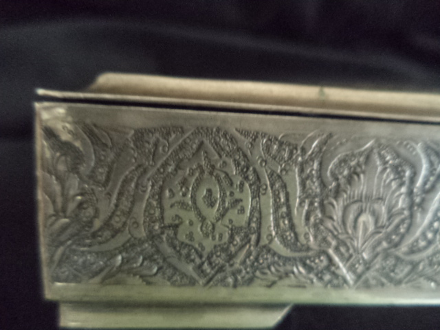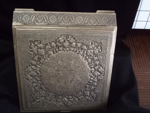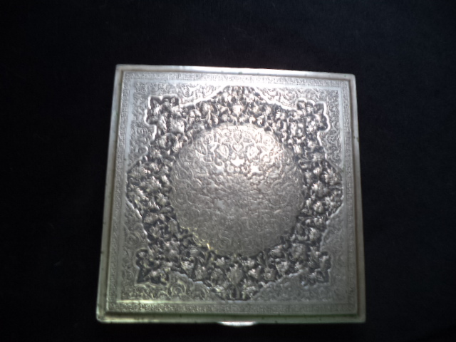 Silver, NOT plated, square Persian trinket/jewelry/tobacco box with repoussed hinged lid and etched sides. Measures 6 3/8" x 6 3/8" x 1". Four "L" shaped feet. Ornate floral with round center on lid and Islamic motifs on sides. Looks like other designs that I have seen from Qajar dynesty ca. 1900. Box has a "golden" patina. It was never machine polished, but a little bit of Tarnex residue is visible in some places if held at an angle. There are some small surface oxidation spots around the edge of the lid. There is a hallmark, but it is tiny and I can't read Arabic (See photos). I have 5 photos of it but only posted 2. There is no Russian "84" silver mark that I have found. This box is in very good condition with no wearing down of the etching. It has no damage and no reparis. Hinged lid works smoothely. There are a few small knicks here and there due to age and use. The box is from my mothers estate. She was in Russia and in the middle east. She got it one place or the other in the late 1950's. This is a heavy box, but I don't know the weight.