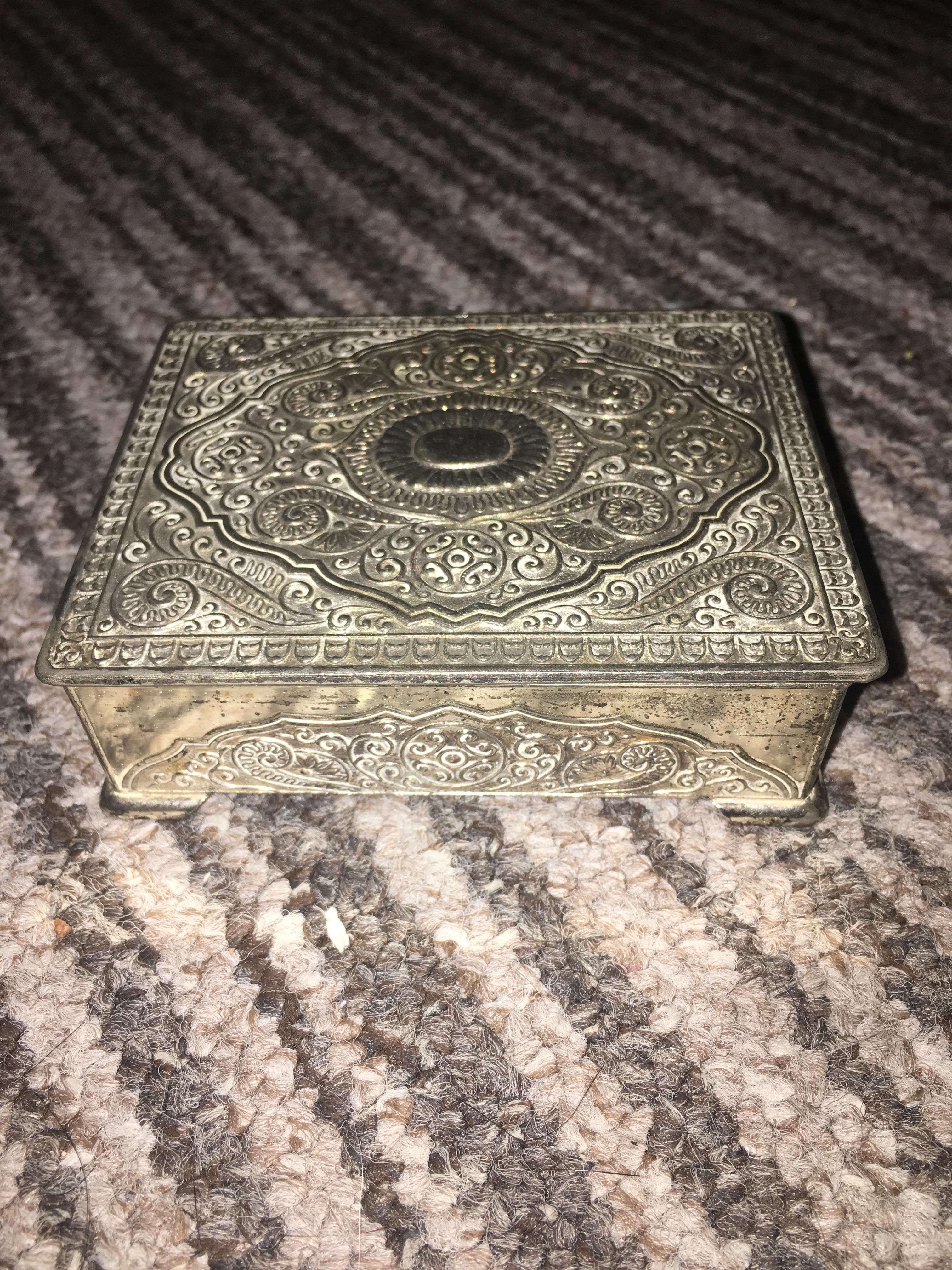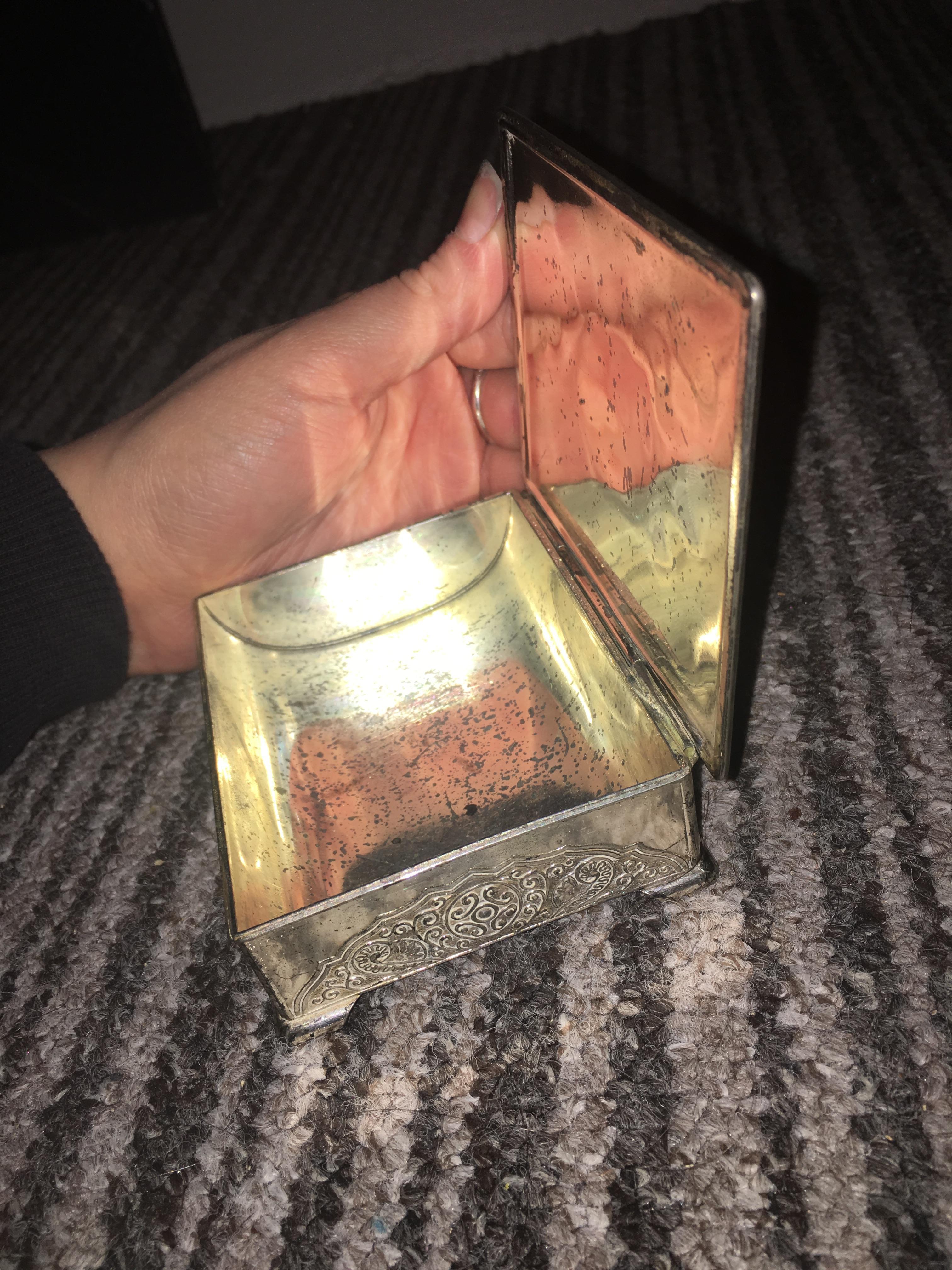 potentially persian silver cigarette box, tarnished and old. strange hallmark printed on the bottom - can’t find what it means though. very heavy item.