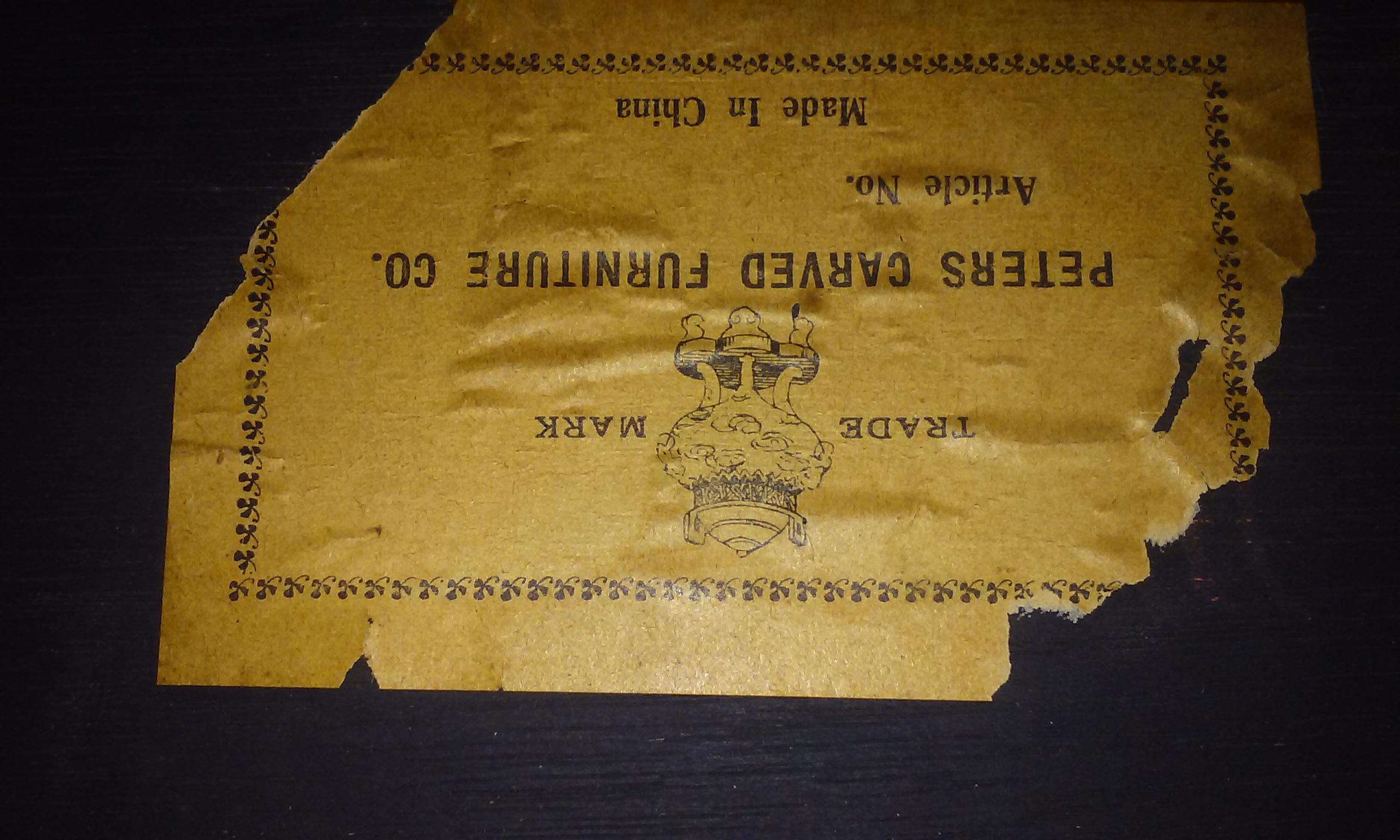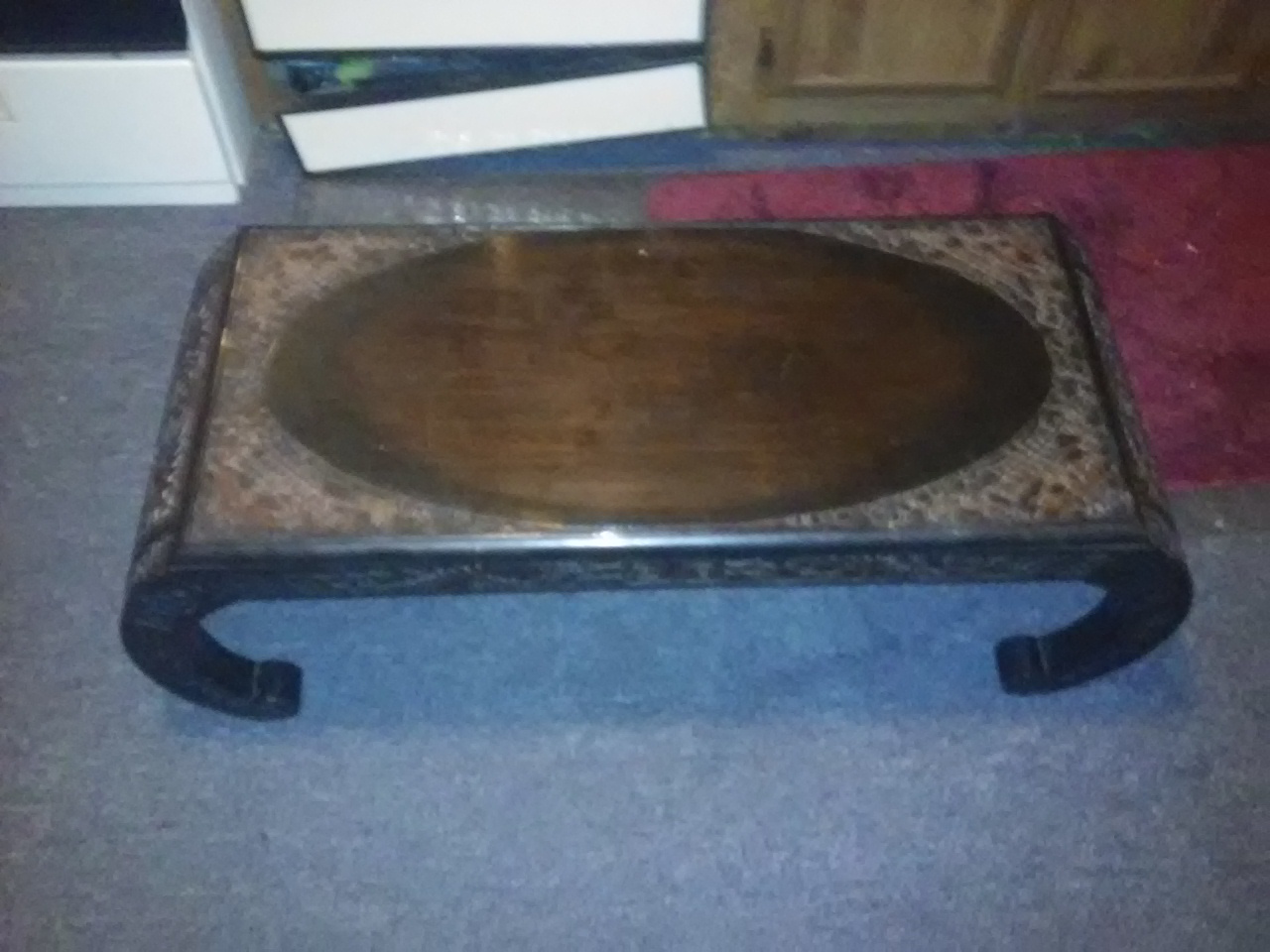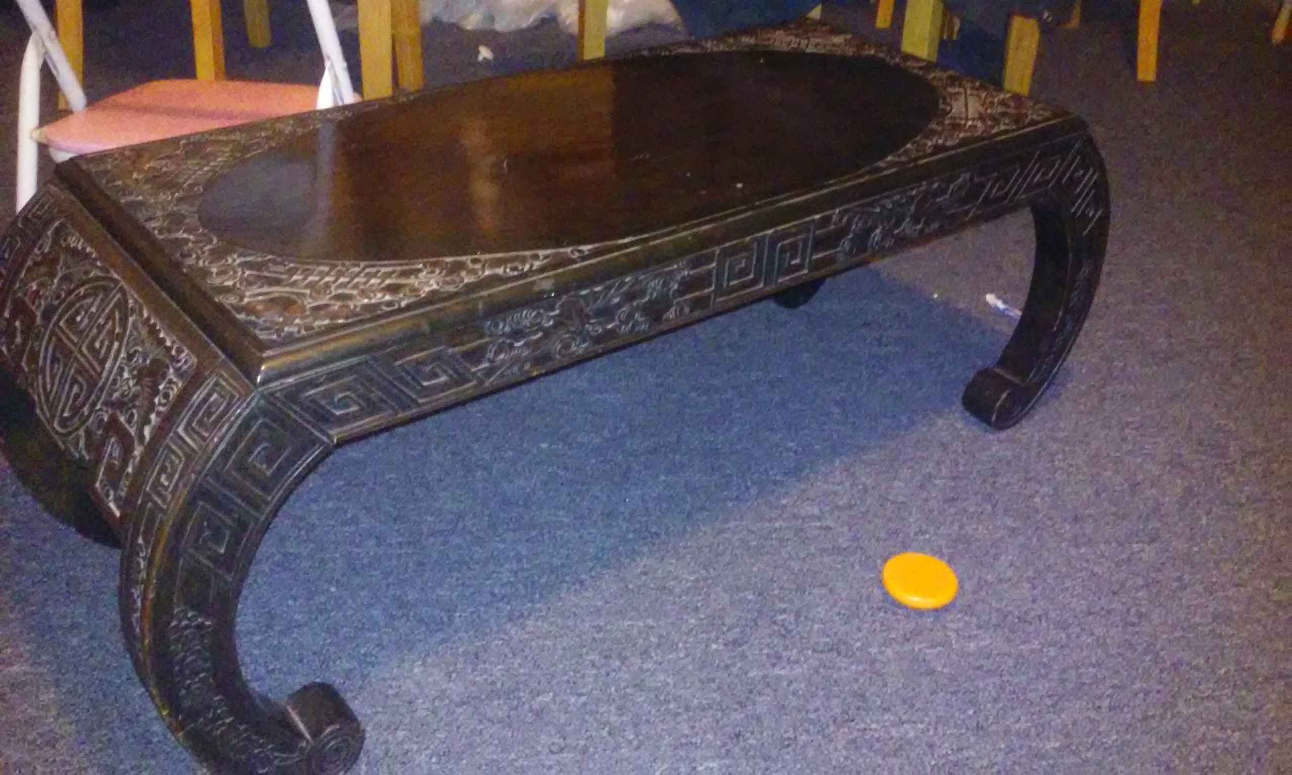 Dark wood table Asian design. All hand carved. Really old label on bottom. But can't find any info.stand about 2 feet tall and about 4 feet long.