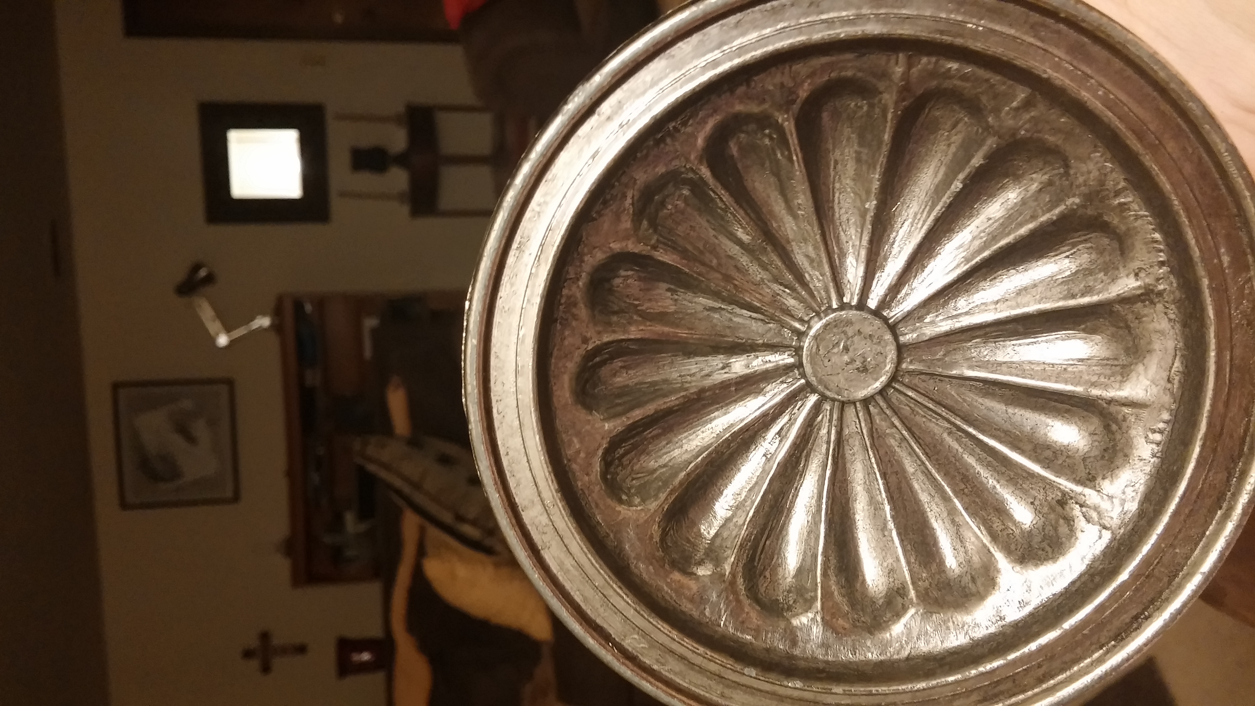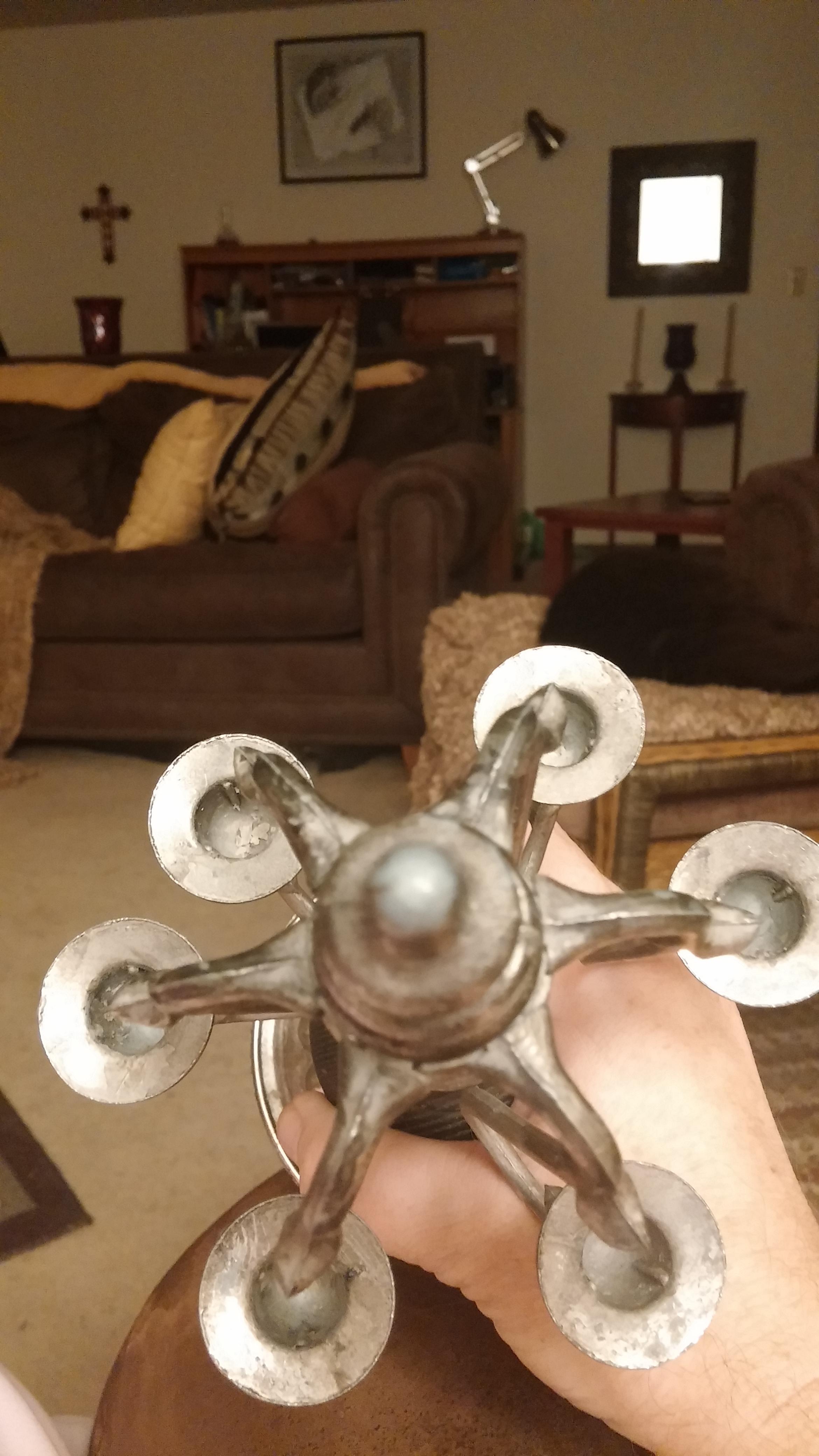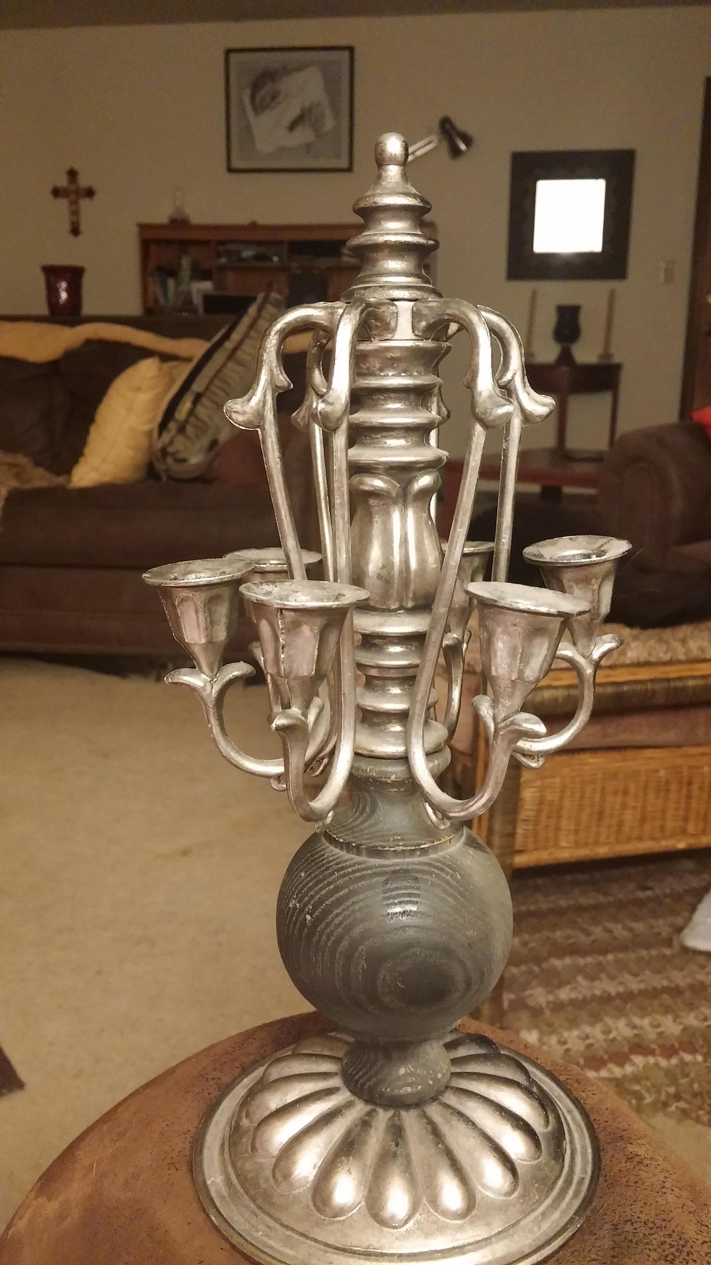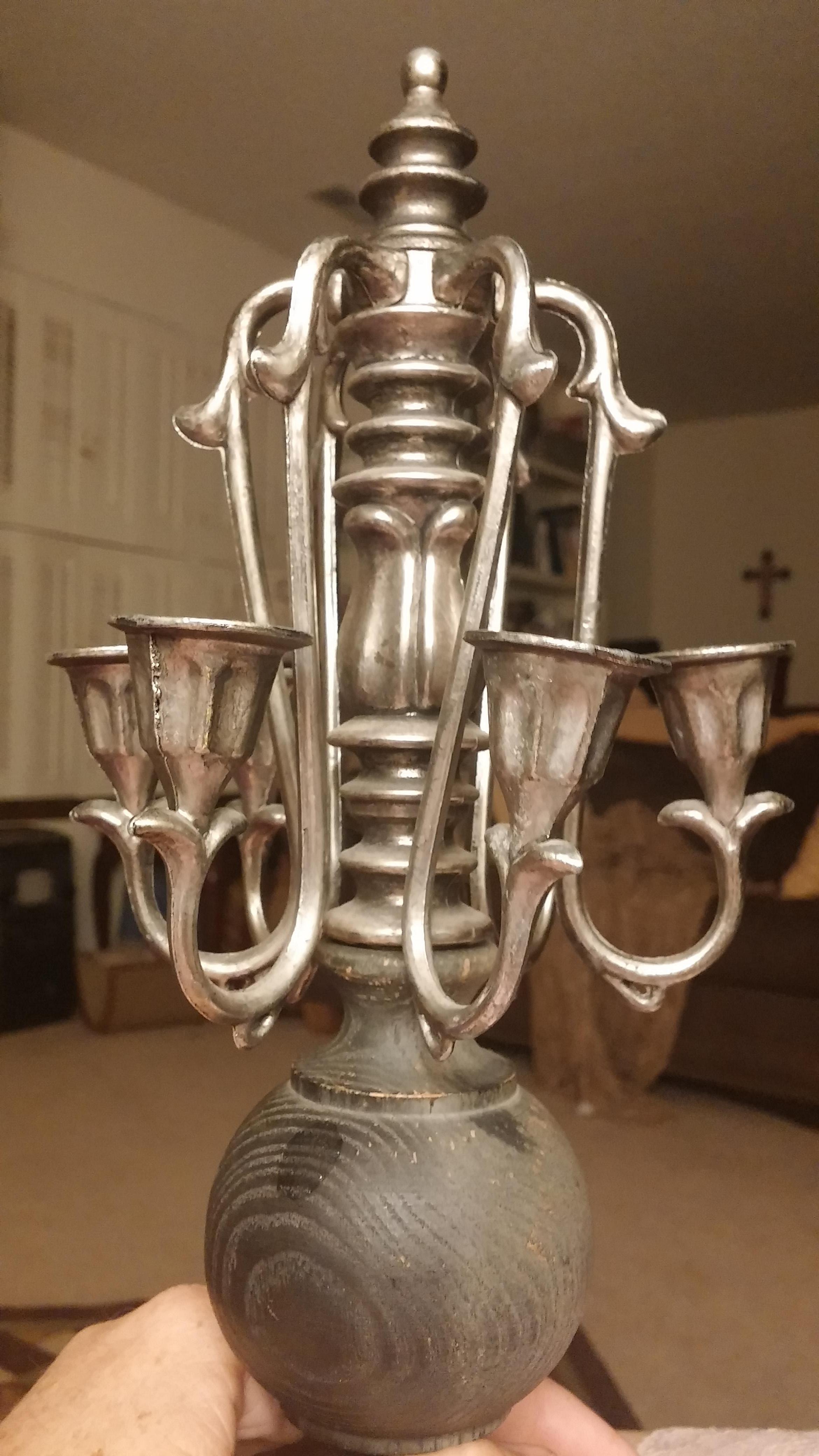 I purchased this at a yard sale about 18 years ago & it has just sat on my shelf. I believe the metal to be pewter, as I see know markings and it hasn't tarnished. The candle holders themselves seem to be in the shape of flowers. The candles they hold would have to be quite small. The handle part is made of wood and turns. I don't know what type of wood. The base is pewter. Any info would be much appreciated. Thank you.