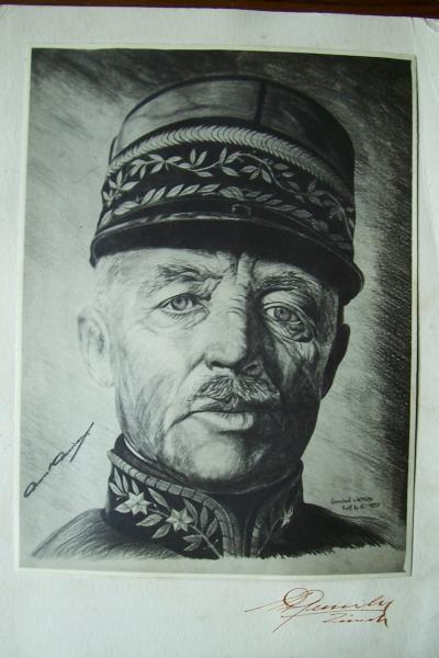 This old photo is I think a photo of a sketch maybe. I am not sure. It looks like it may have been drawn then photographed. It is of an older man wearing a uniform I think, His uniform has stars and leaves and vines along it. as does the hat he wears. Any info on this item would be fantastic. Especially if someone knows who this photo is of. I can't make out what the two signatures say so I photographed them instead. Above his shoulder is the words Gezeichnet v. W. Muller {The u has two dots over it.}Radf. Kp. 16. 1939
