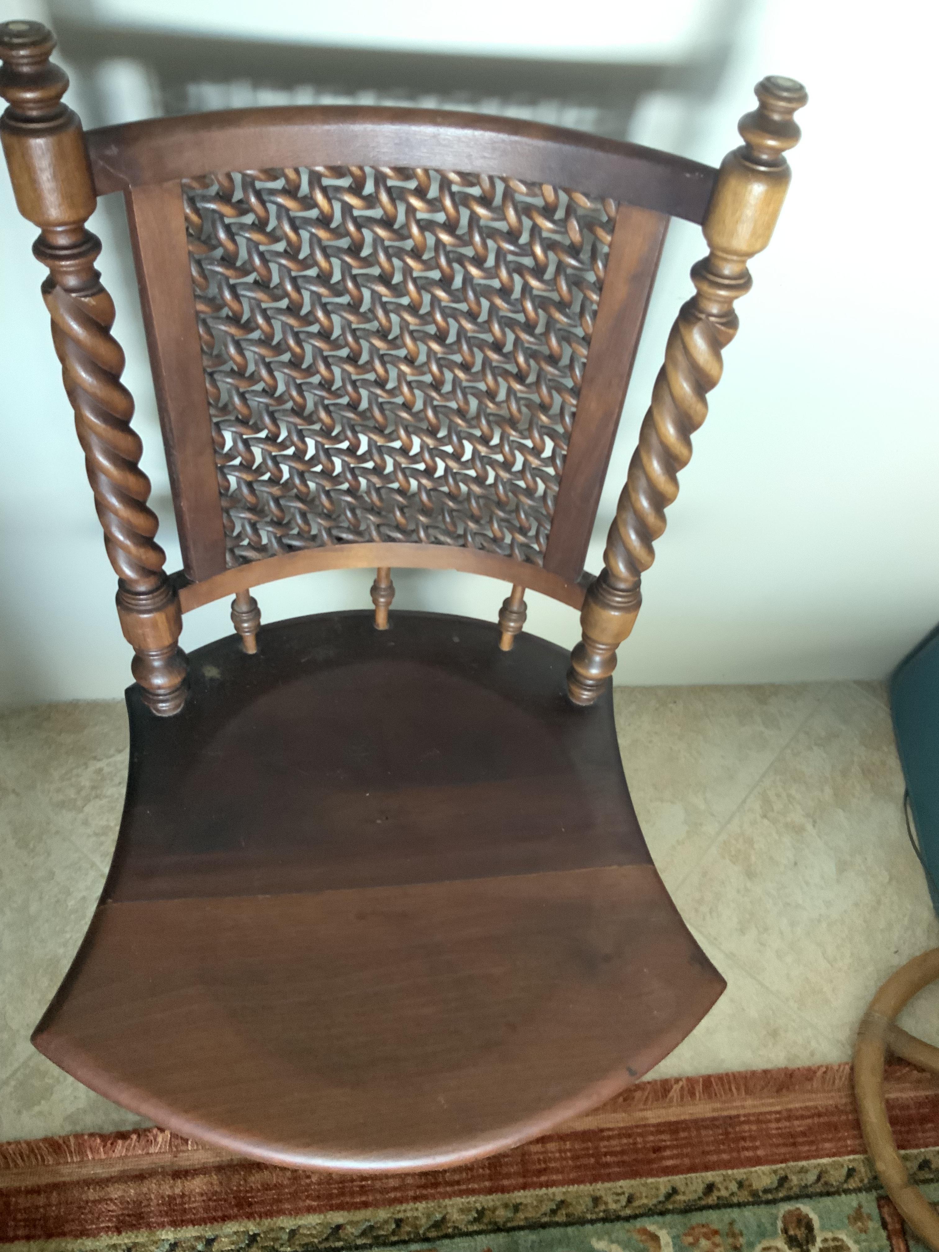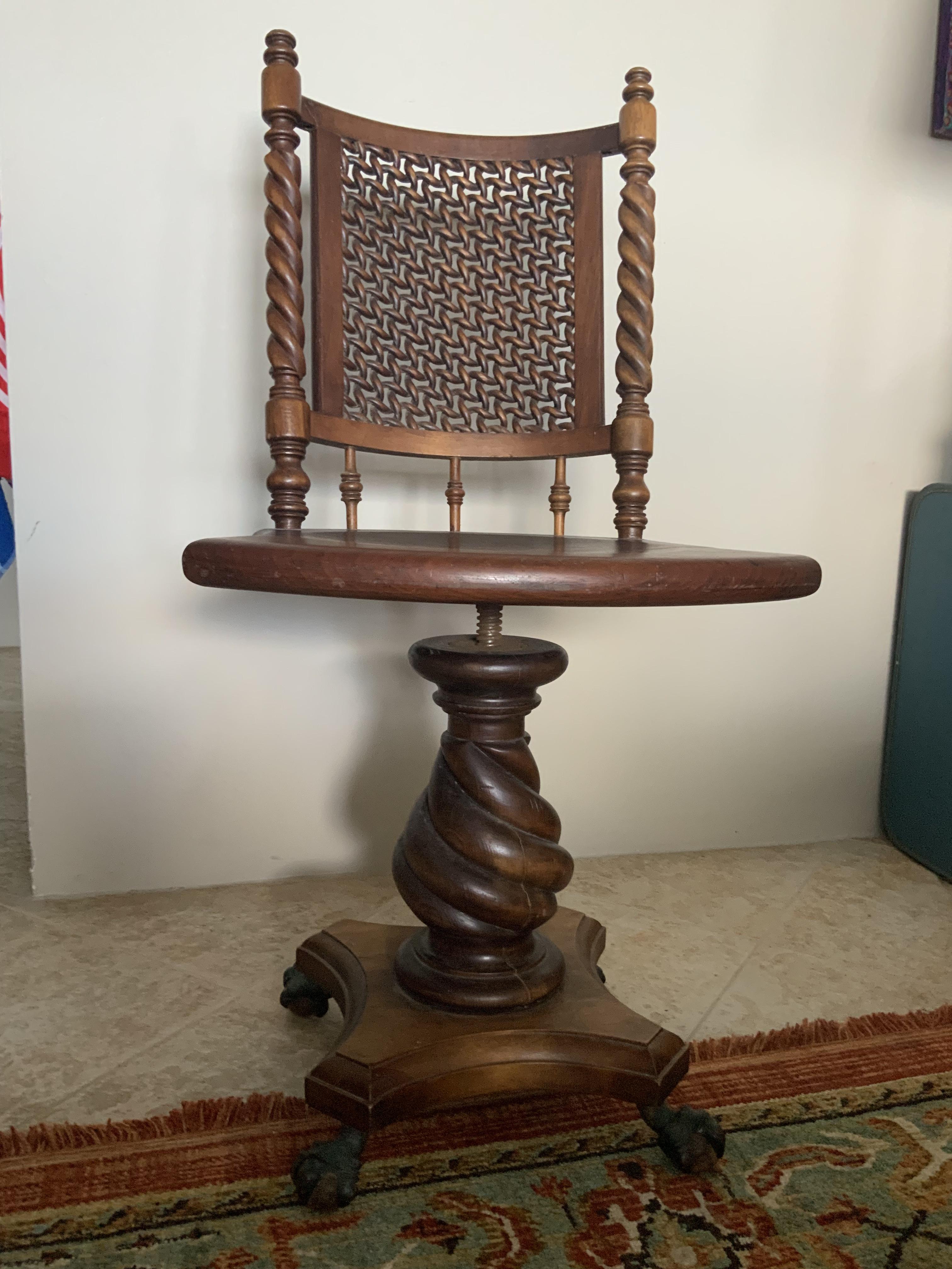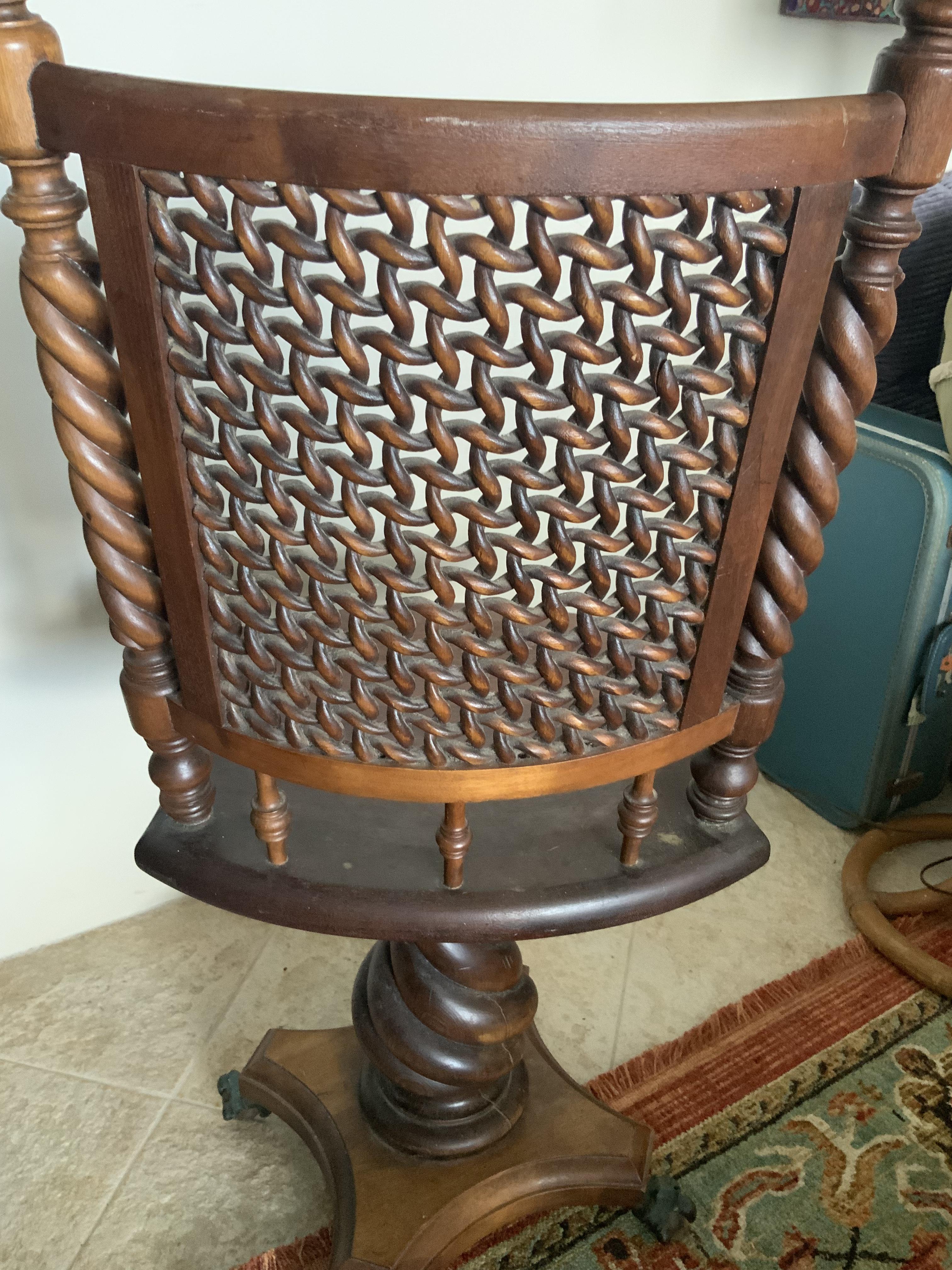 This very unique chair swivels, appears to be hand carved in places (twisty spindles on back, twisted base), has bronze eagle claw feet grasping wooden balls. The metal swivel parts were recently replaced. My mother said it used to have pineapples on top of each side spindle of the back. Apparently those were removed at some point. Passed down in the family, I have no idea what the style is, where it was made. I am interested in knowing anything about it, and I would like to sell it to someone who would love it as much as I have all my life.