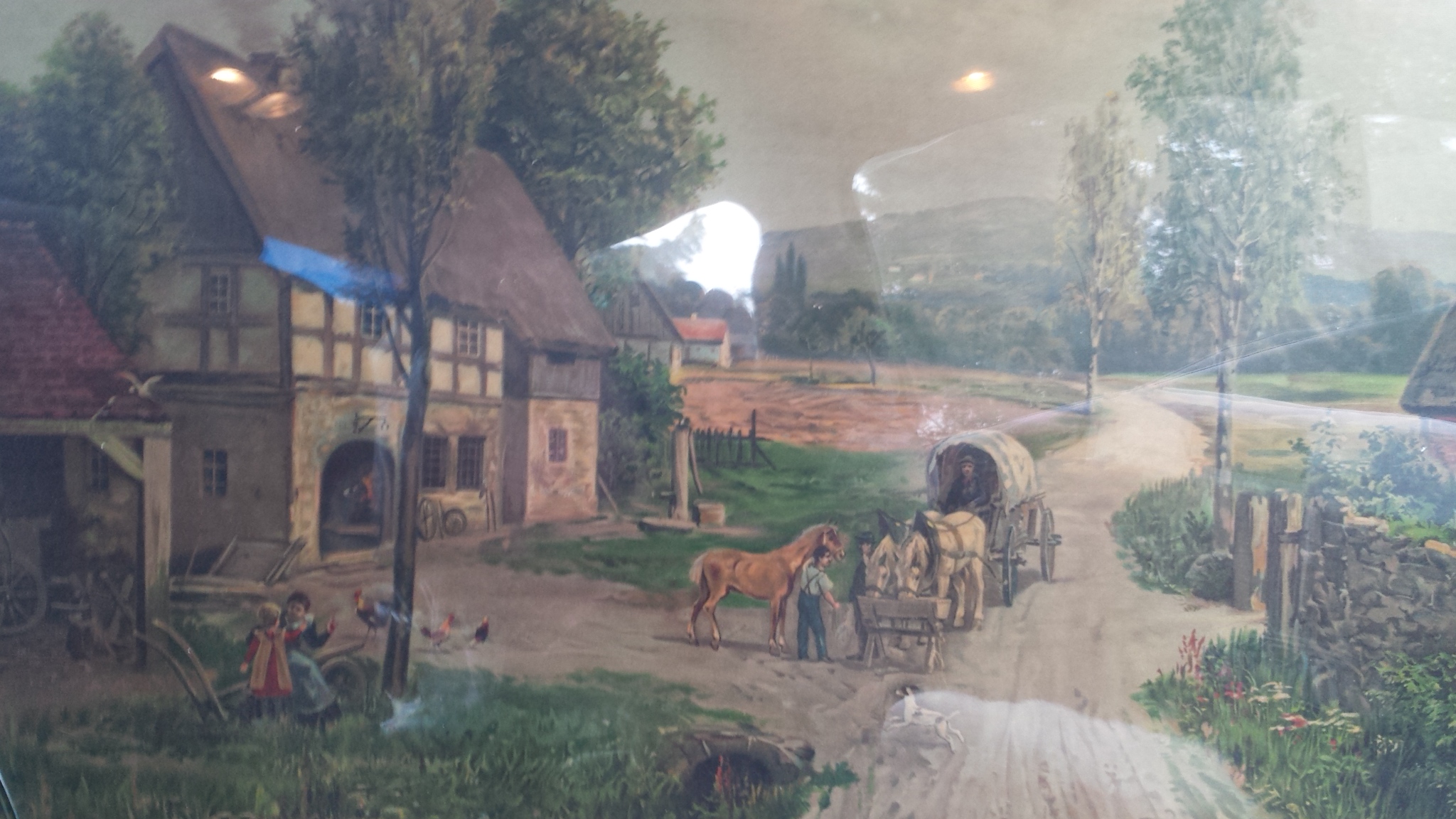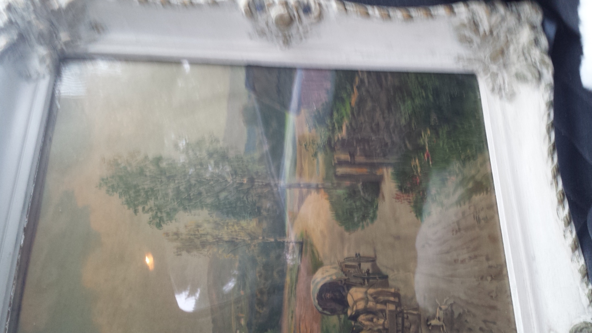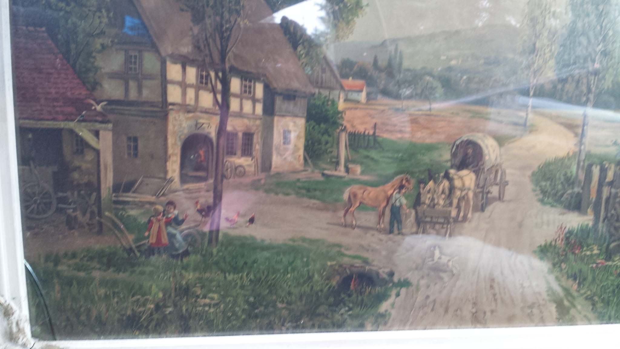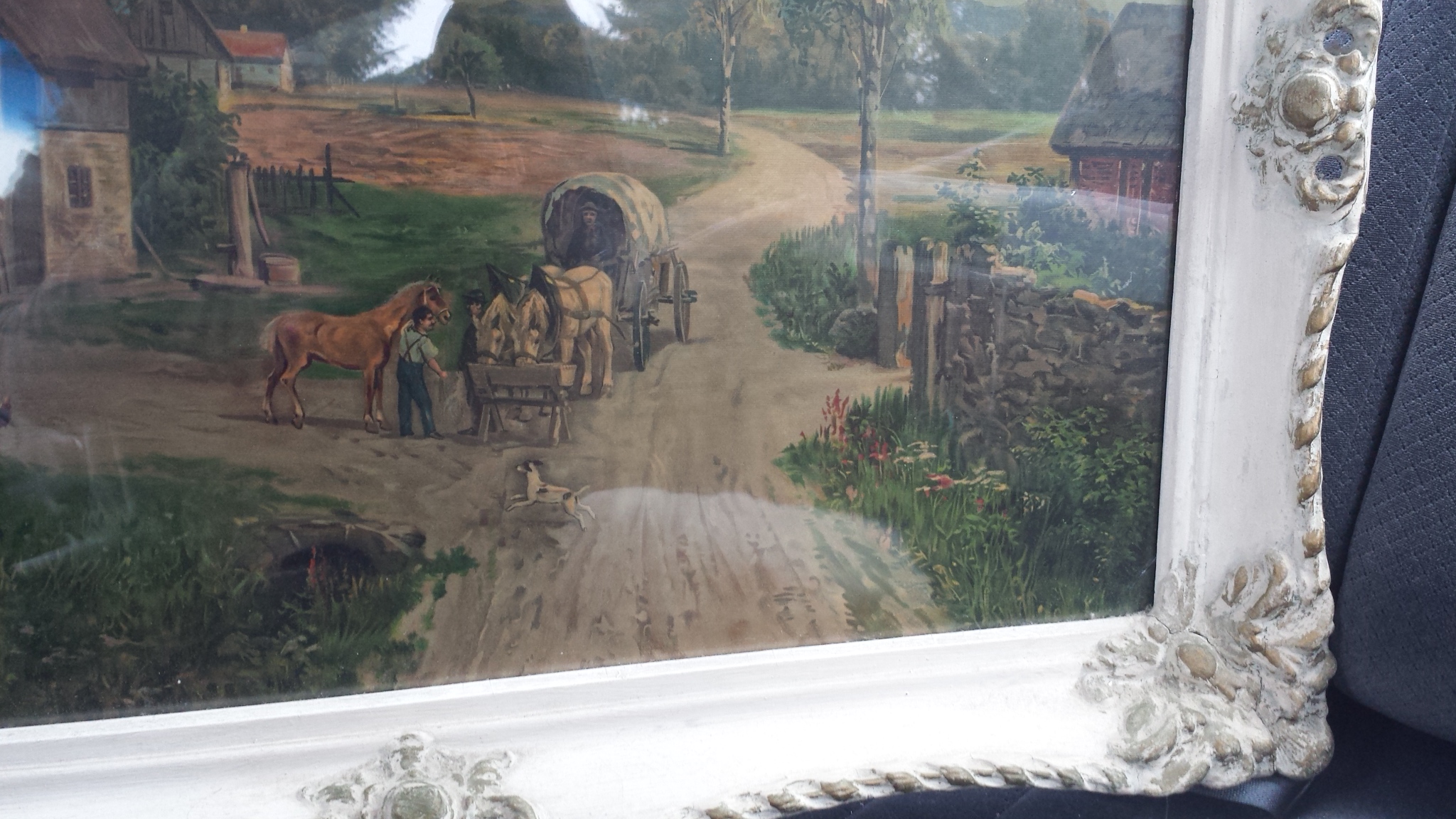 Description The picture is that of a farm scene. There's a cottage, children playing, a dog running, a man walking a horse and another man riding in a horse led covered wagon. The frame has some detail, it's off white with hints of gold showing through.