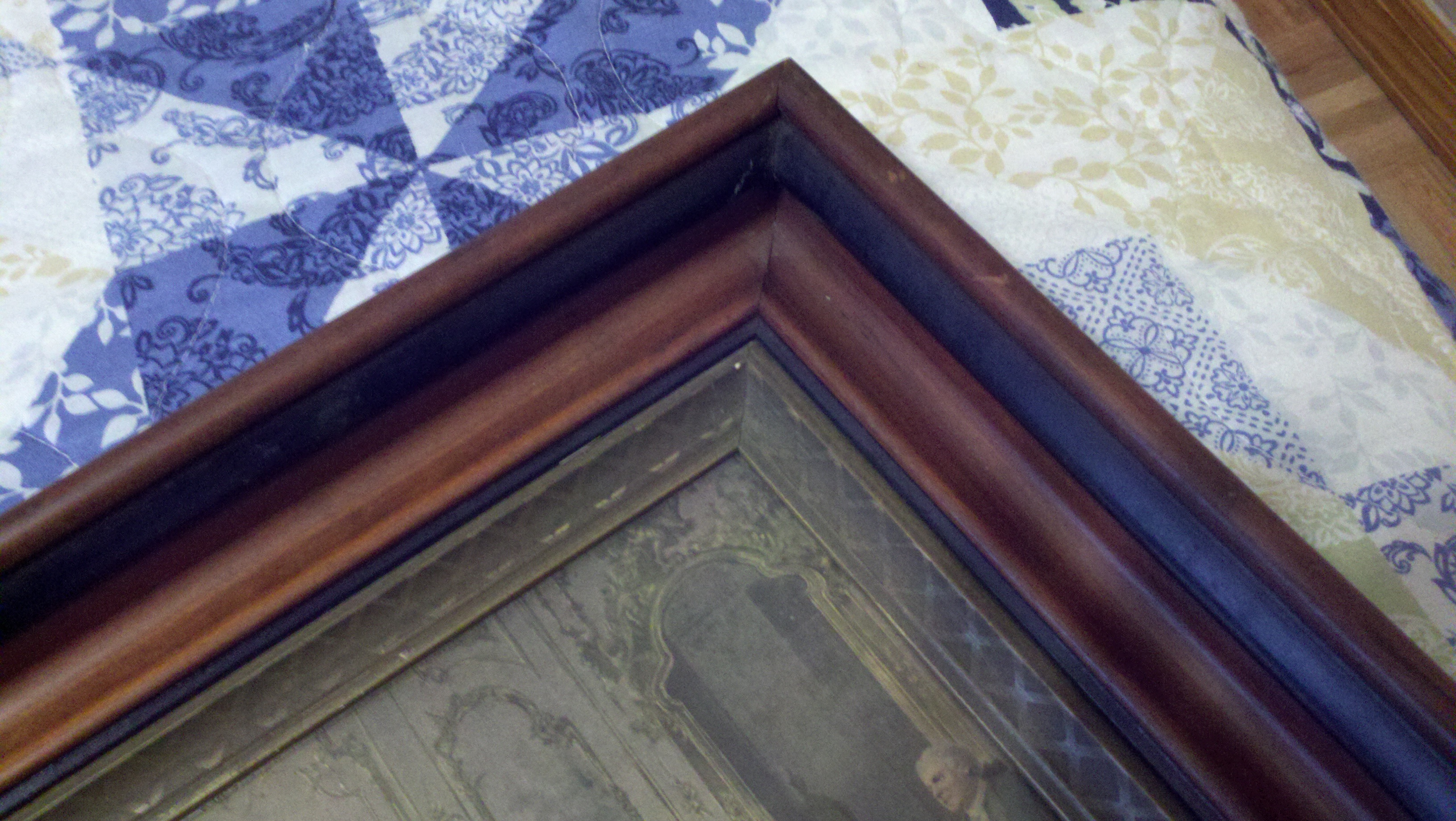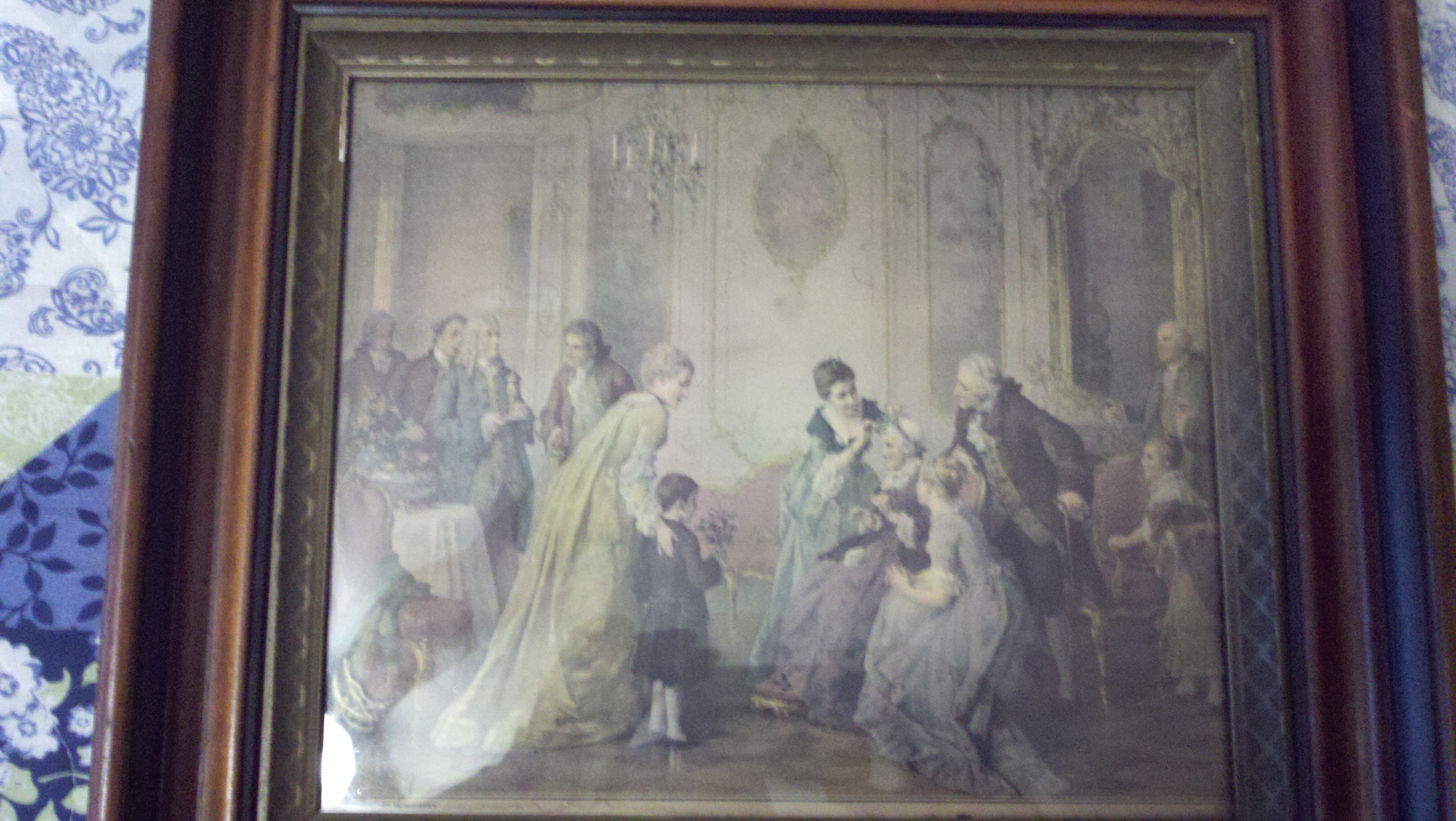 Not sure of the age of this picture frame. It has glass over the picture and it seems to be pitted, like little bubbles in the glass so I'm thinking that it is old. The print itself is called, 'The Golden Wedding' by O Erdmann. Maybe if someone here likes it, best offer if you want it. Thanks for your time