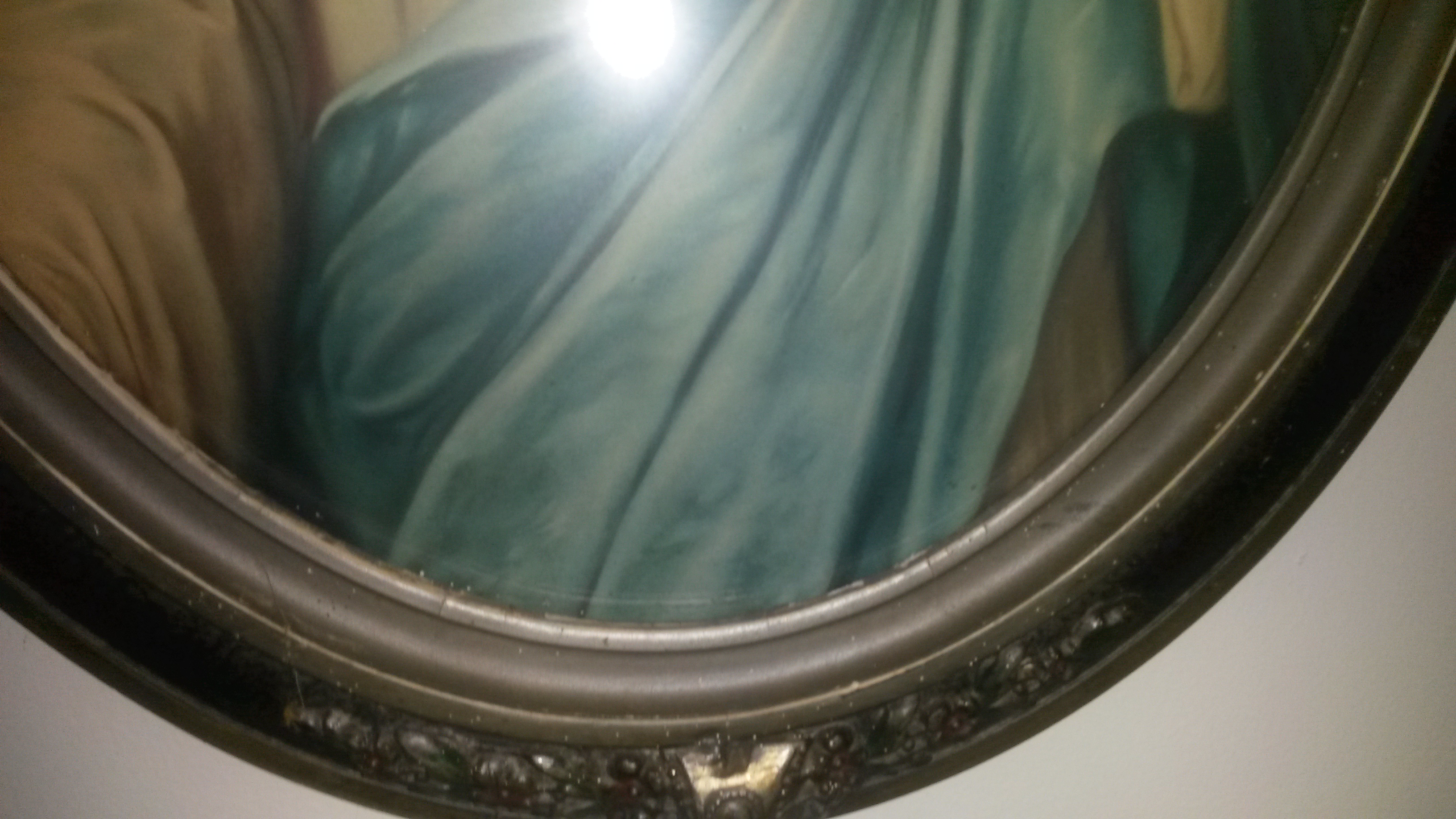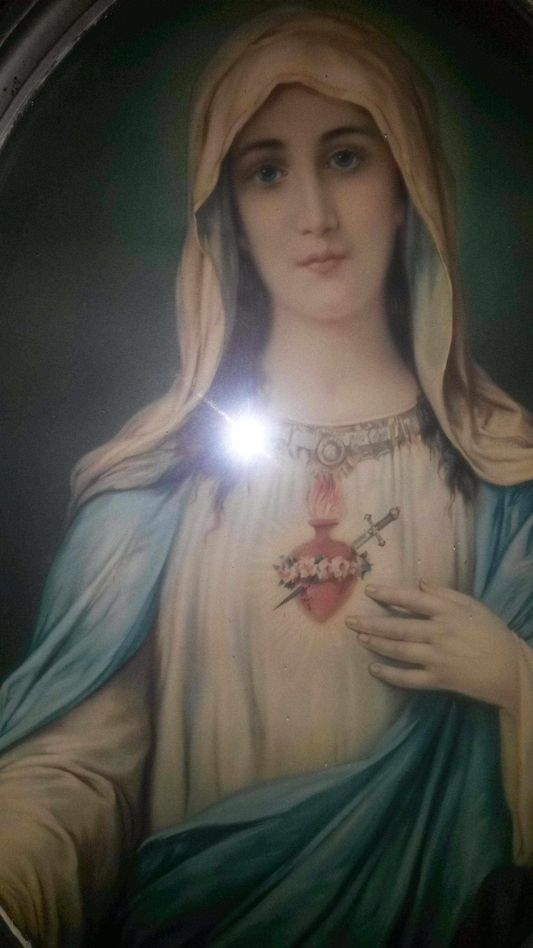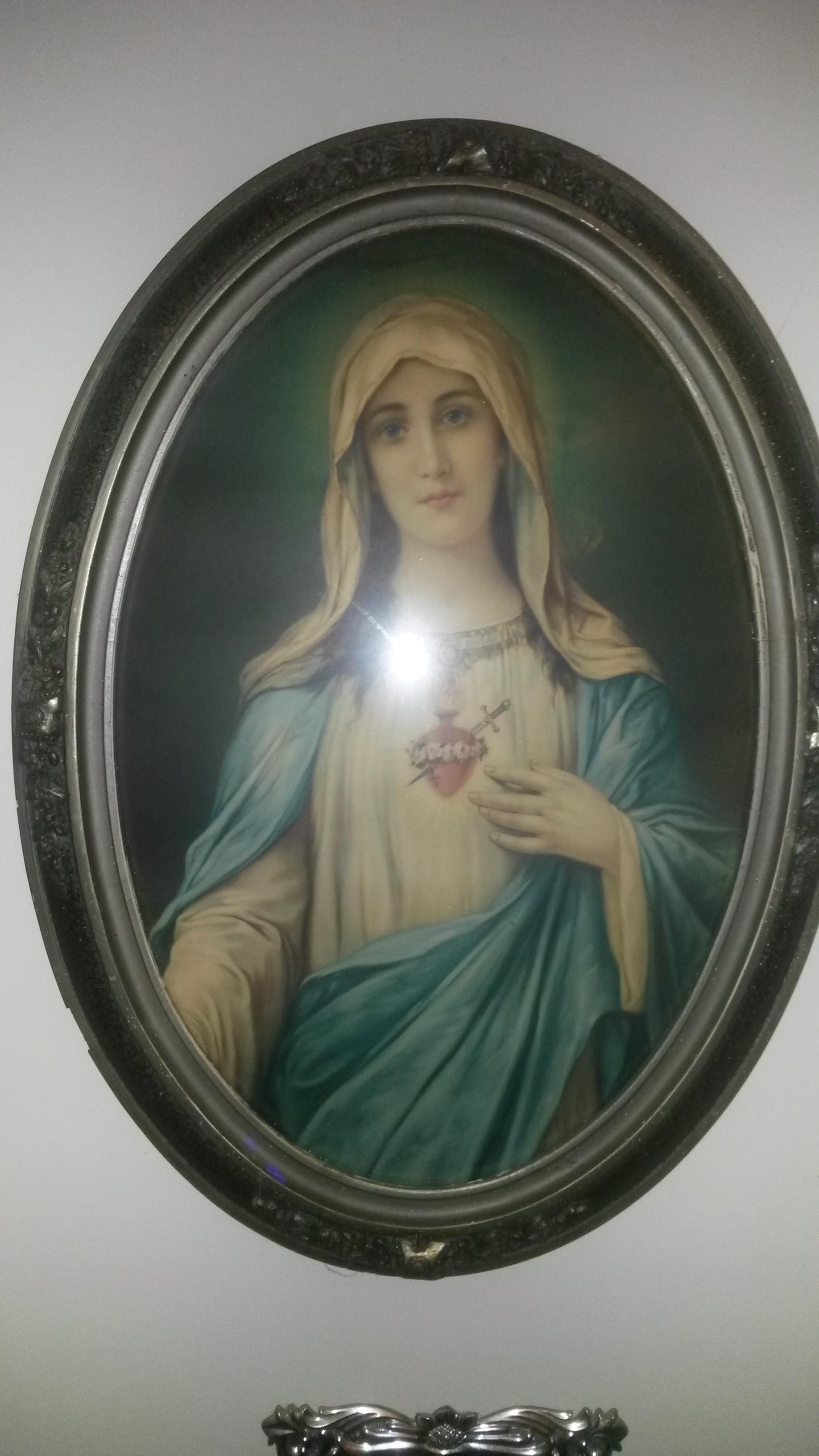 Beautiful picture of Mary very old not sure of date but has been passed down 3 generations. Frame is hand carved. Glass is bubble glass. Just a beautiful picture.