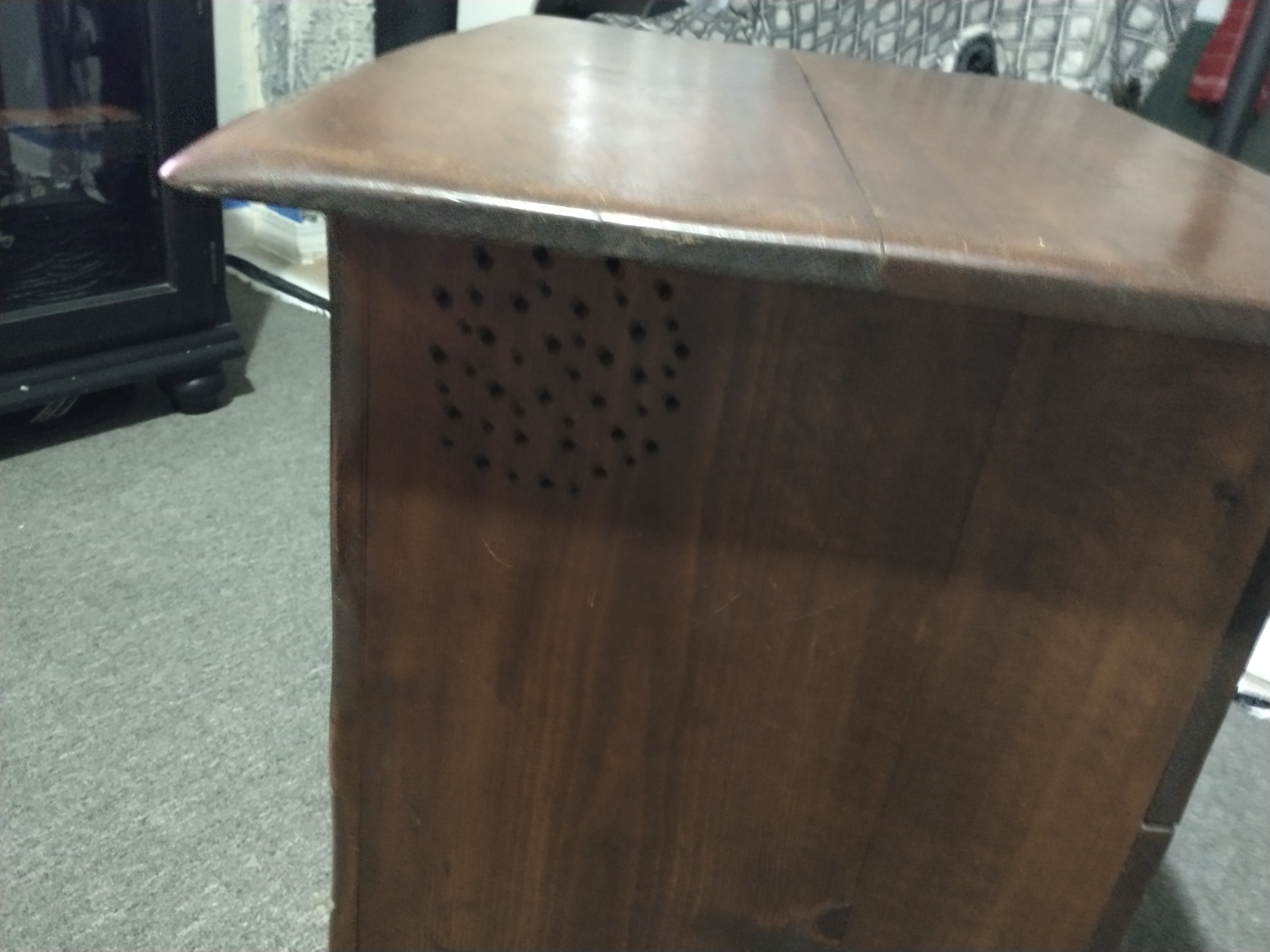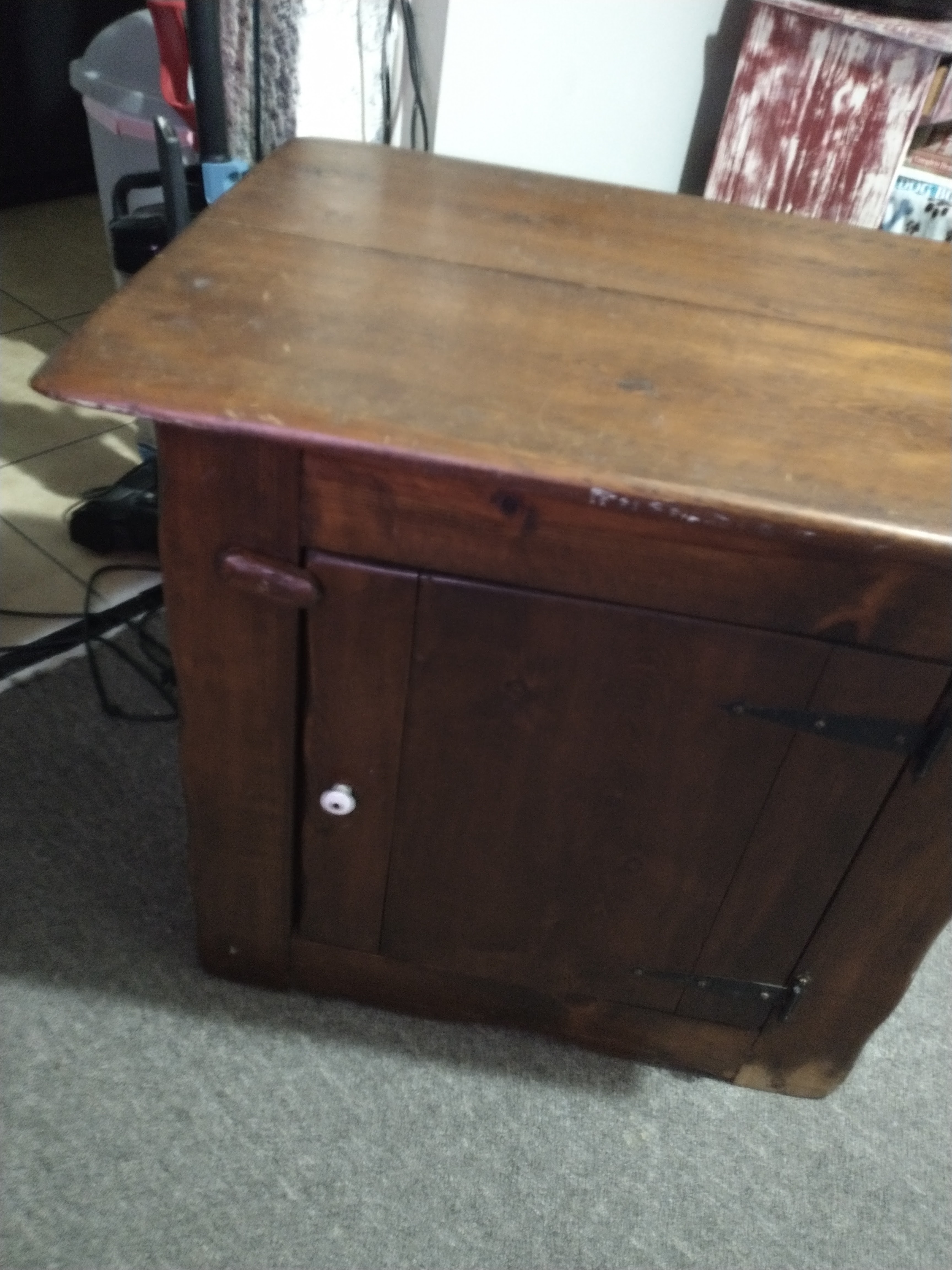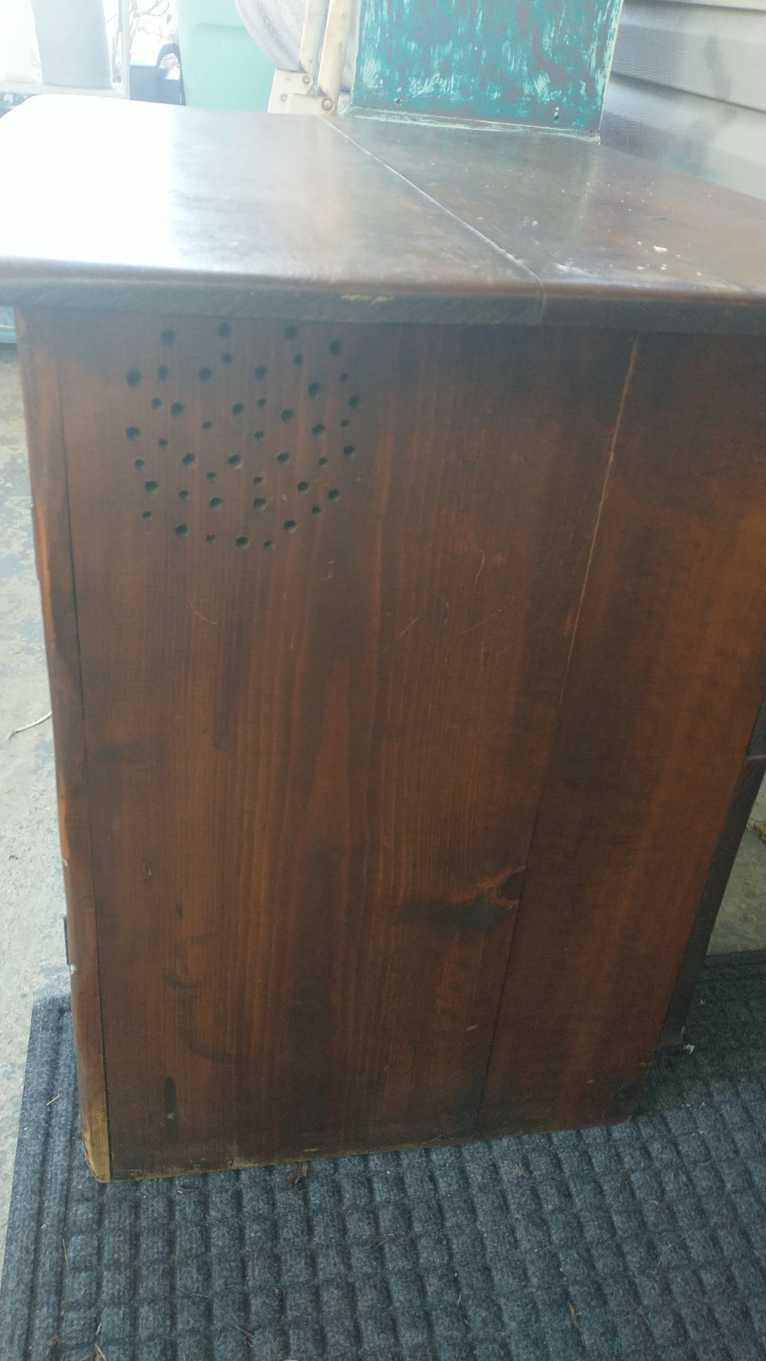 It is made of walnut,it has a bunch probably 20 small holes in a circle on both sides at op corner it looks like a cupboard or end table it's old iv been told it's a antique pie safe at the local antique stores nearby it's 28 inches tall 32 inches long with a depth of 22 inches