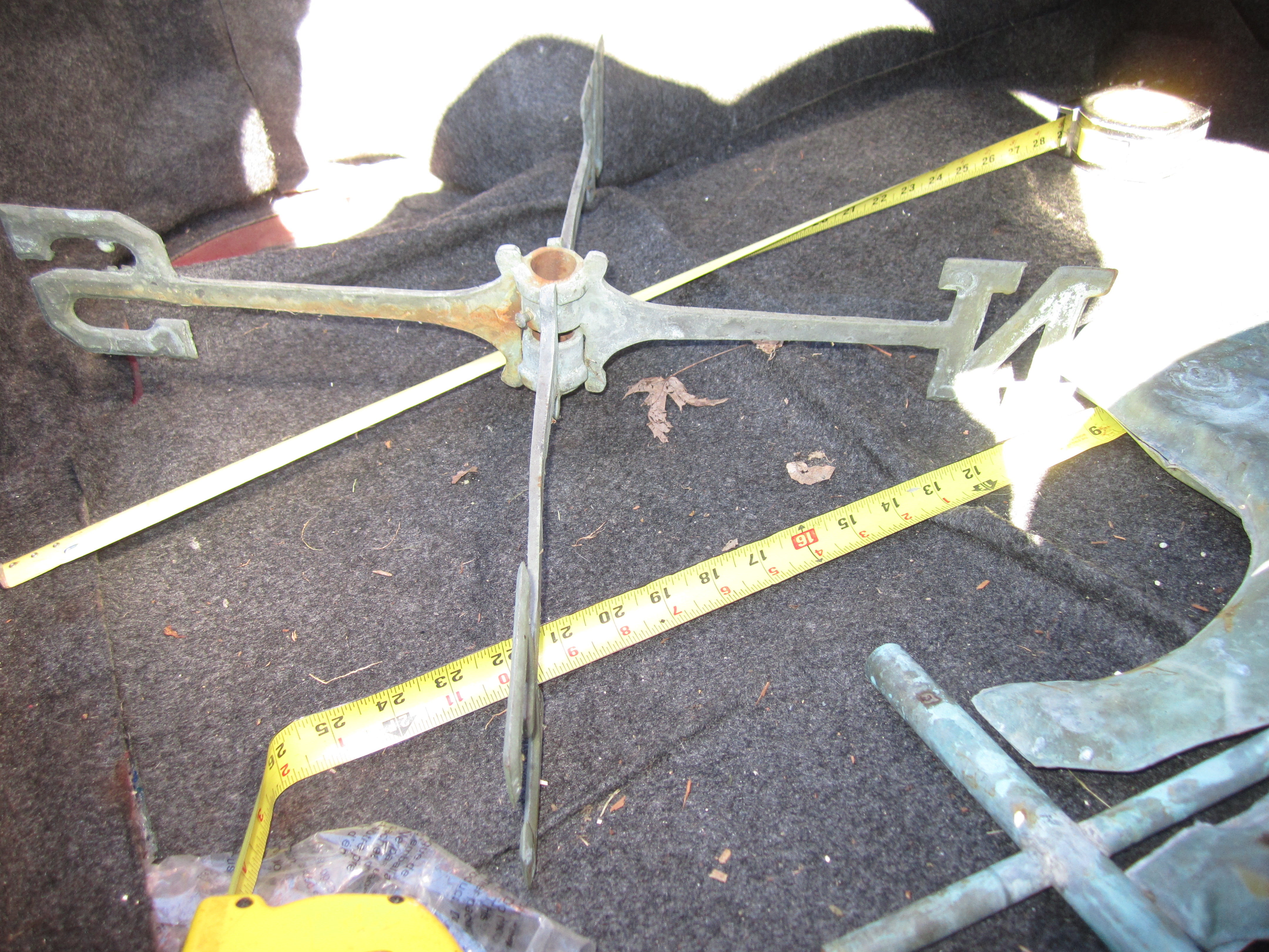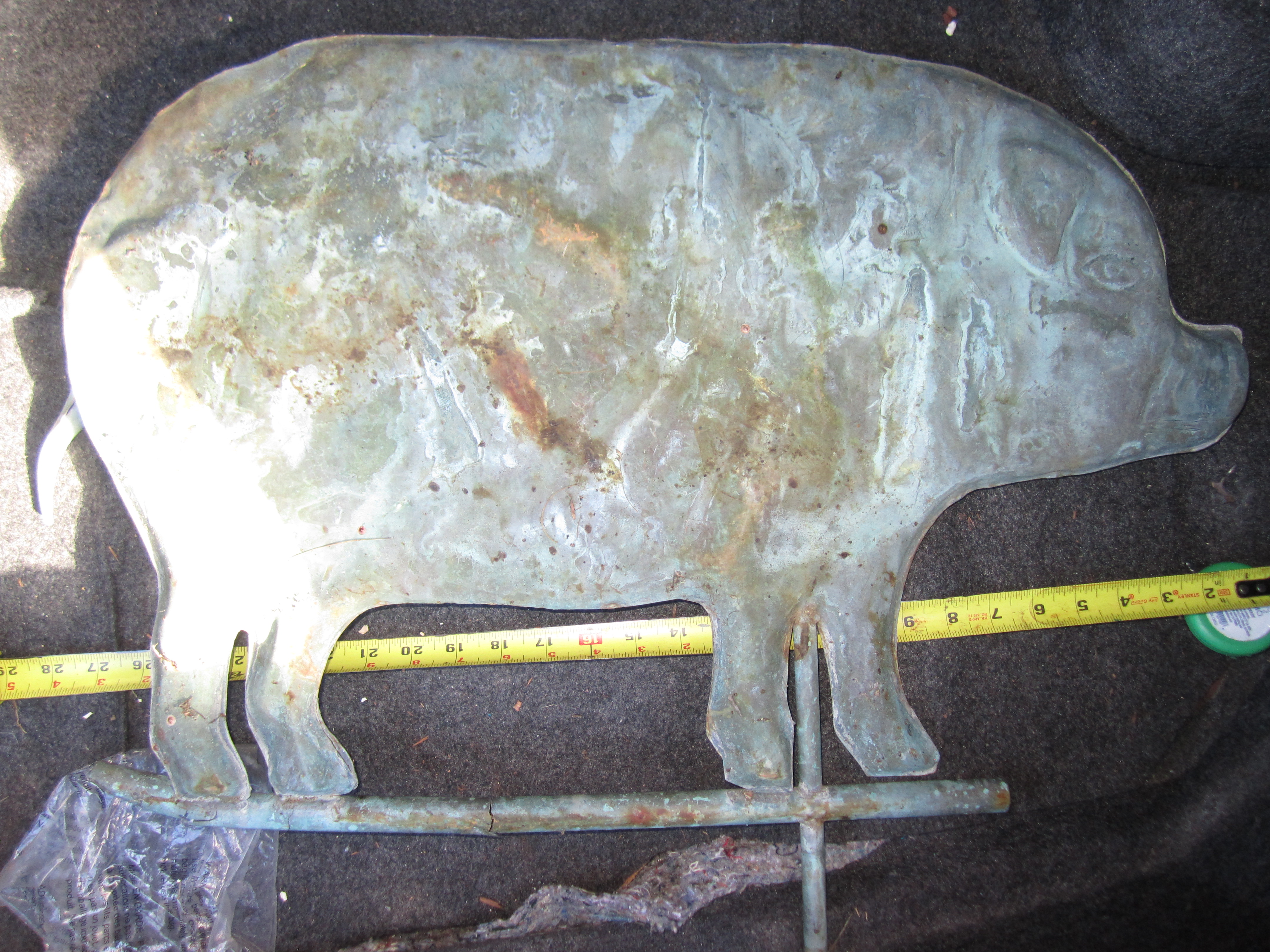 Antique pig weathervane from NH barn. I think its copper. Please see pictures. Unknown age. We are still looking for supporting rod The pig is 27" long 20 tall and the nsew directional is 21"