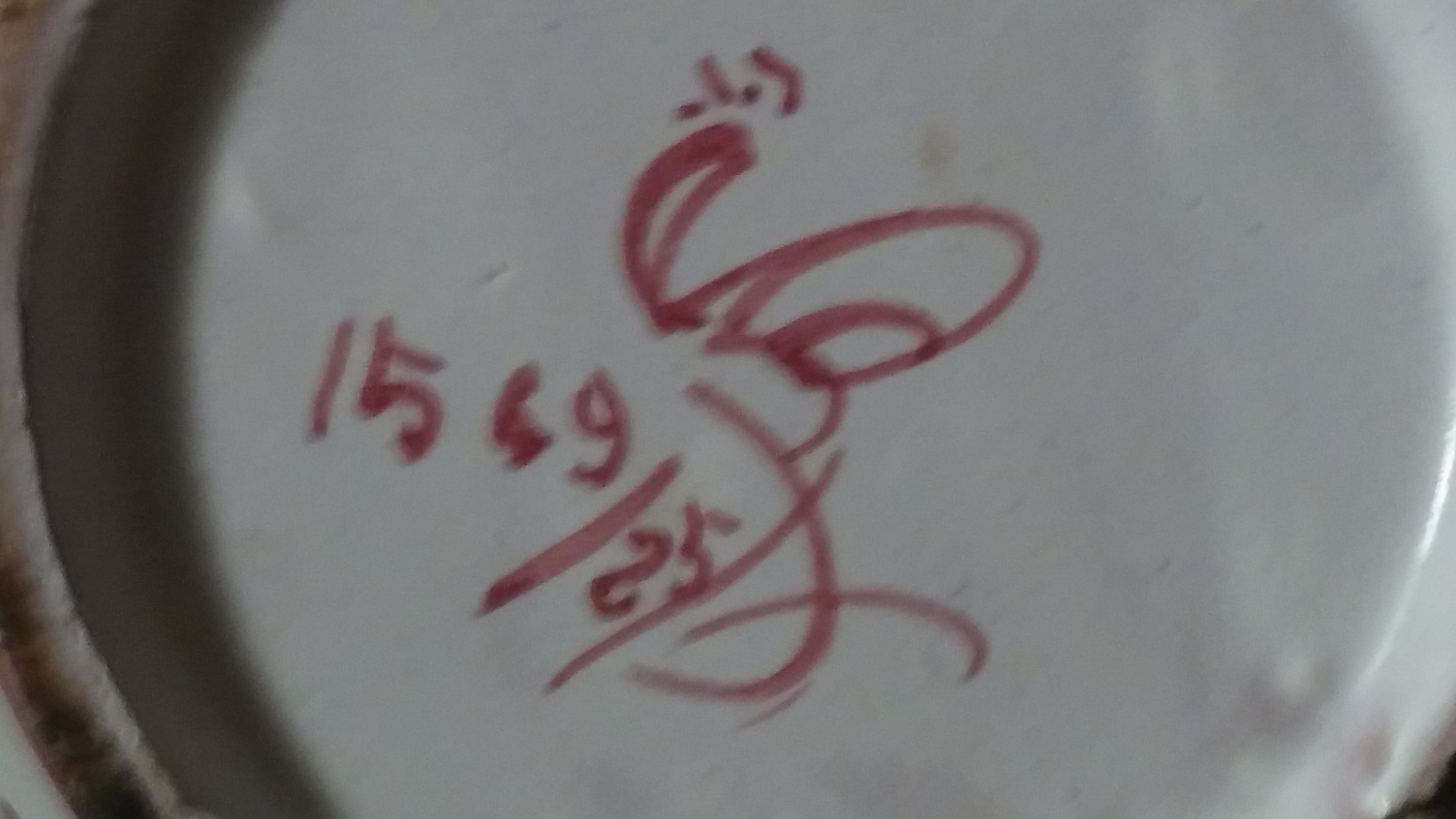 The pitcher is white glazed with red hand painted art work on the sides. There is a painted signature and numbers on the bottom. On one side is a person that looks like he talking to the heavens and on the other side is a caslte. Miscellaneous birds, flowers, and trees.