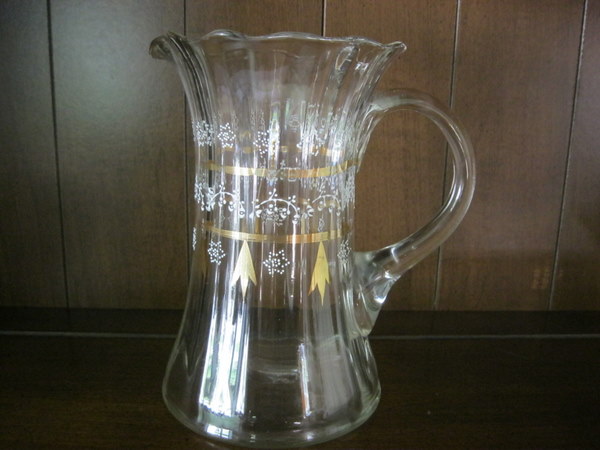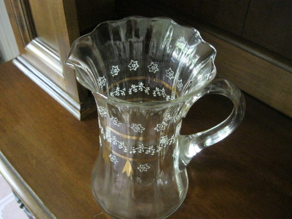 This pitcher has a scalloped edge on top with a gold and white hand painted design. It came from my great-grandmother who was married in 1899 in New York. It was thought to be a wedding gift, but we're not sure. It is in excellent condition. Any information about this piece would be appreciated.