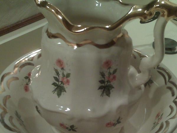 it has2 thick rings of gold trim around the top of both pieces, Off white in color with sets of 3 victorian style, long stem pink roses, each at a different stage of bloom (pitcher). the bowl's gold trim works around the inner edge in a kind of hump pattern (2 rings) and a ring of a single rose bloom with stem and leaves (all the flowers have green stem and green leaves)