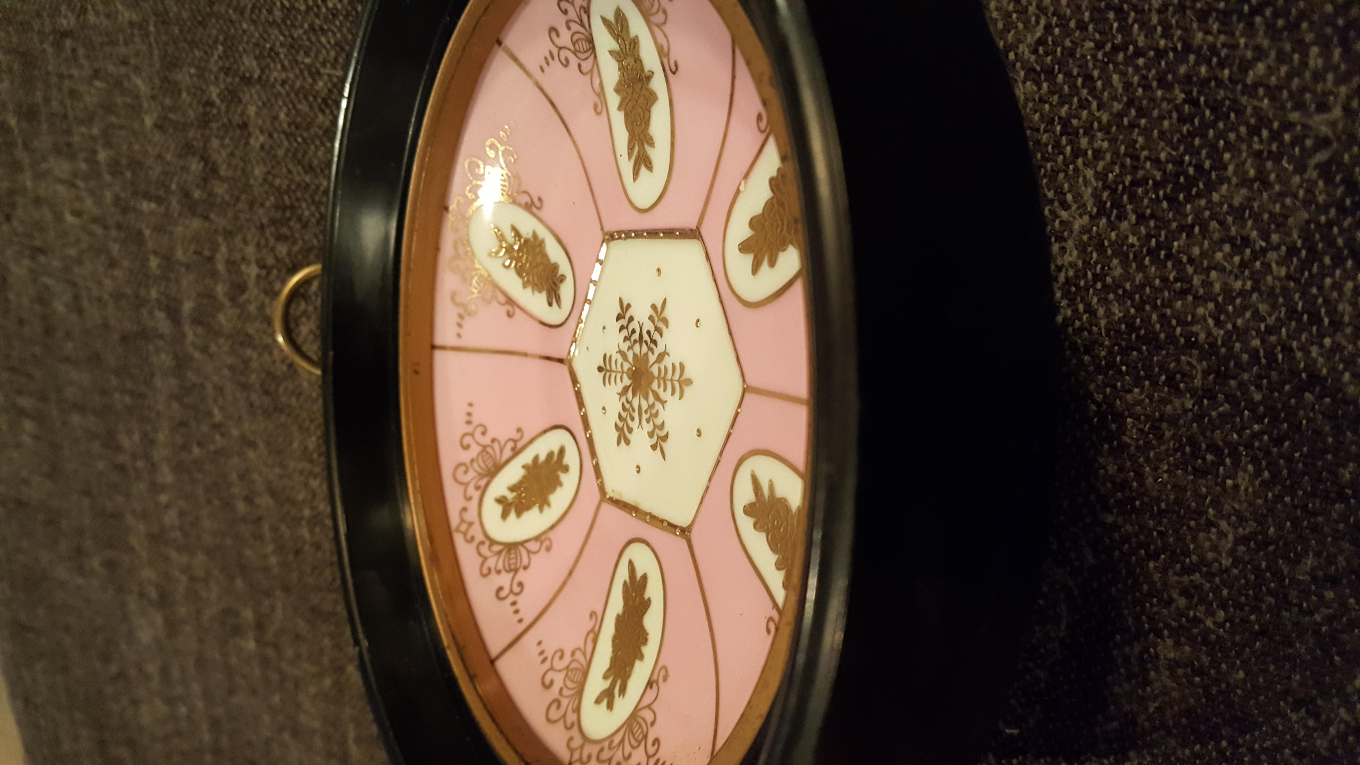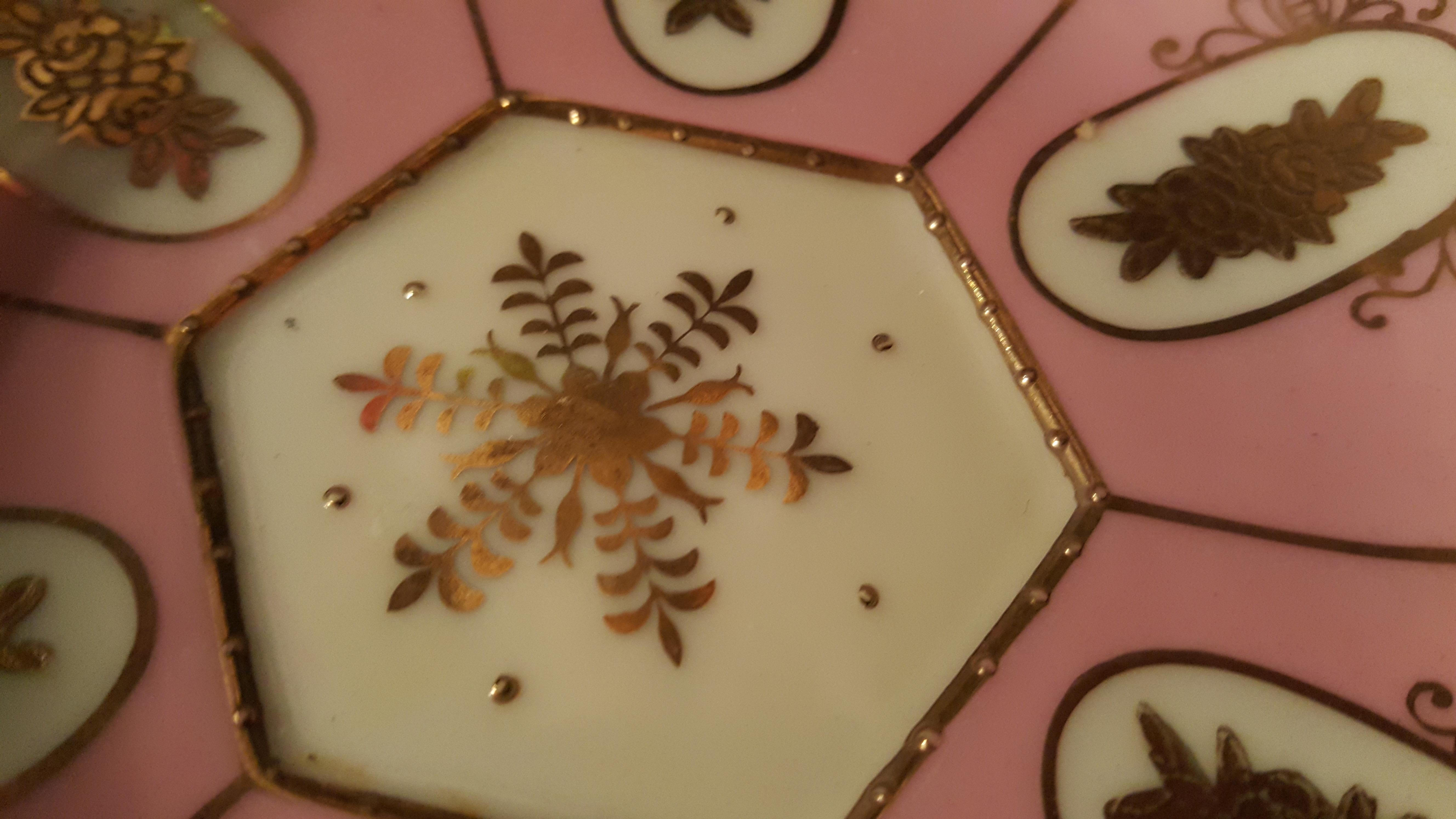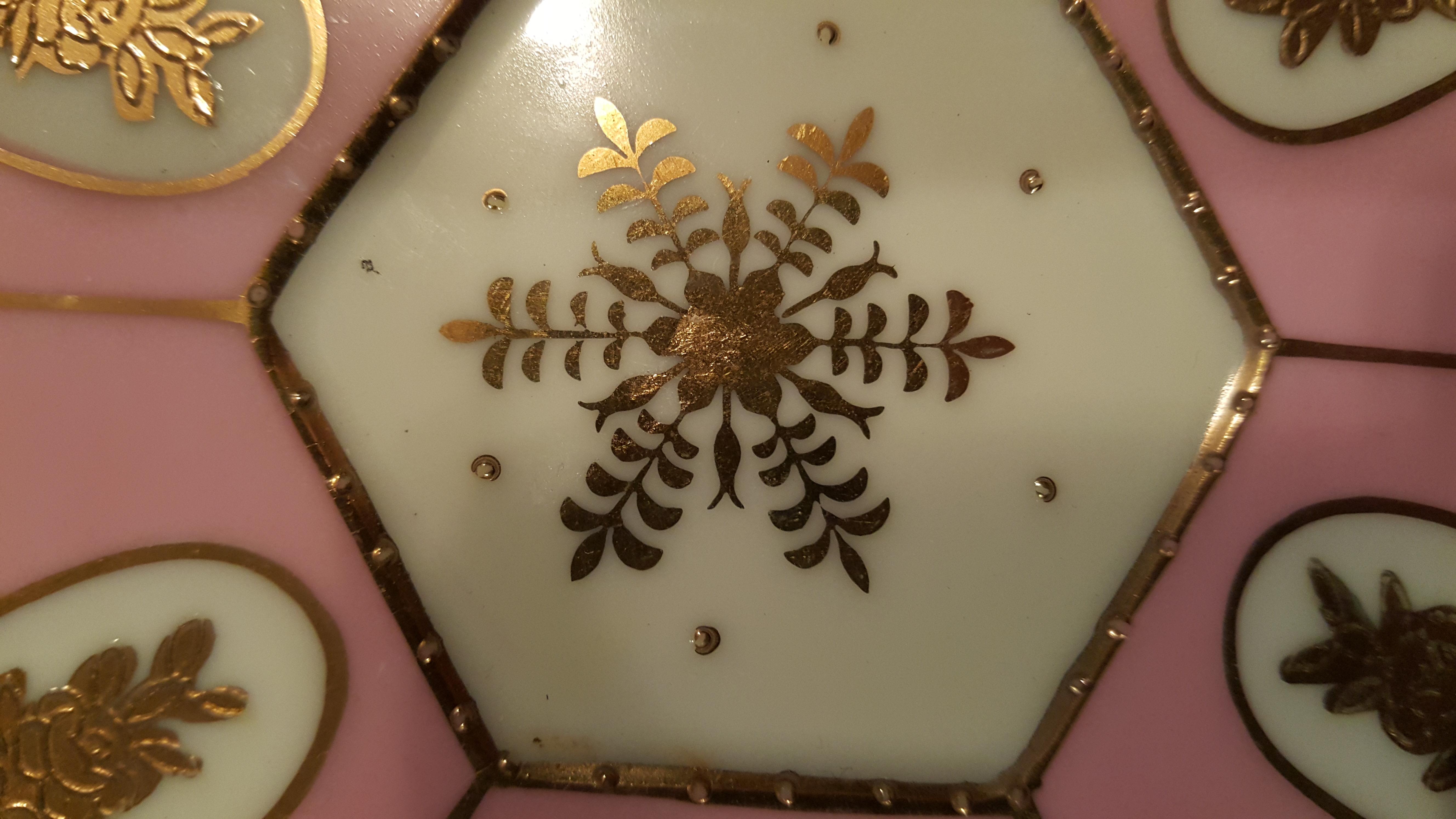 This is a 7 inch round plate indented to a point where it is almost bowl like. Outer areas of plate are pink with gold colored sections and the center portion that is white is indented. There is AA 6164 A printed on the back.