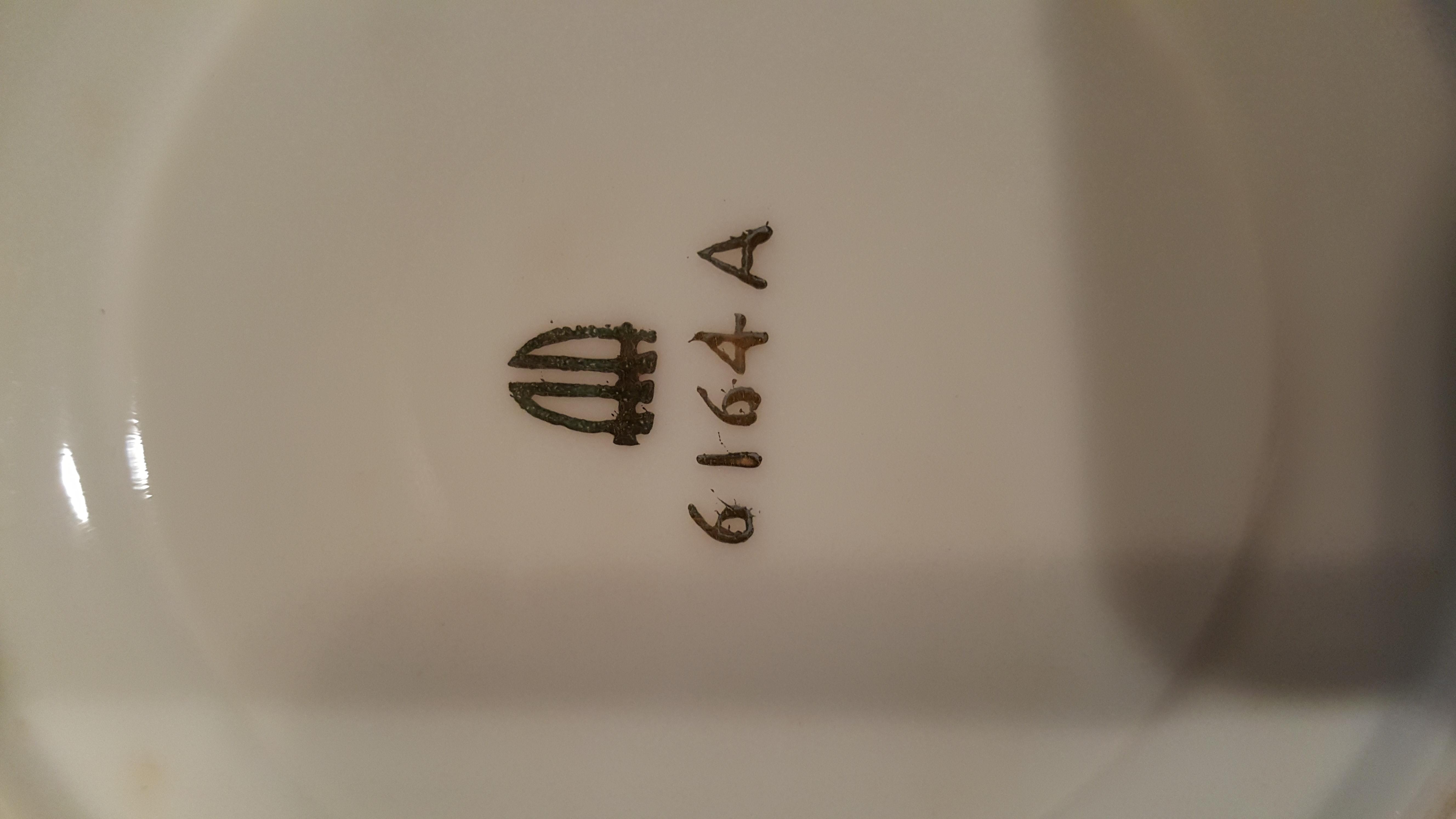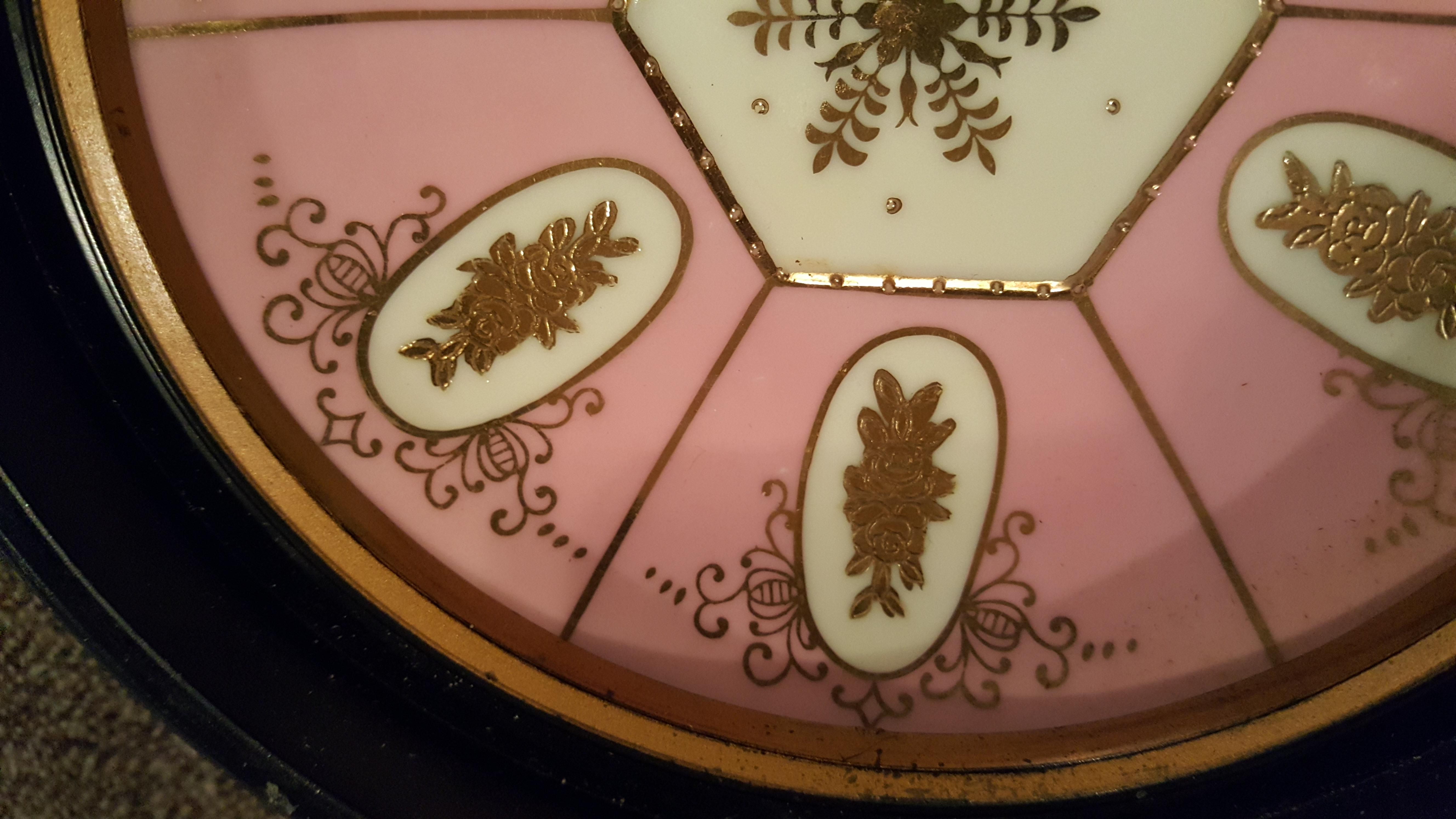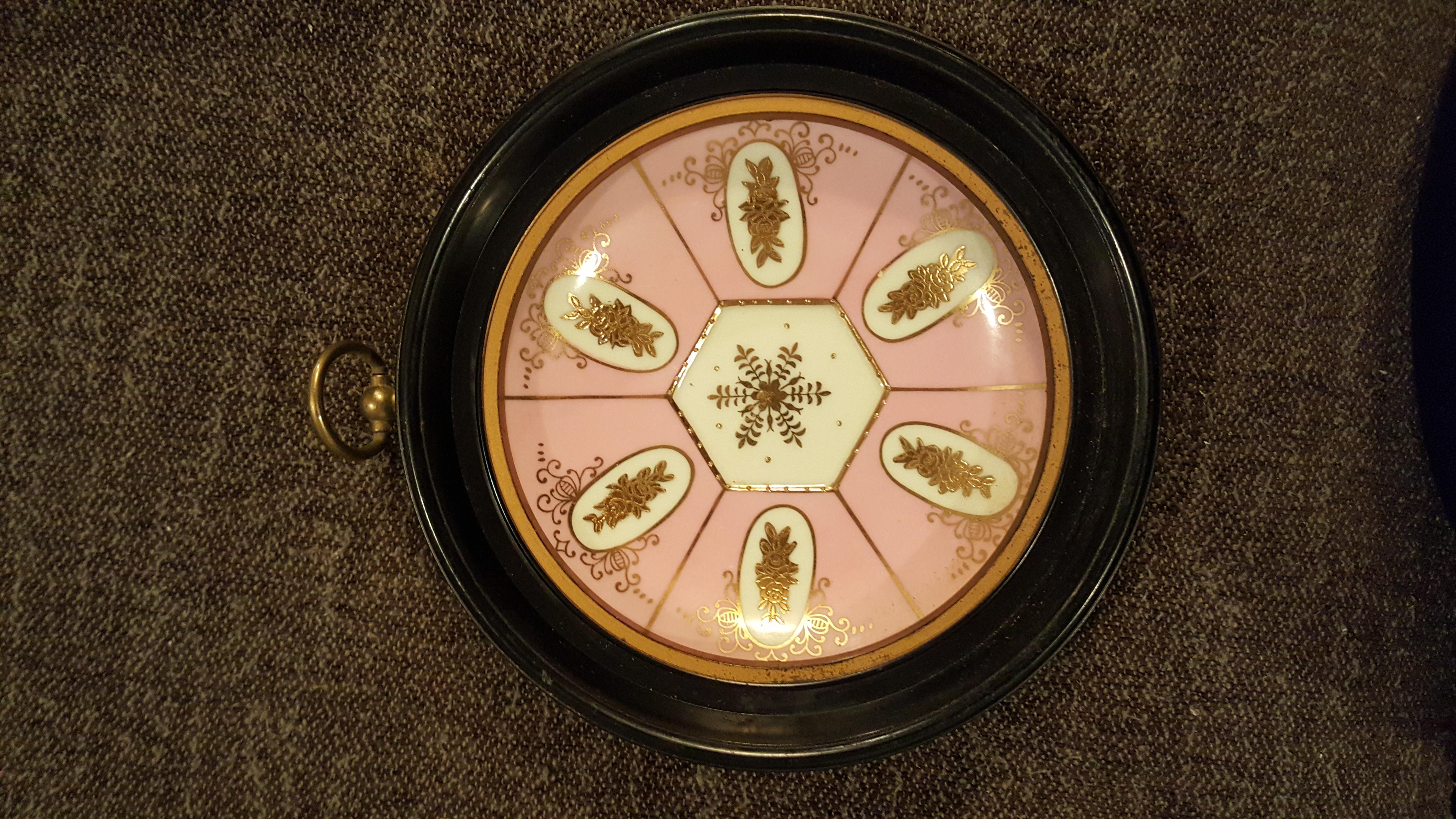 This is a 7 inch round plate indented to a point where it is almost bowl like. Outer areas of plate are pink with gold colored sections and the center portion that is white is indented. There is AA 6164 A printed on the back.