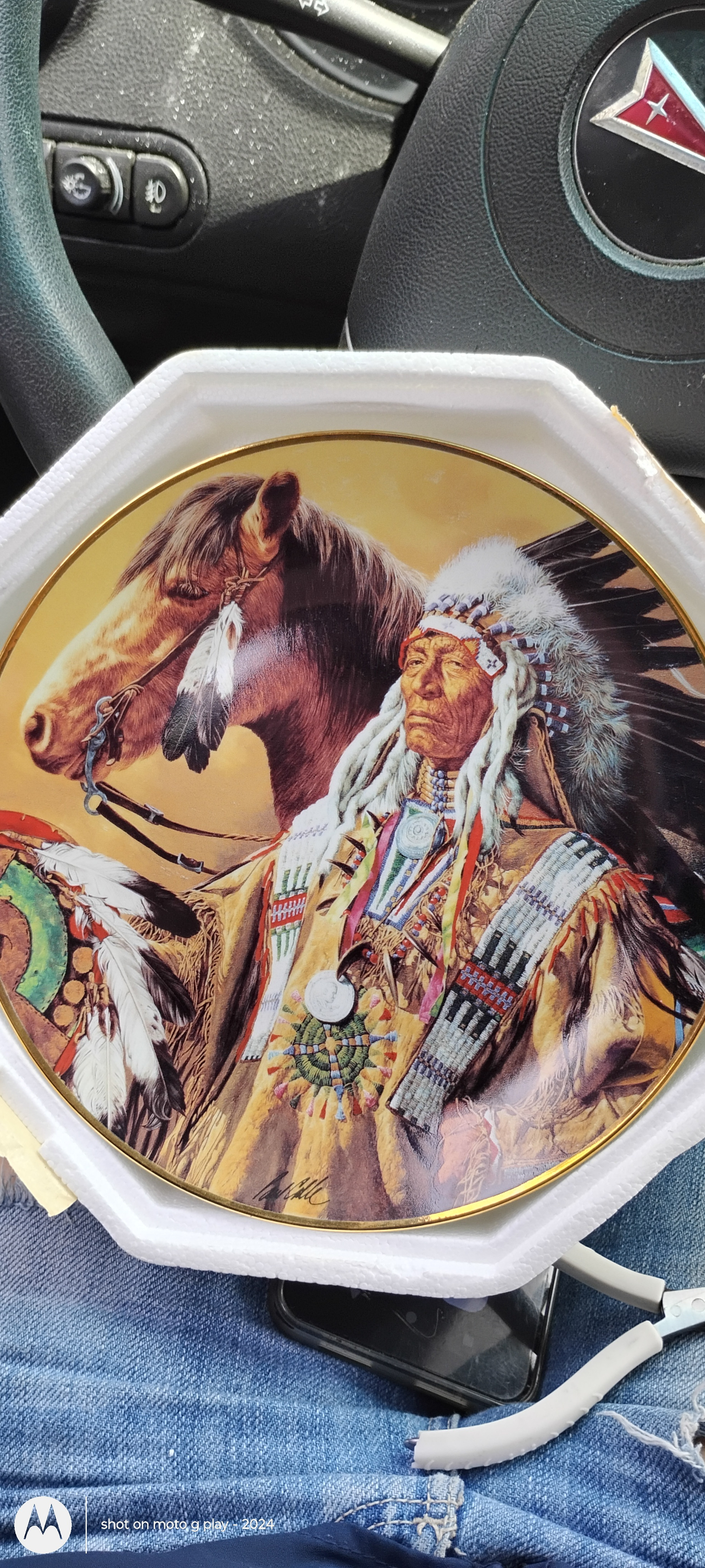 This is a decorative limited-edition porcelain collector plate titled “Pride of the Sioux” by renowned Western and historical artist Paul Calle. It was produced by The Franklin Mint under the endorsement of the American Indian Heritage Foundation Museum. This plate features a detailed and respectful depiction of a Sioux elder in traditional regalia with a horse in the background. It is part of a numbered series and includes 24k gold trim