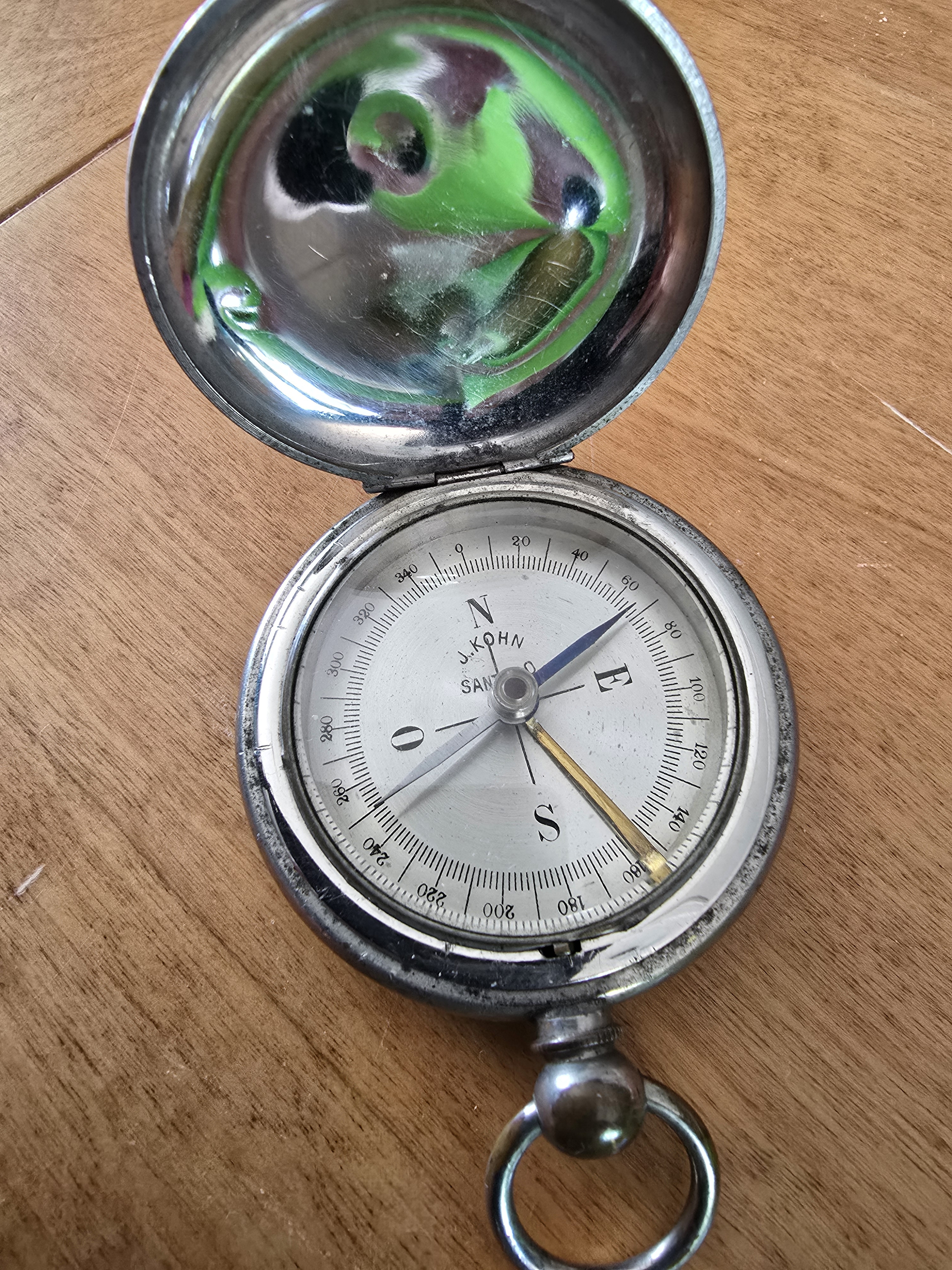 This antique pocket compass marked J. Kohn, Santiago, is a historically significant and likely mid-to-late 19th-century maritime navigational instrument, rare for its Southern Hemisphere calibration and origin. While it shows wear consistent with age, it remains in good collectible condition. It represents a valuable piece of nautical history, especially with its likely sailor/explorer provenance tied to South America.