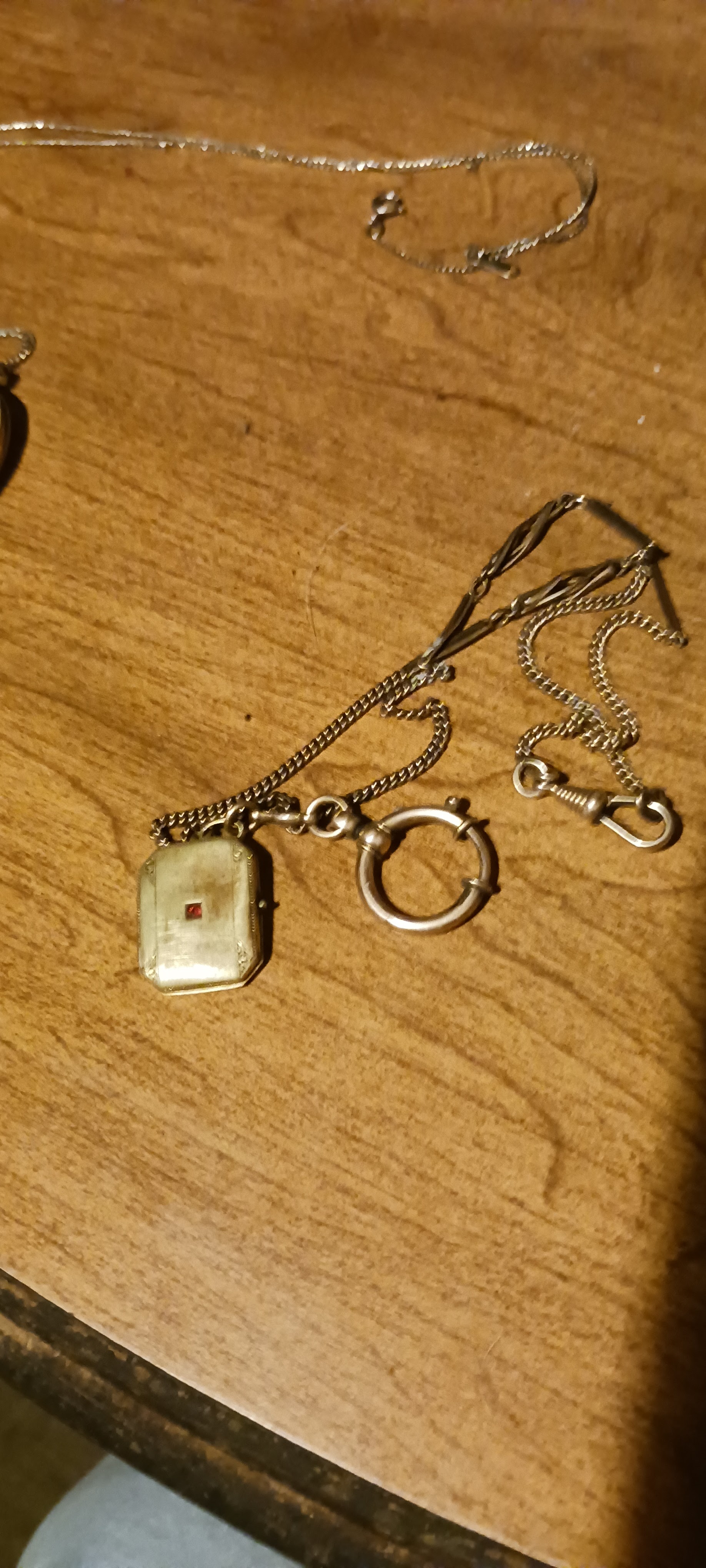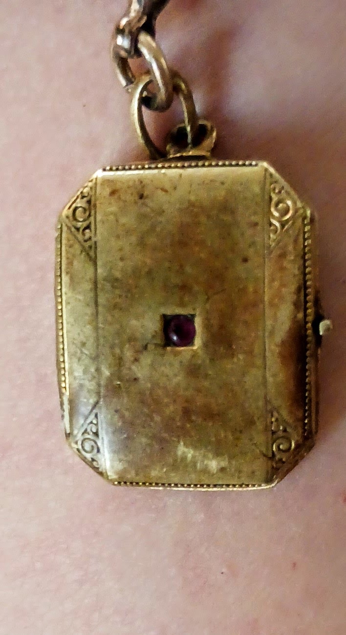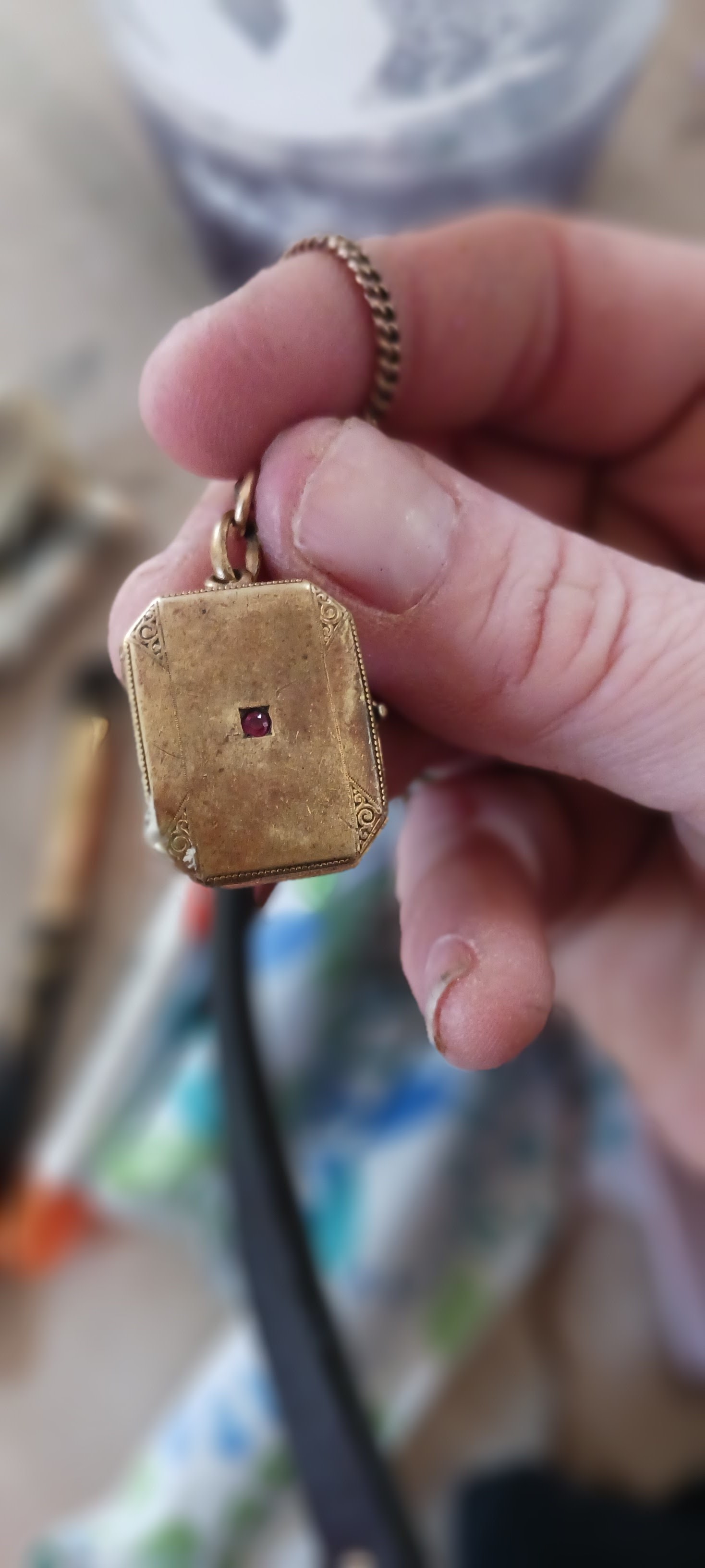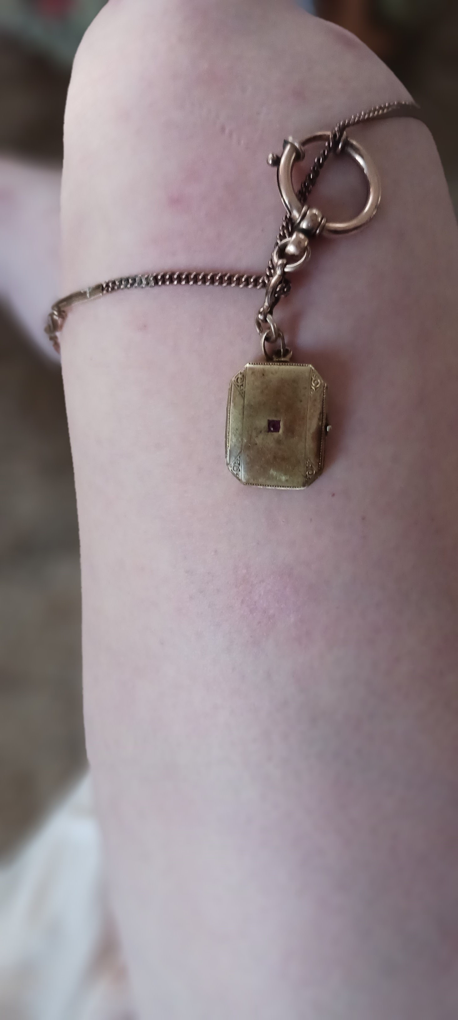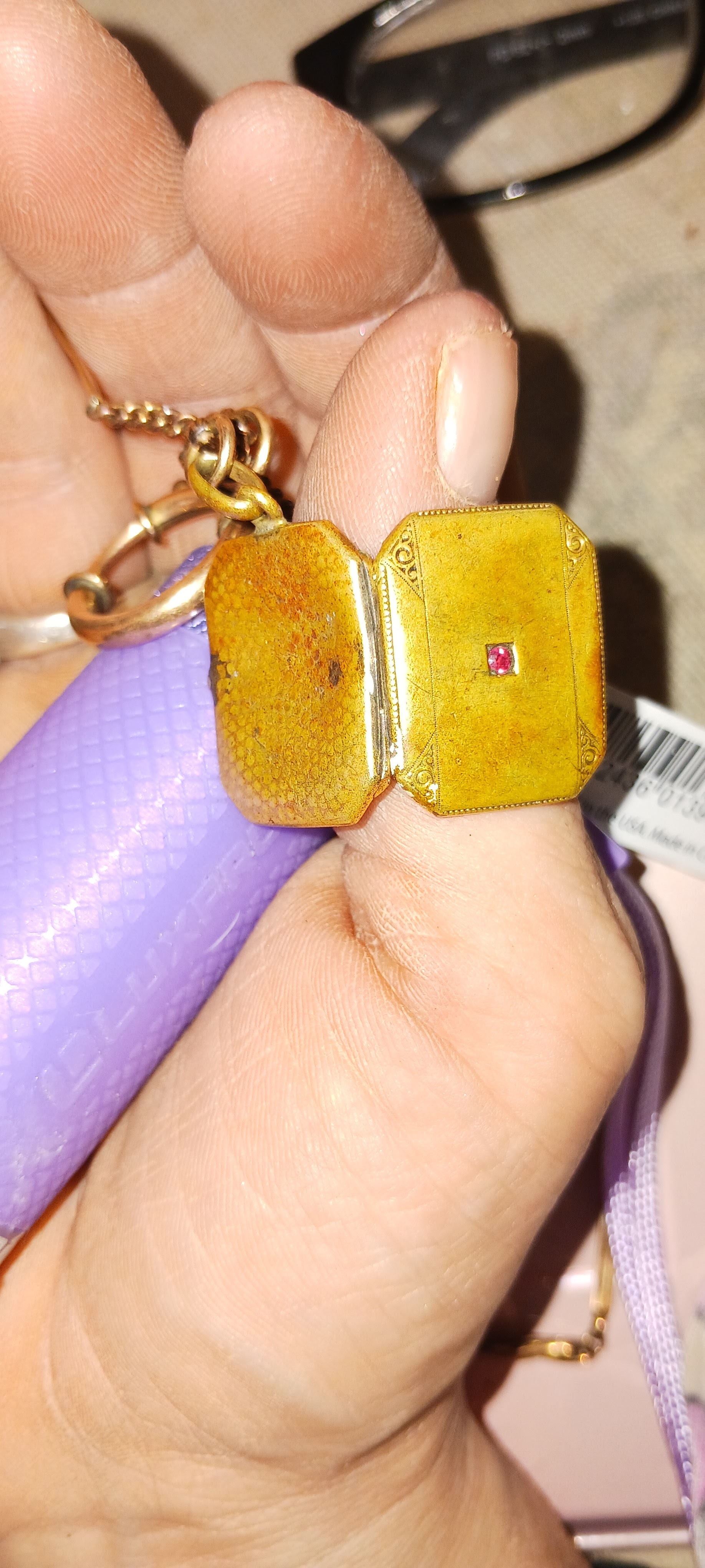 Antique Amerikanier gold ruby pocket locket . Fine hand drawn border. Small red ruby in center of locket. Amerikanier on clasp