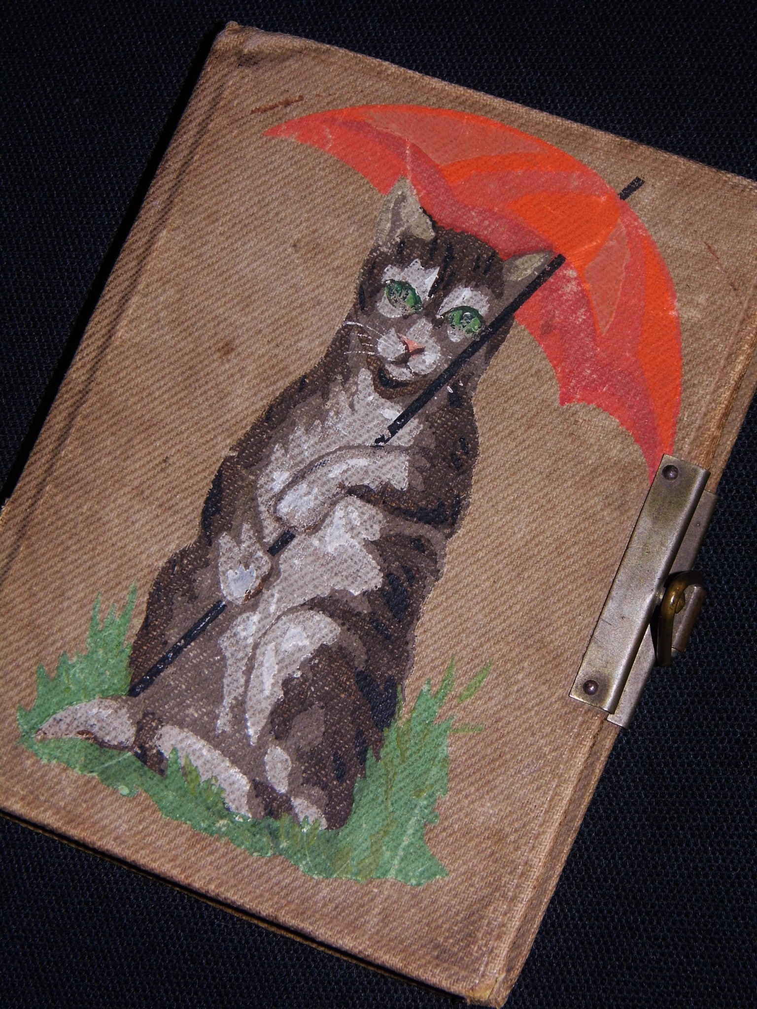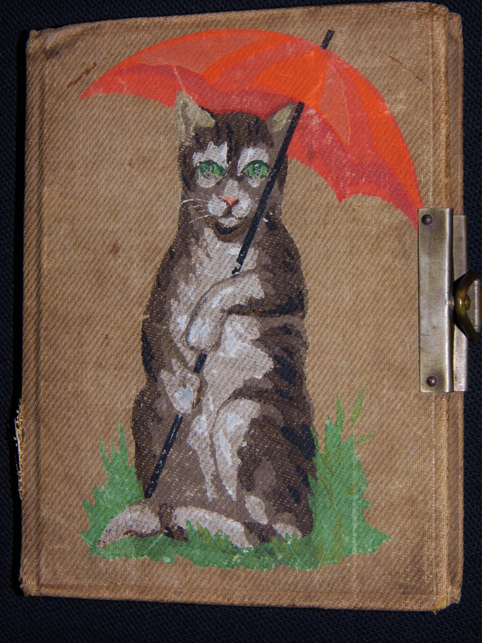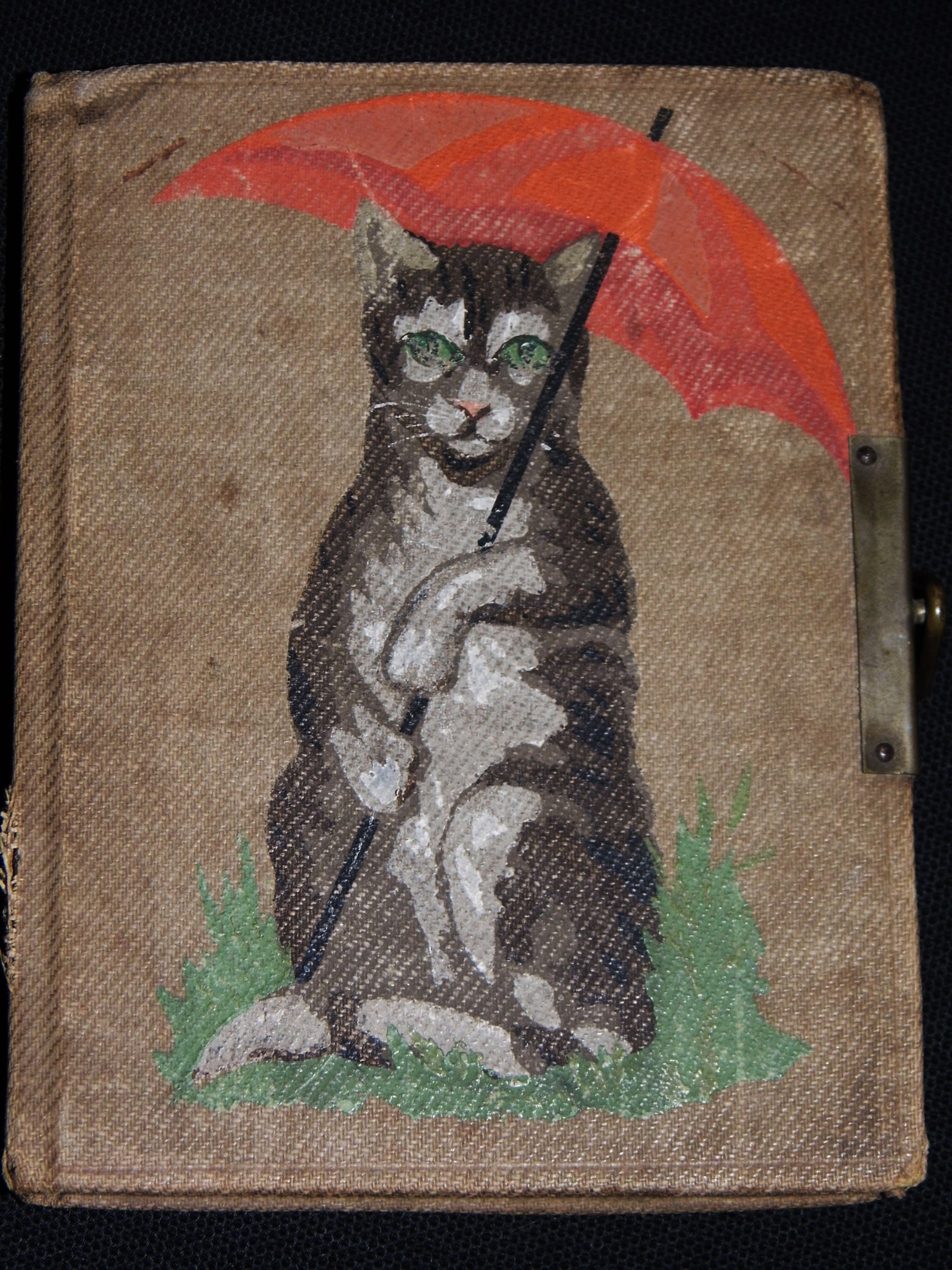 Appraisal required for an antique canvas pocket photo album 13X10cm with a hand painted Cat & Umbrella caricature on cover. Painting reminiscent of the early 1900s British artist Louis Wain who specialised in animal & particularly cats in human poses & quite few with umbrellas. The painting is to the front album canvas cover & although the album is worn the picture is complete & with bright colouring.Found in a dusty english country house attic, nothing is known of this item apart from the date c1920s. The album is empty & is complete with its leaves. Can you help to verify & value?
