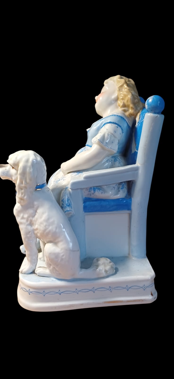 Physical Description: This charming porcelain figure depicts a young girl seated in a chair, accompanied by a dog. The girl has blonde hair and is dressed in a blue and white dress, with delicate floral patterns. The dog is white with a blue collar, adding a touch of color to the piece. The figure is intricately detailed, showcasing the craftsmanship typical of antique porcelain. The base is rectangular, with a decorative border. The dimensions are approximately 8 inches tall and 5 inches wide.