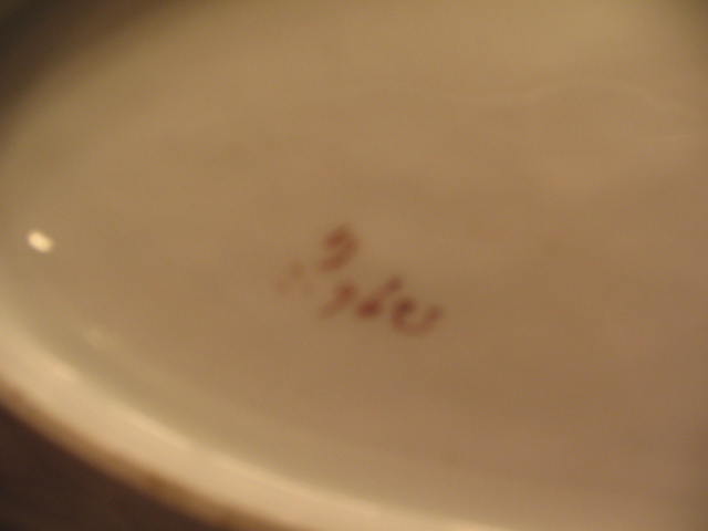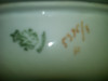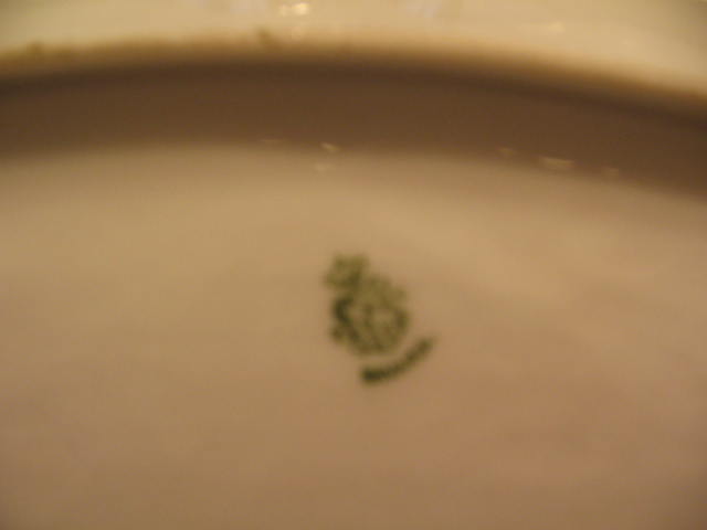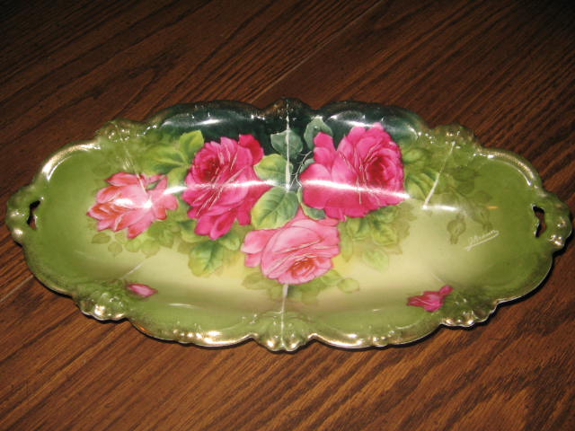 Very pretty oval serving bowl. Porcelain, green with pink flowers, trimmed with gold around top edge.  The bowl has worn places and 2 small cracks that can only be seen from underneath.