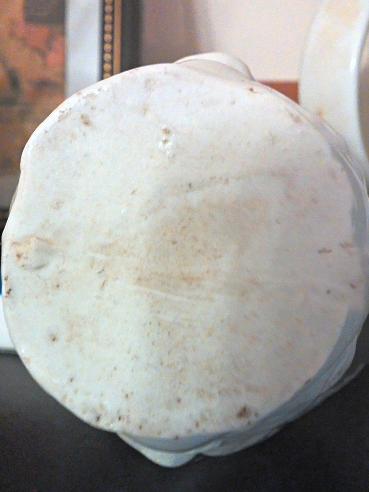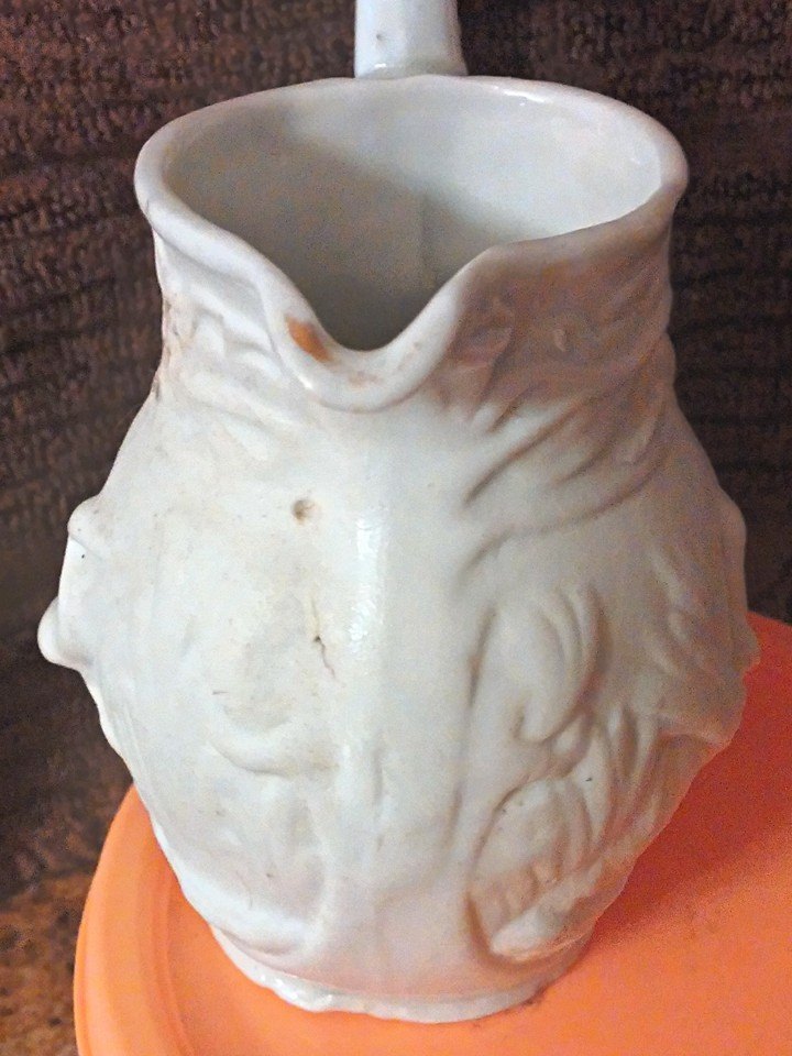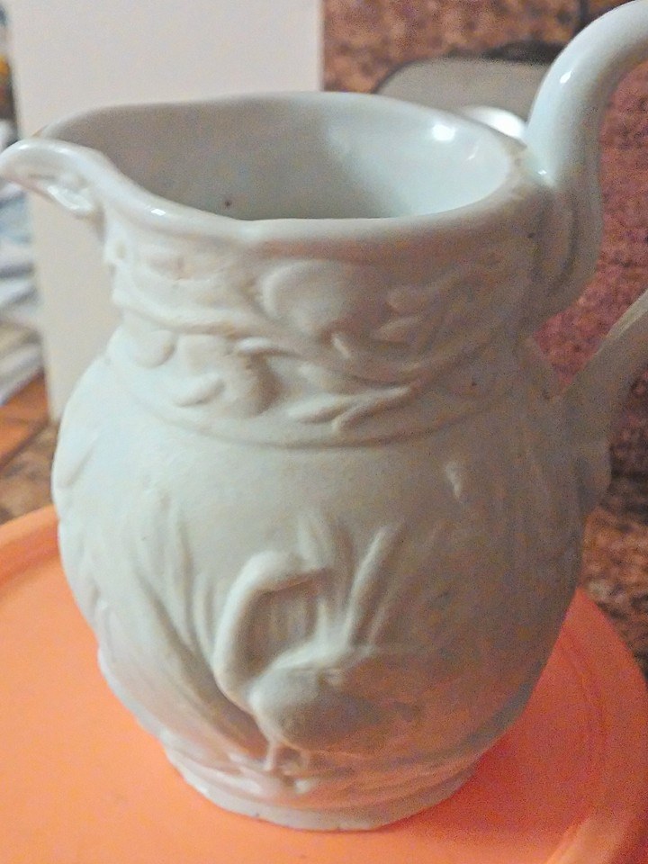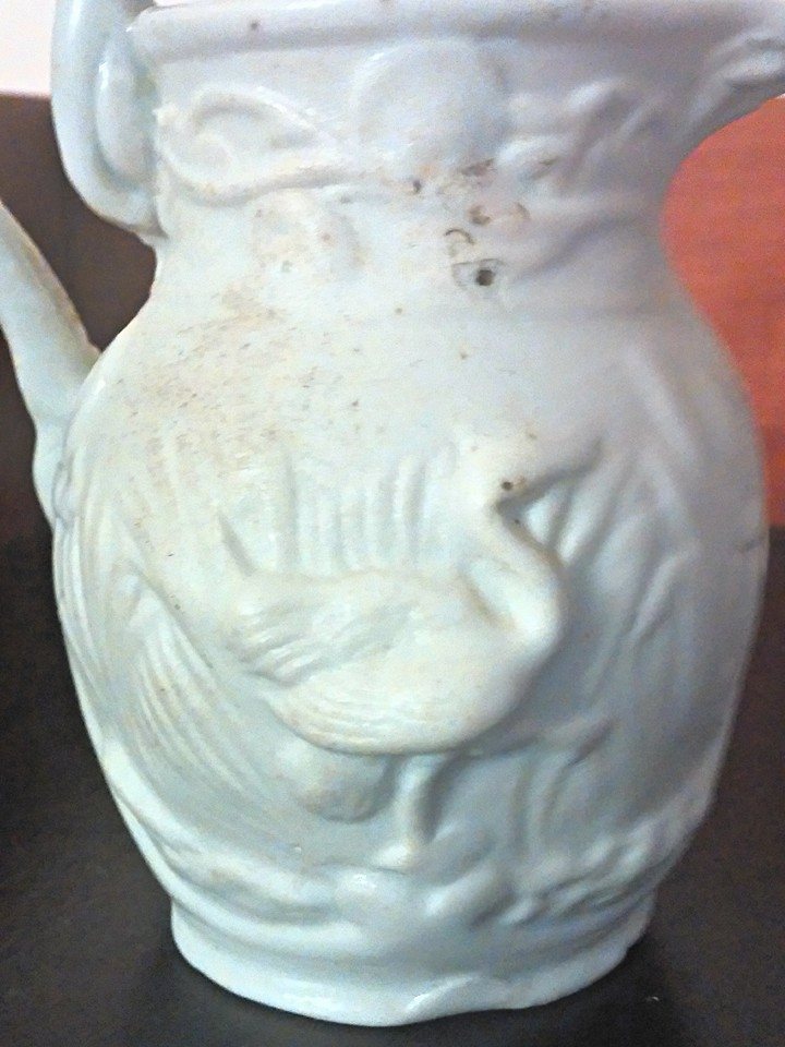 I have a porcelain creamer that belonged to my great grandmother. It is a little over 3" tall, white, and on each side of the creamer is a stork or crane,( I think ) each in a different standing pose with tall grass or reeds behind it.The bird and grass stand out from the creamer,as well as the vine around the top and the design on bottom which the stork is standing on. Along the spout there is a bit of gold,not sure if it once lined the top but has worn off.There is no mark or date as you can see from thepicture of bottom and none inside the creamer or handle either. It also looks as though there are seams where the creamer may have been joined together and in the insideof the creamer there are several "freckles" or maybe air bubbles which have discolored over time