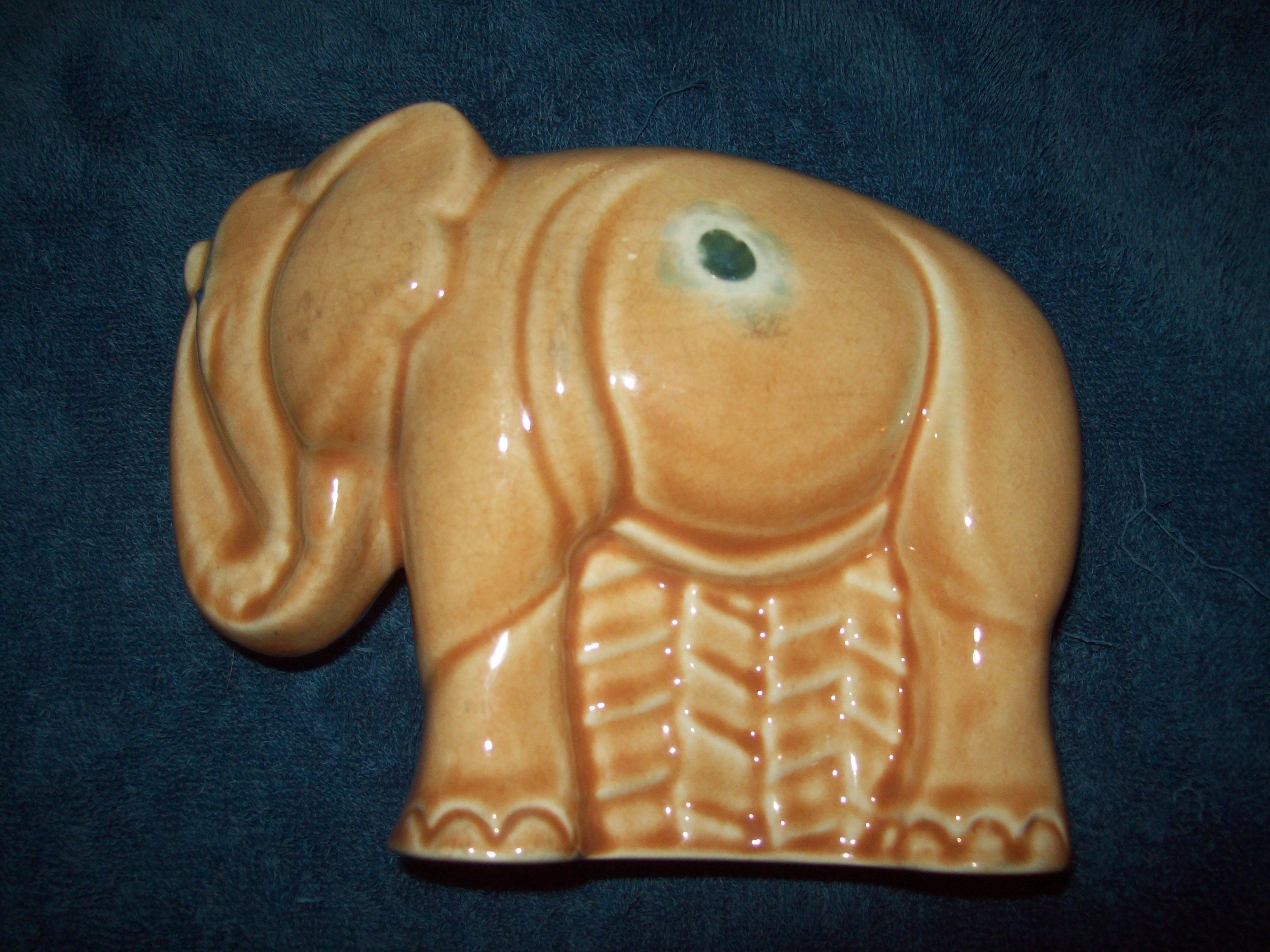 it is a tanish or gold color..it has one green (glass or jade) eye and the same material about dime size spot on one of its sides that is the only markings on it