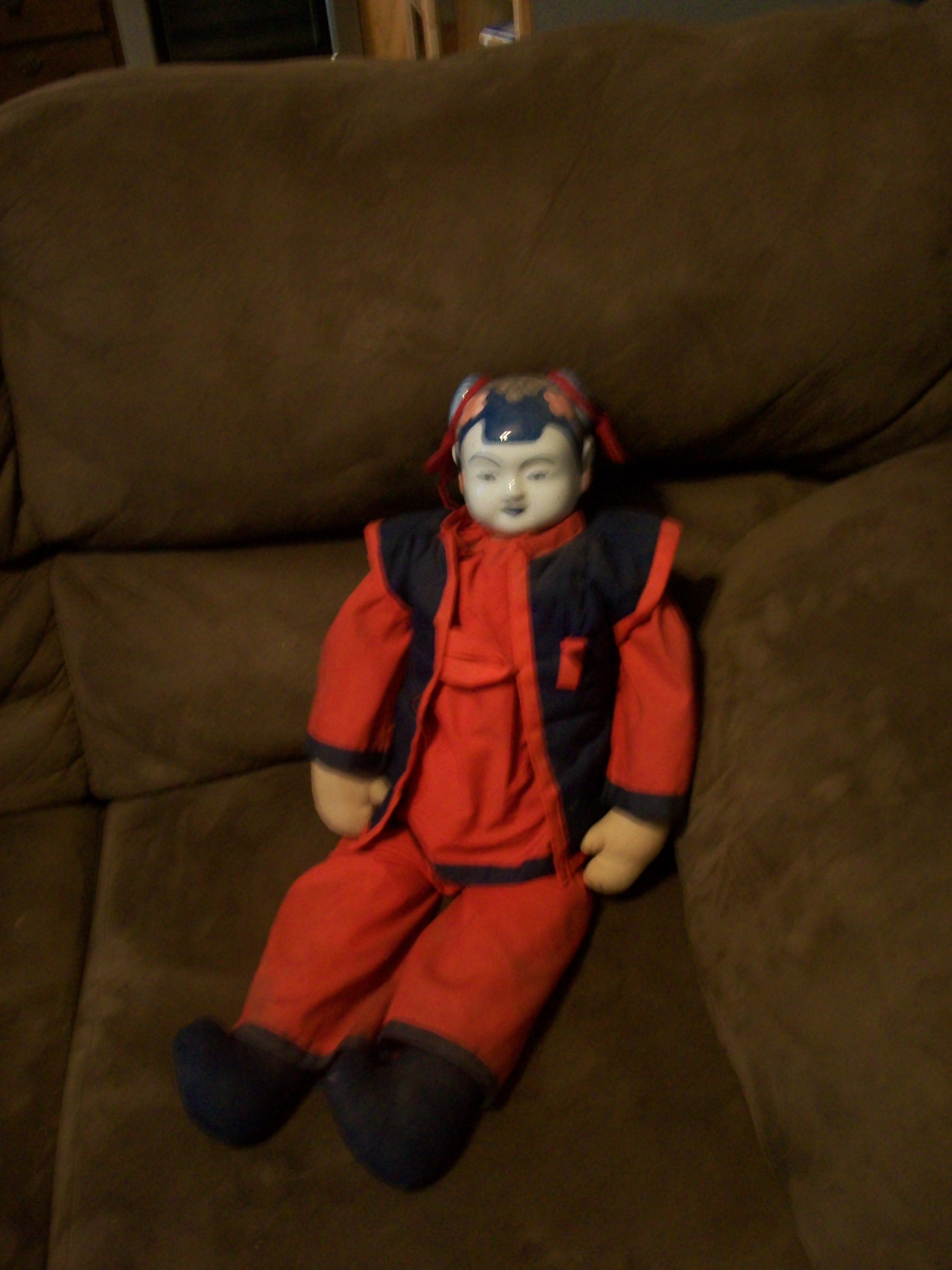 I don't have mych information about this doll. It appears to be an oriental male. It has a porcelain head and is dressed in blue and red. I don't find any distinguishing marks or signatures.